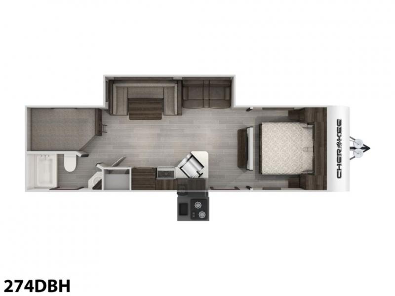 Are you ready to get away from the hustle and bustle of life? Come enjoy plenty of rest and relaxation when you choose to camp with this single-slide Cherokee travel trailer. There is plenty of room for your whole family from the private bedroom with wardrobes on either side of the queen bed to the rear set of double-size bunks. Enjoy dining, visiting, or playing games at the U-shaped dinette which can transform into an extra sleeping space at night. The rear bathroom features a tub where you can easily clean up after playing outdoors, and you will also find that this model features double entry doors for your convenience!