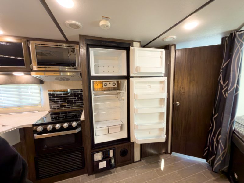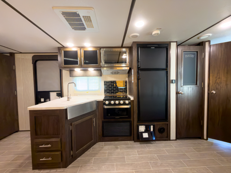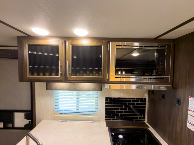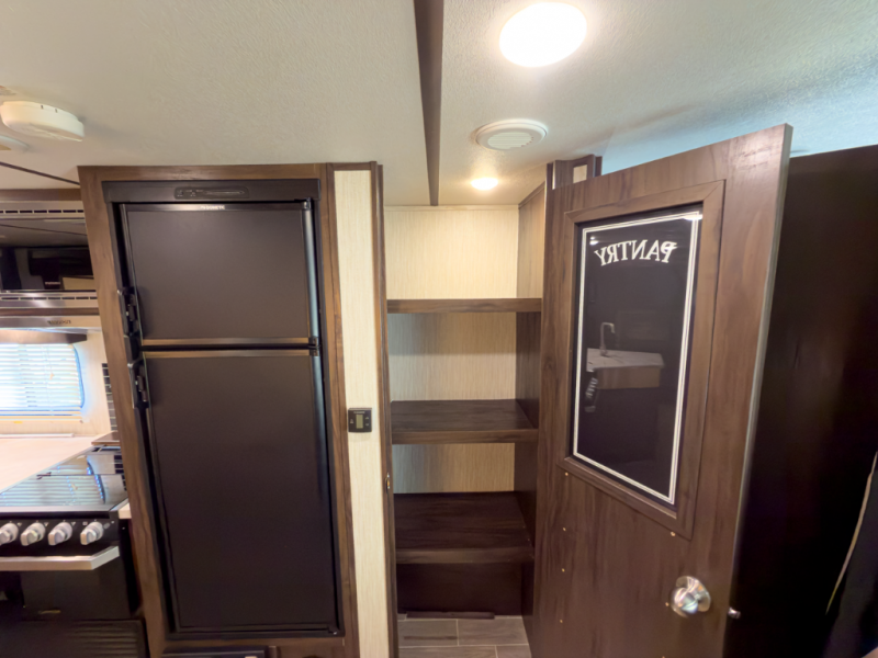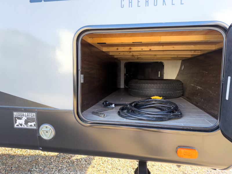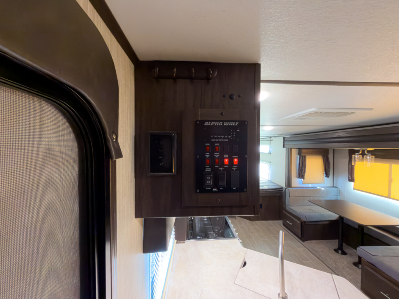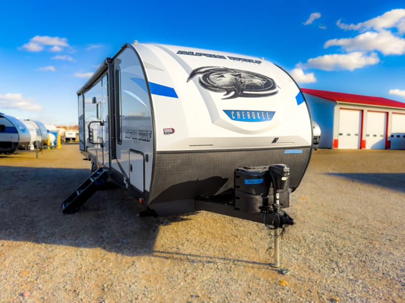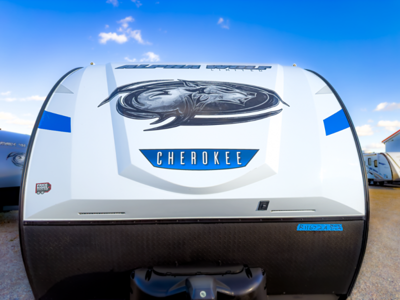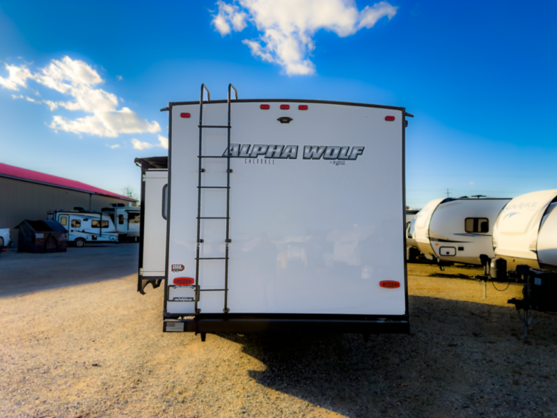 The Cherokee Alpha Wolf travel trailer is the first of Cherokee's line up to be fully laminated, which makes it lightweight, well insulated, and able to provide a sleek and modern exterior. The tire pressure monitoring system and exterior shower with hot and cold water add to the usefulness and value of the Alpha Wolf, and the LED lighting on both the exterior and interior delivers a bright and cheerful atmosphere no matter what time of day it is. Inside of the Alpha Wolf you will find blackout kitchen appliances in the kitchen and plenty of storage for your pots and pans underneath the sink.