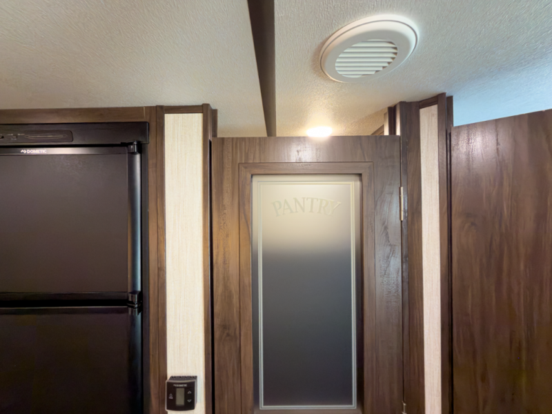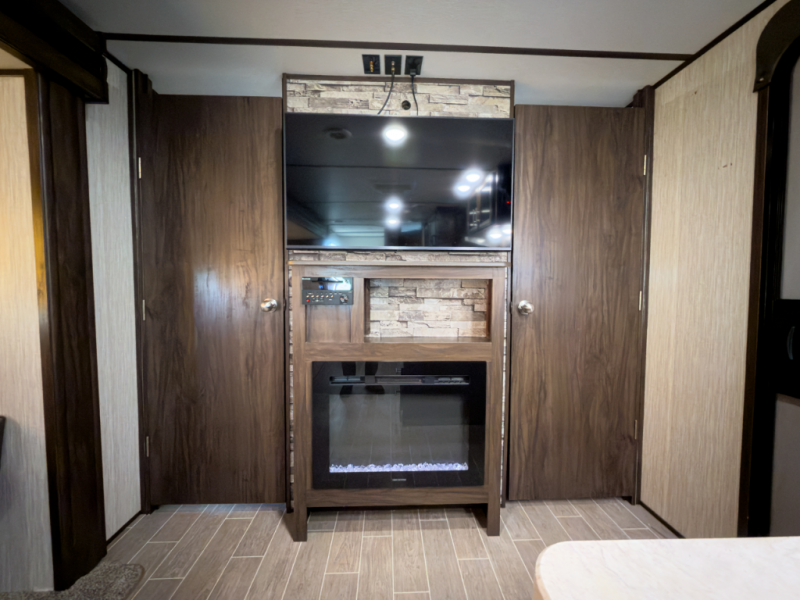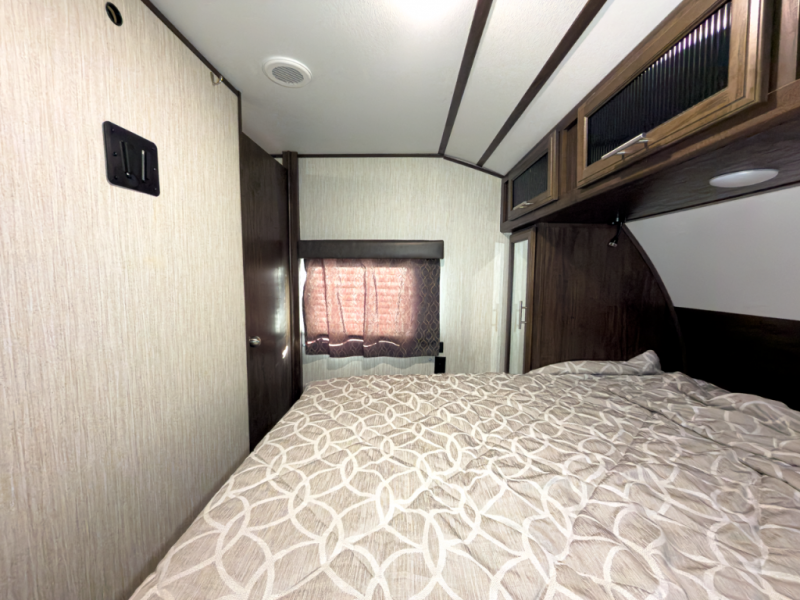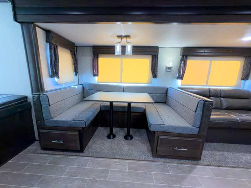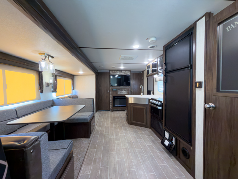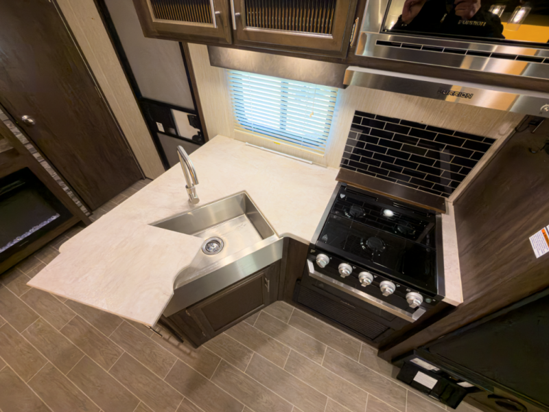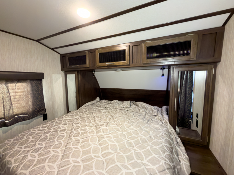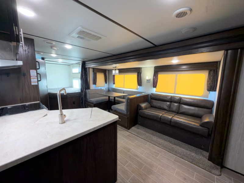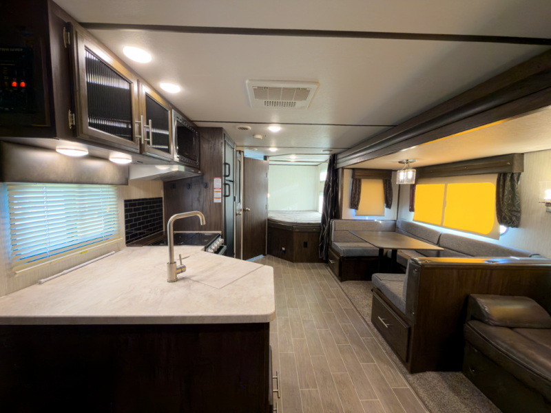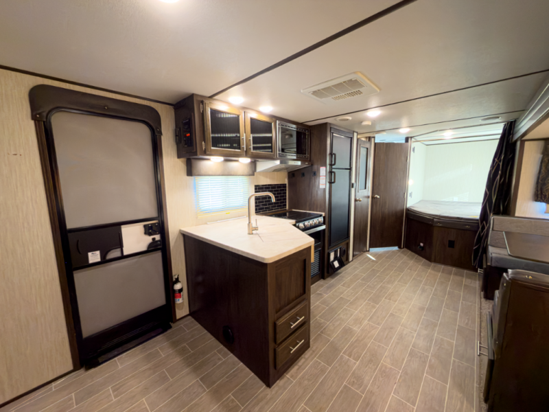 The Cherokee Alpha Wolf travel trailer is the first of Cherokee's line up to be fully laminated, which makes it lightweight, well insulated, and able to provide a sleek and modern exterior. The tire pressure monitoring system and exterior shower with hot and cold water add to the usefulness and value of the Alpha Wolf, and the LED lighting on both the exterior and interior delivers a bright and cheerful atmosphere no matter what time of day it is. Inside of the Alpha Wolf you will find blackout kitchen appliances in the kitchen and plenty of storage for your pots and pans underneath the sink.