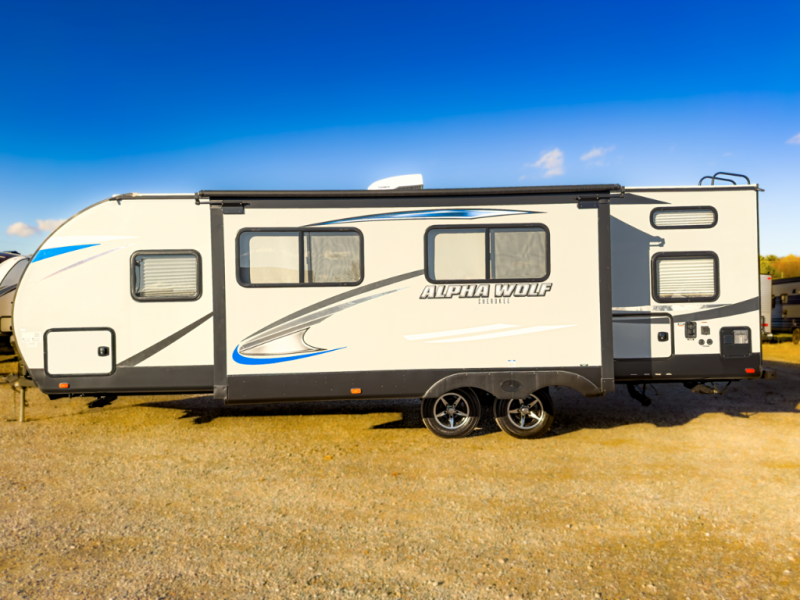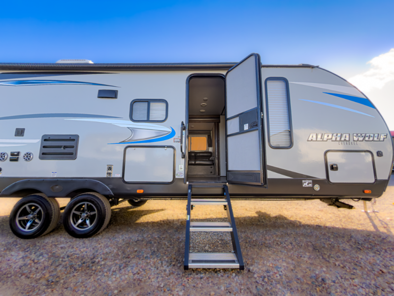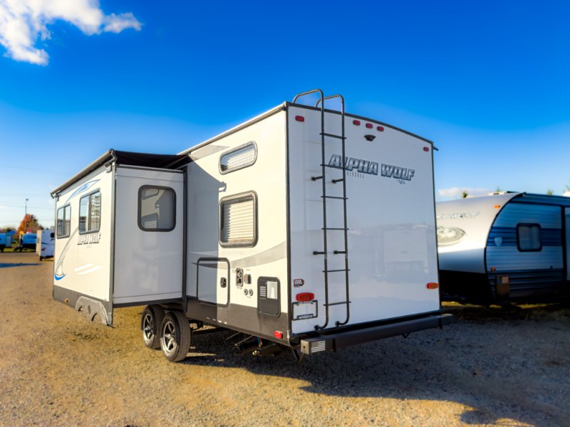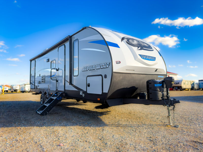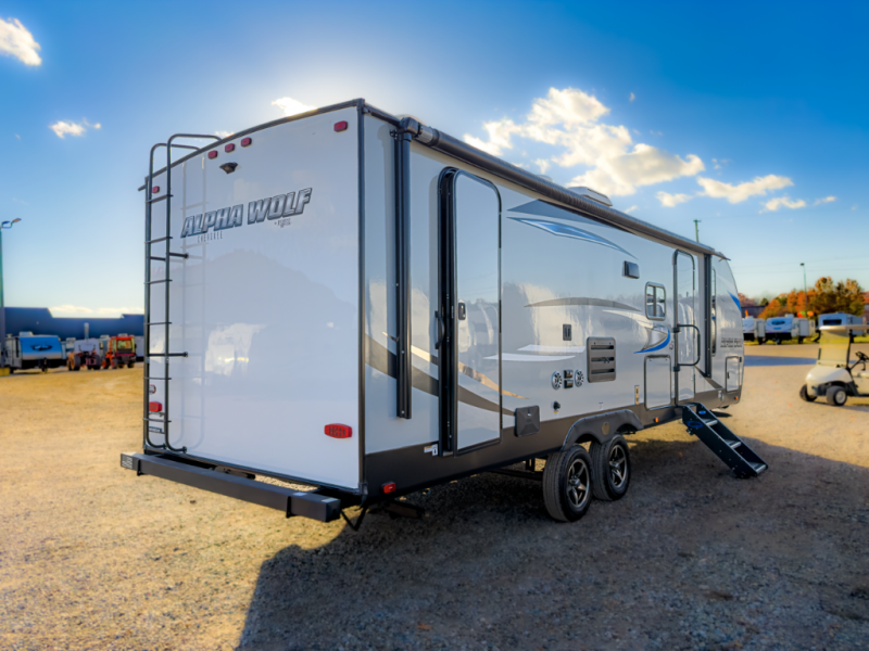 Alpha Wolf 26DBH-L with double bunks, super-slide living space, outdoor kitchen, and lightweight towability delivering strong family value for Michigan camping.