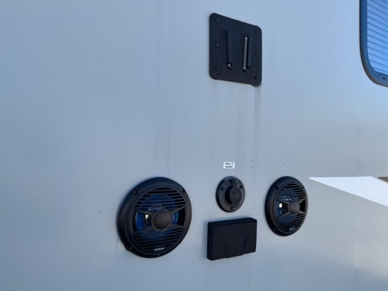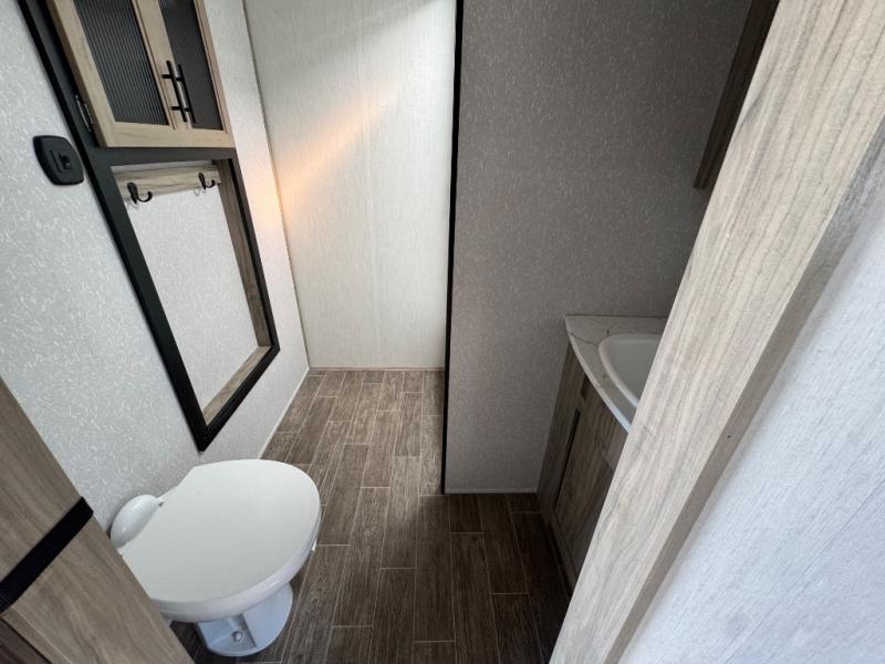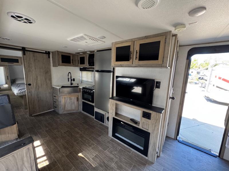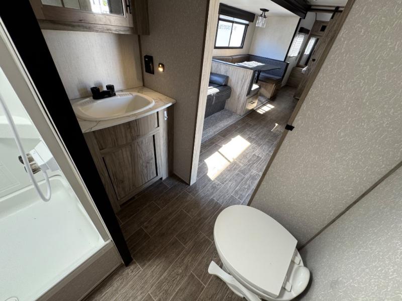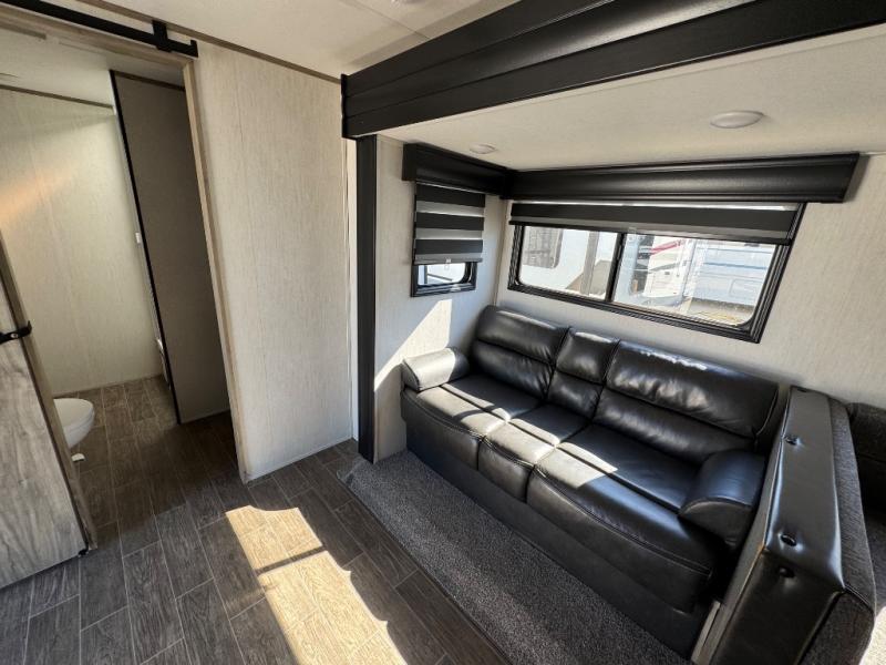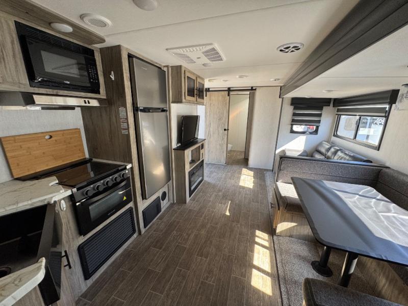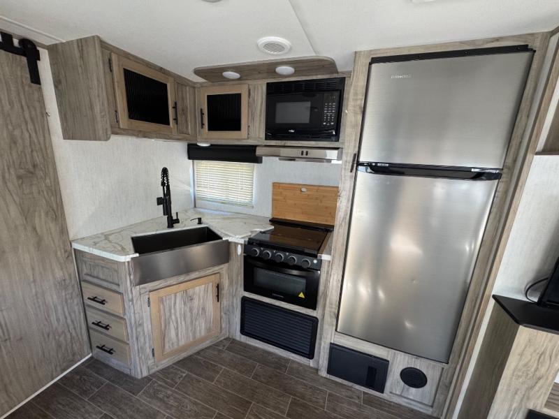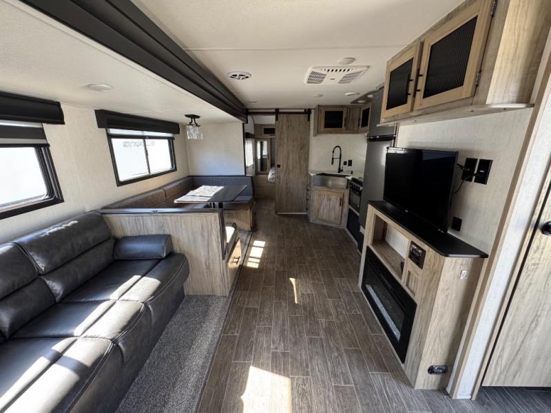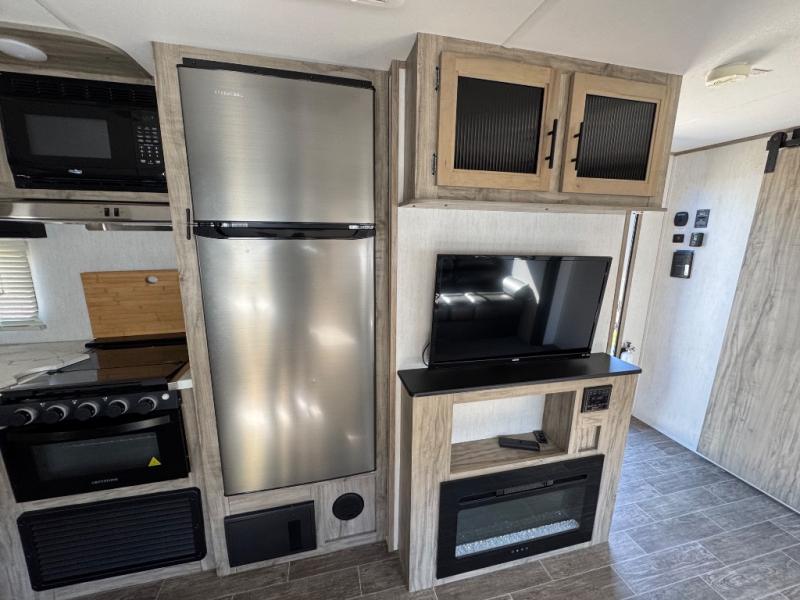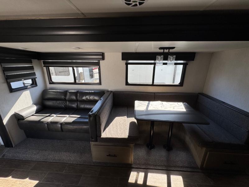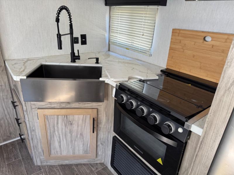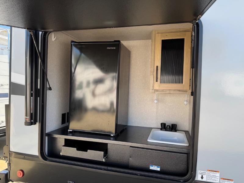 The Cherokee Alpha Wolf travel trailer is the first of Cherokee's line up to be fully laminated, which makes them lightweight, well insulated, and able to provide a sleek and modern exterior. The tire pressure monitoring system and exterior shower with hot and cold water add to the usefulness and value of the Alpha Wolf, and the LED lighting on both the exterior and interior delivers a bright and cheerful atmosphere no matter what time of day it is. Inside of the Alpha Wolf you will find blackout kitchen appliances in the kitchen and plenty of storage for your pots and pans underneath the sink.