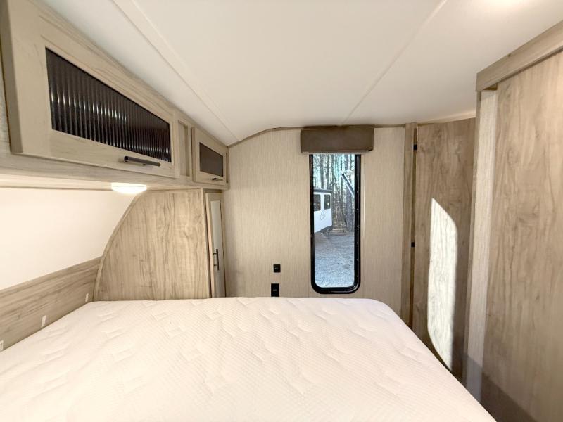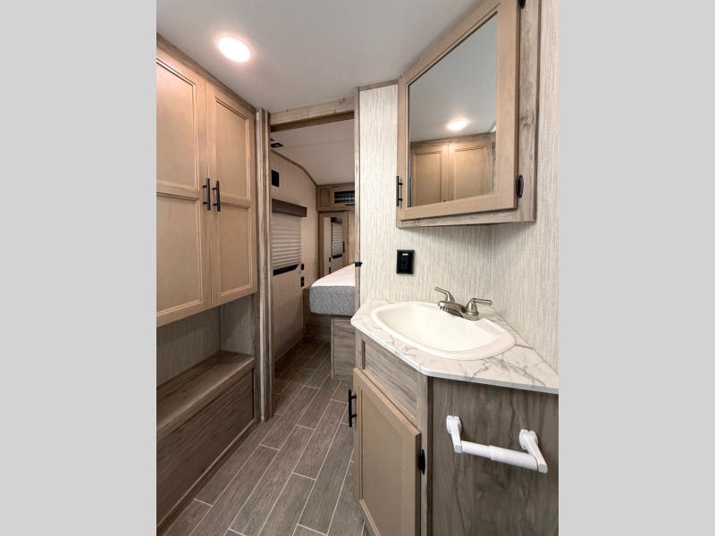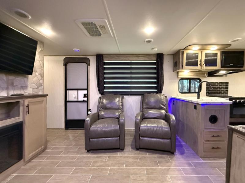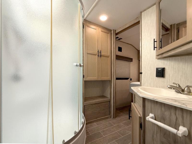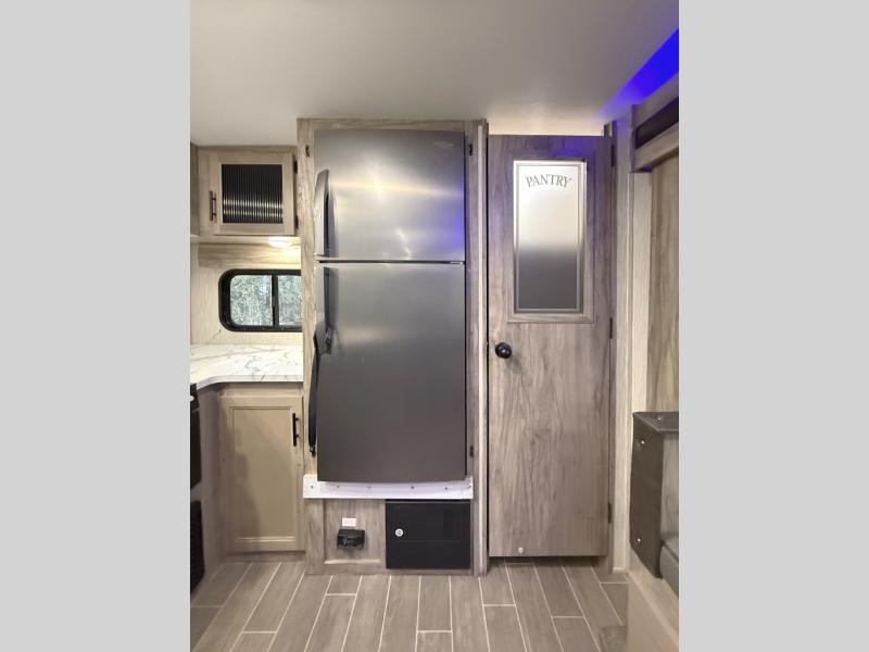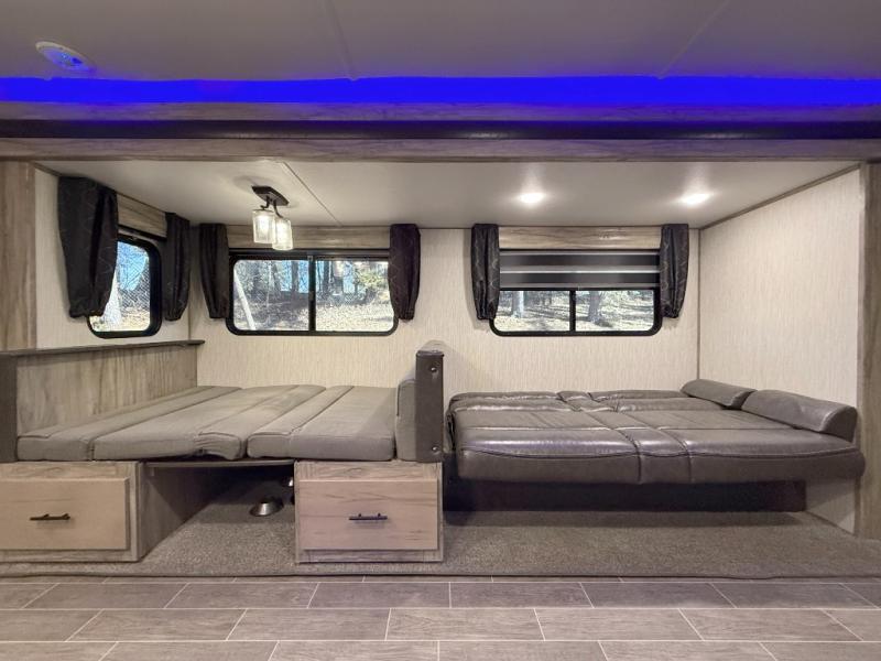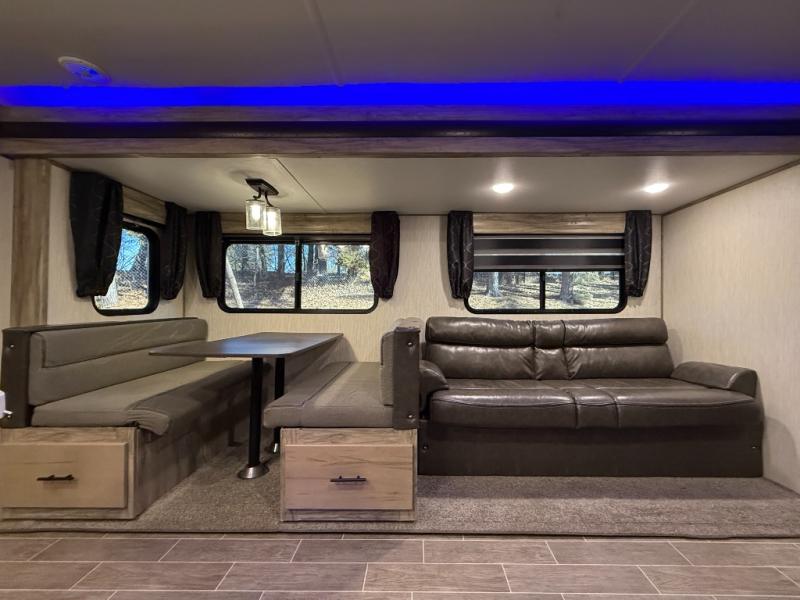 This Cherokee Alpha Wolf travel trailer is excellent for a smaller family or group of individuals who are looking to explore the country without losing the comforts of home. With a full kitchen and large pantry, you will find it easy to prepare dinner each evening, and the single slide that houses the booth dinette and sofa give you extra space to sit and chat with the chef. You will achieve complete relaxation on the queen-size bed in the front master suite, and the private bathroom entrance will allow you to quickly and conveniently get ready each morning.