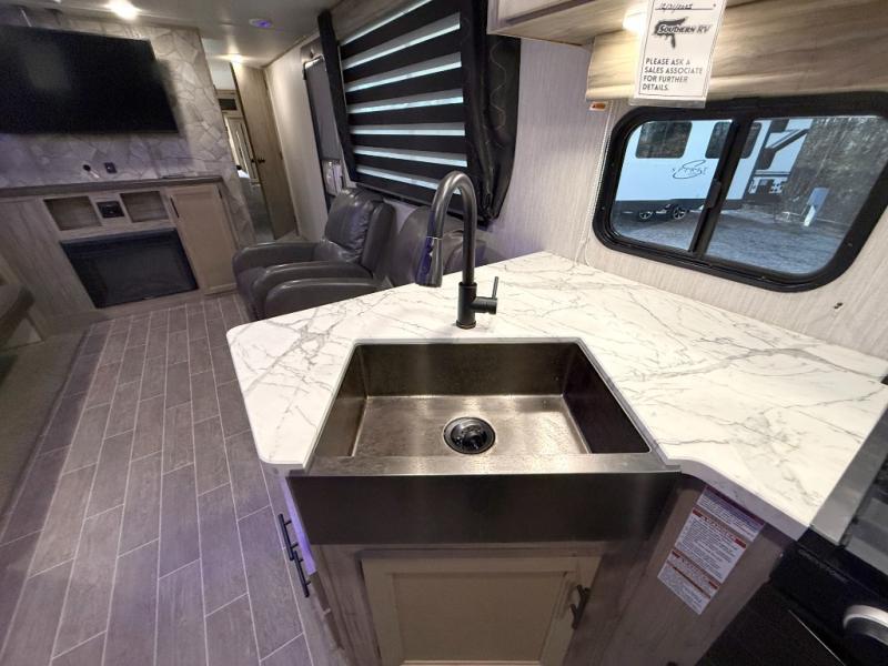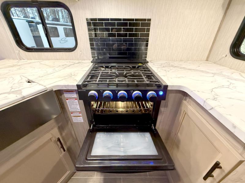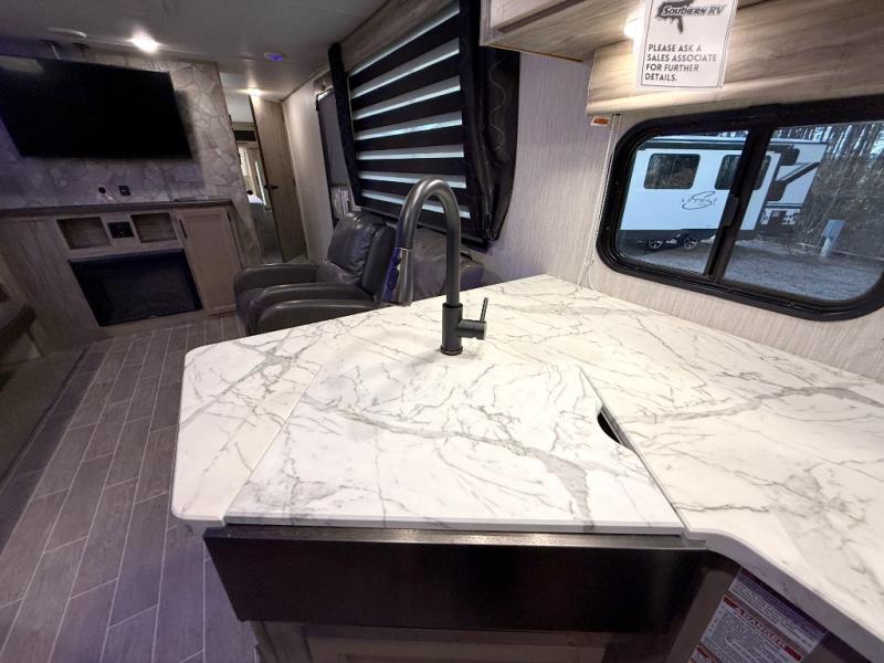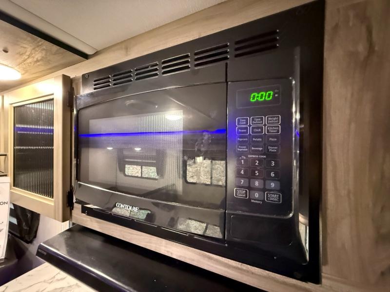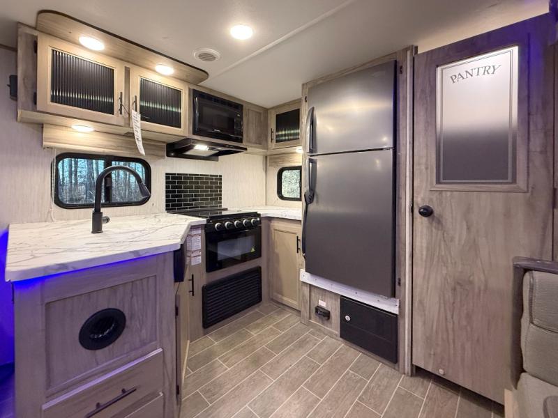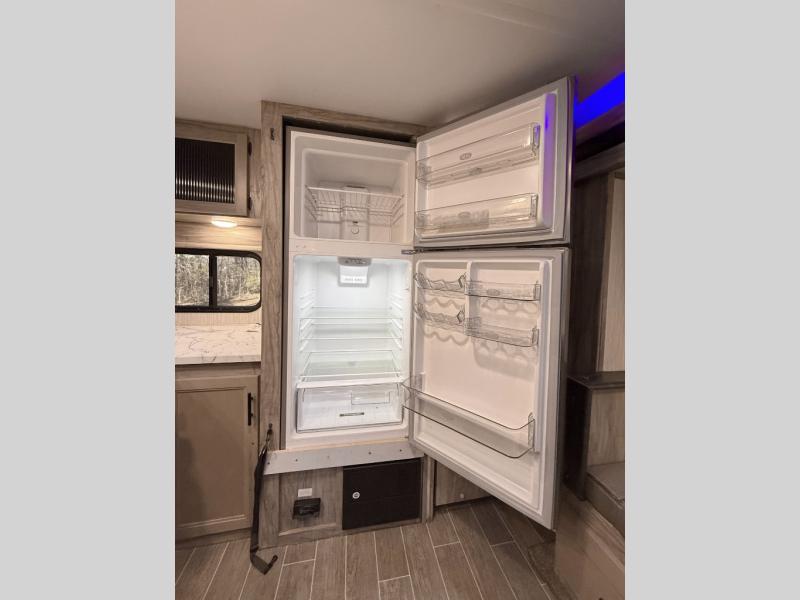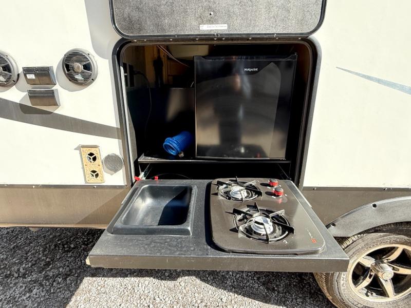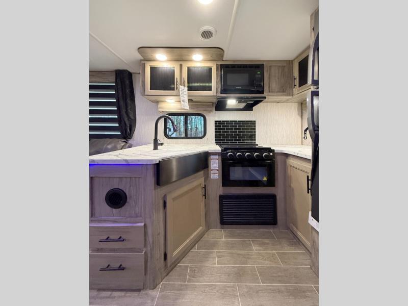 The Cherokee Alpha Wolf travel trailer is the first of Cherokee's line up to be fully laminated, which makes it lightweight, well insulated, and able to provide a sleek and modern exterior. The tire pressure monitoring system and exterior shower with hot and cold water add to the usefulness and value of the Alpha Wolf, and the LED lighting on both the exterior and interior delivers a bright and cheerful atmosphere no matter what time of day it is. Inside of the Alpha Wolf you will find blackout kitchen appliances in the kitchen and plenty of storage for your pots and pans underneath the sink.