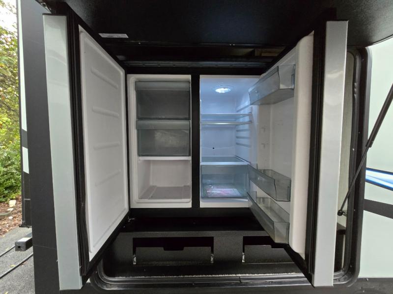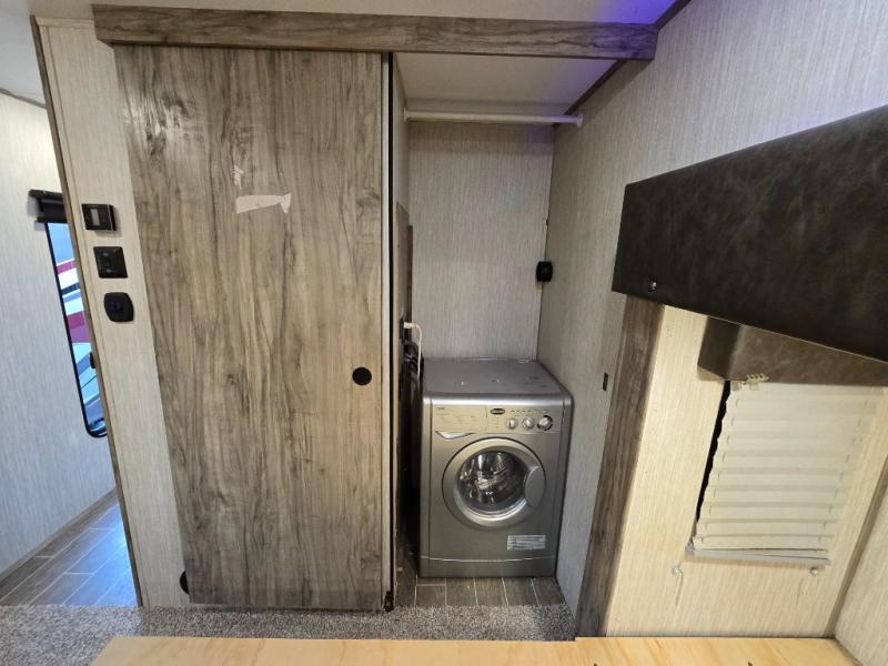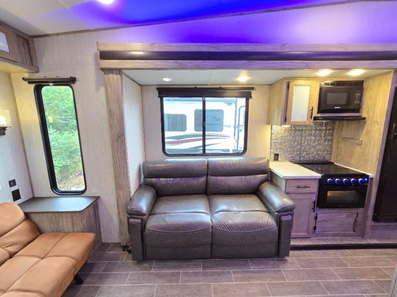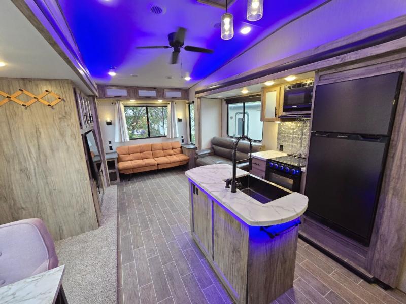 If you're looking to upgrade to an RV with more comfort, style, and convenience, look no further than this fifth wheel! You'll enjoy triple slides in this unit; dual opposing slides in the rear living area opens up the whole space, and a king bed slide out in the front bedroom provides even more space. The chef of the family can prepare dinner on the three burner range or use the convenient outside kitchen if the weather is nice. After dinner, relax on the home theater seating that includes heat, massage, and ambient lighting. The kids can enjoy their breakfast at the table with chairs before heading outside for the day and the full bath will be waiting for them after a day of hiking through the woods!