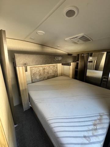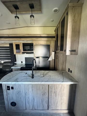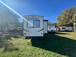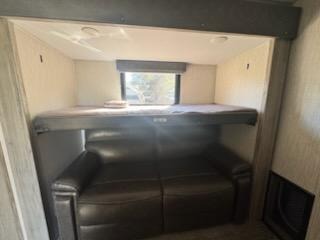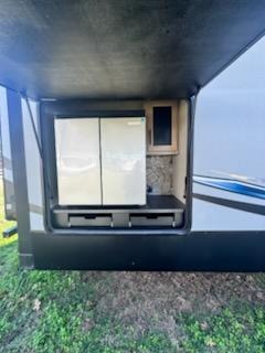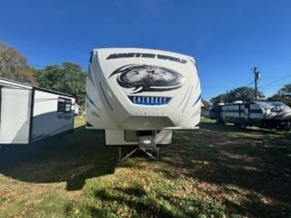 Your whole family will love camping in this fifth wheel! You will especially love having your own place to escape to with the front master suite featuring a king bed, a large front closet with shelves, and a closet that is prepped for you to add the optional stackable washer/dryer. The kids can even have their own private space too in the second bedroom and relax/sleep on the tri-fold sofa below the flip up bunk, plus there is even a loft sleeping area above it all. The rear living area is decked out in comfortable features like the rear tri-fold sofa with end tables and the home theatre seating with cupholders across from the fireplace. The chef of your group will love cooking at the outside kitchen, but cooking indoors will be just as fun for them with the three burner range and all of the extra counter space next to the farm style sink!