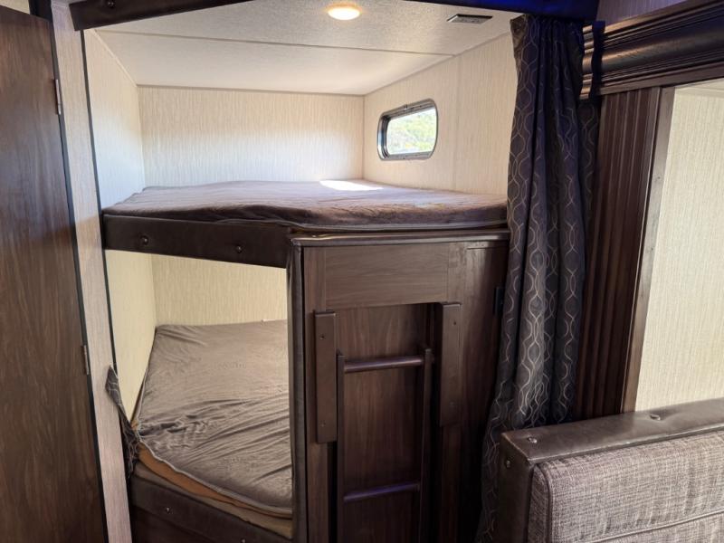 Come on inside this Cherokee Grey Wolf travel trailer and experience the convenience of a smooth flow of traffic in and out with two entry doors. The rear door leads into a full bath which is great for accessibility when outside and when you need to use the bathroom. Once inside, you will notice the large U-shaped dinette and the sofa which sit on the slide and create a spacious footprint for moving about, as well as great places to play games and socialize with your friends and family. A walk-in pantry provides plenty of storage allowing you to stock up on your favorite snacks and dry goods for your family adventure. At night, there is sleeping space for ten between the double-size bunks and the queen-size bed.