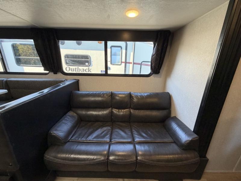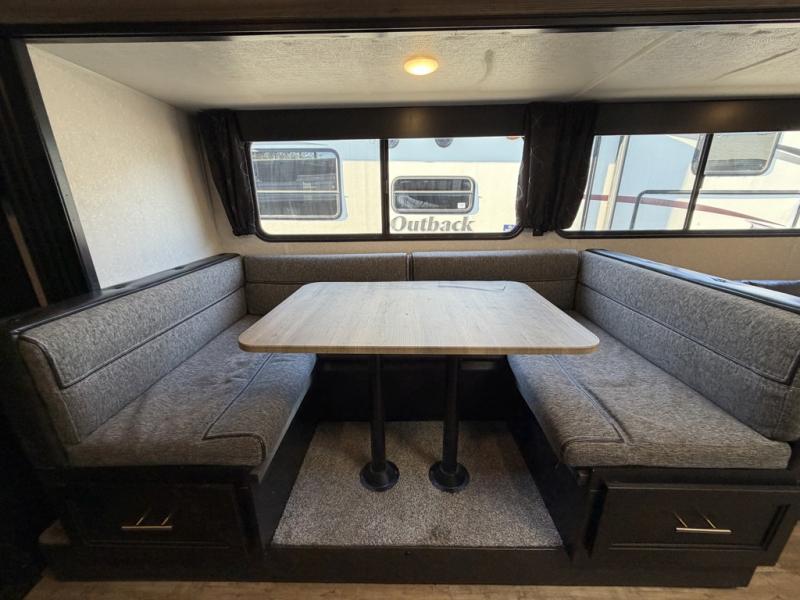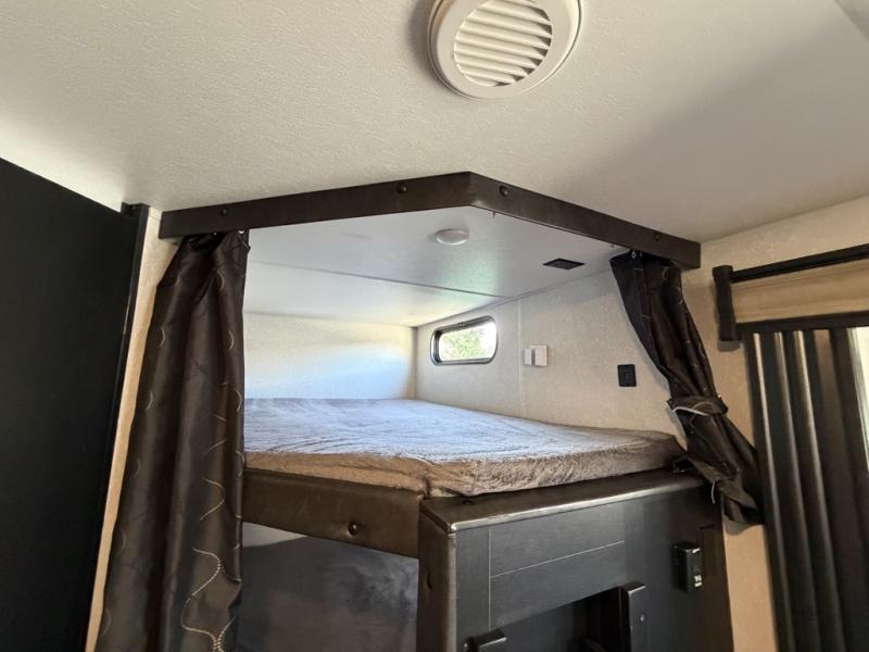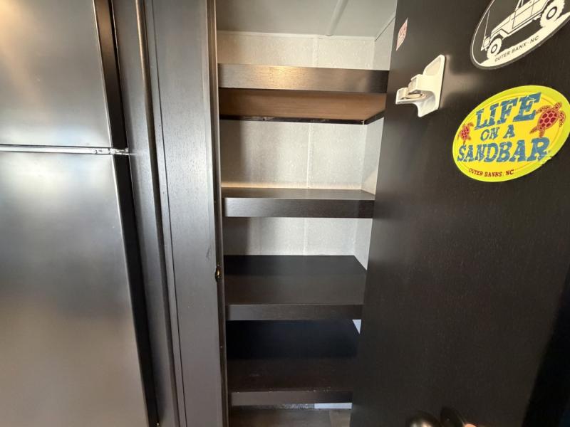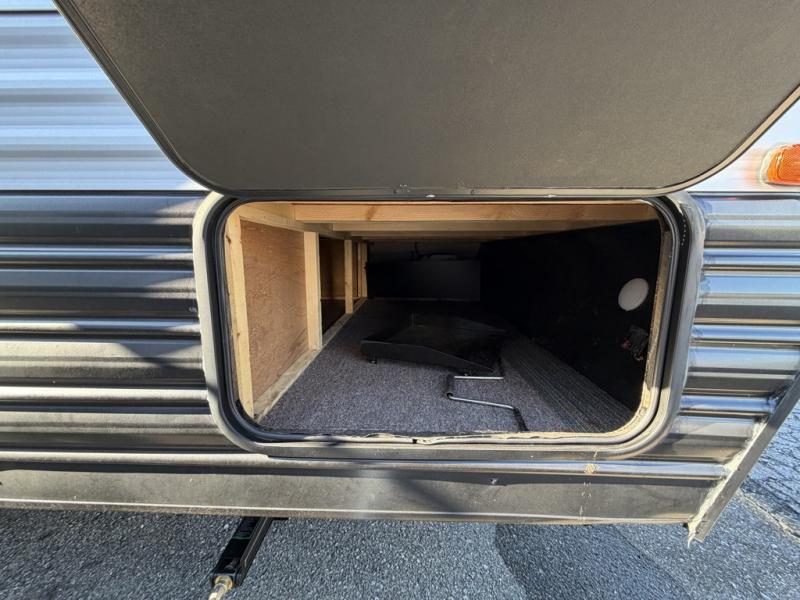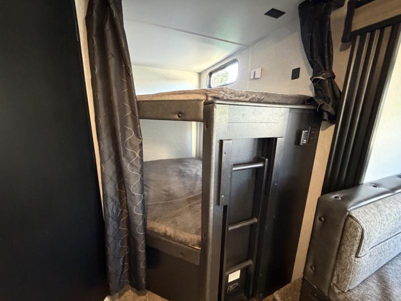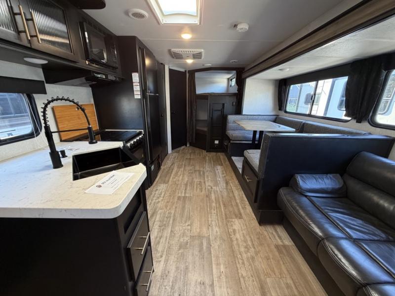 Come on inside this Cherokee Grey Wolf travel trailer and experience the convenience of a smooth flow of traffic in and out with two entry doors. The rear door leads into a full bath which is great for accessibility when outside and when you need to use the bathroom. Once inside, you will notice the large U-shaped dinette and the sofa which sit on the slide and create a spacious footprint for moving about, as well as great places to play games and socialize with your friends and family. A walk-in pantry provides plenty of storage allowing you to stock up on your favorite snacks and dry goods for your family adventure. At night, there is sleeping space for ten between the double-size bunks and the queen-size bed.