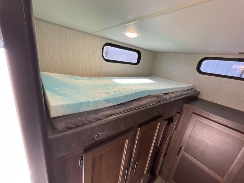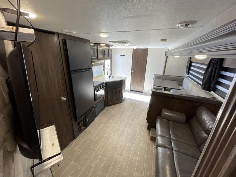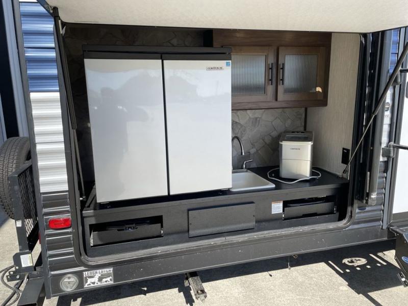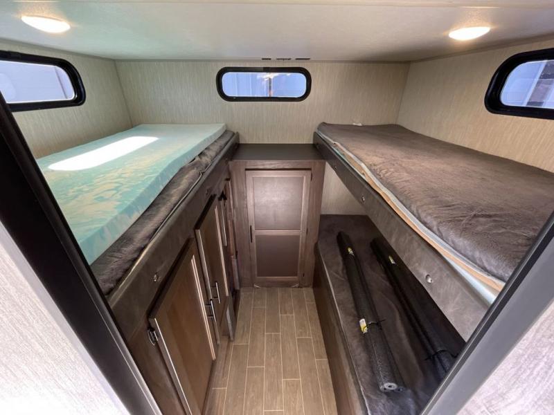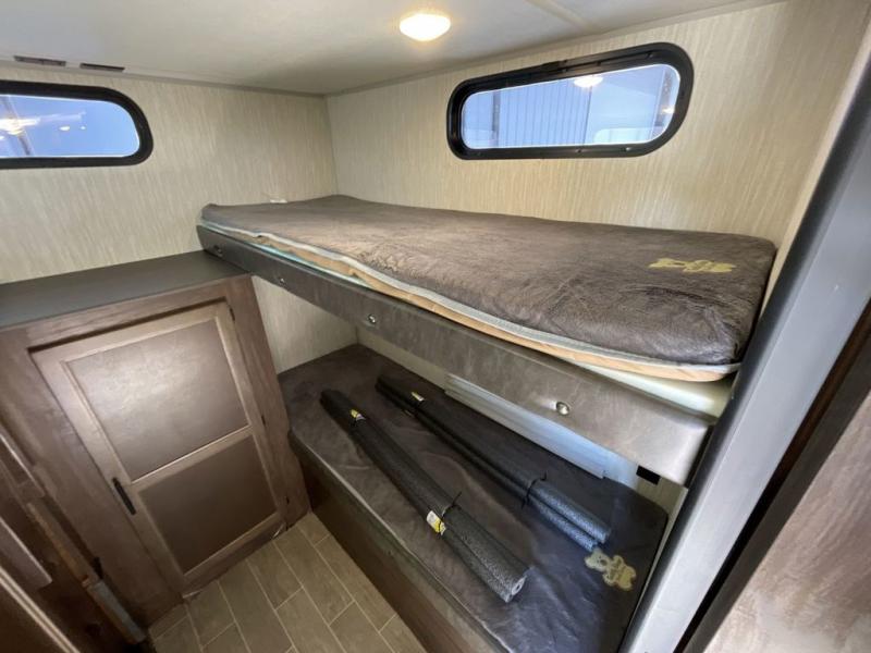 Your larger family will love spending weekends away with this Cherokee Grey Wolf travel trailer as their home away from home. This model offers sleeping for several comfortably with triple bunk beds in the rear private bunkhouse. In the front, there is a master suite with wardrobes and nightstands on either side of the queen bed, and it even has access to the dual-entry bath. The two entry doors will make accessing the trailer easy for everyone, and you will appreciate the abundant storage throughout this unit including large overhead cabinets, a walk-in pantry, plus numerous outside storage compartments for all of your outdoor gear. You also even have an outdoor kitchen!