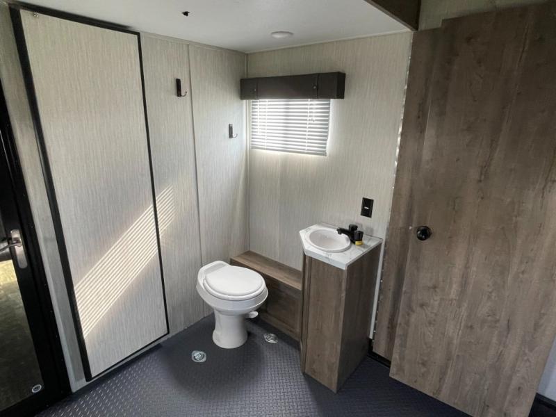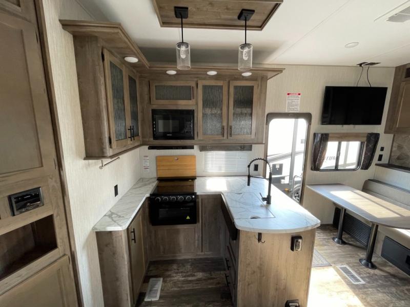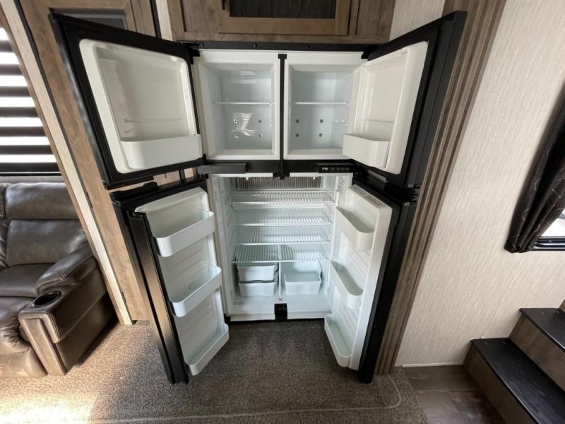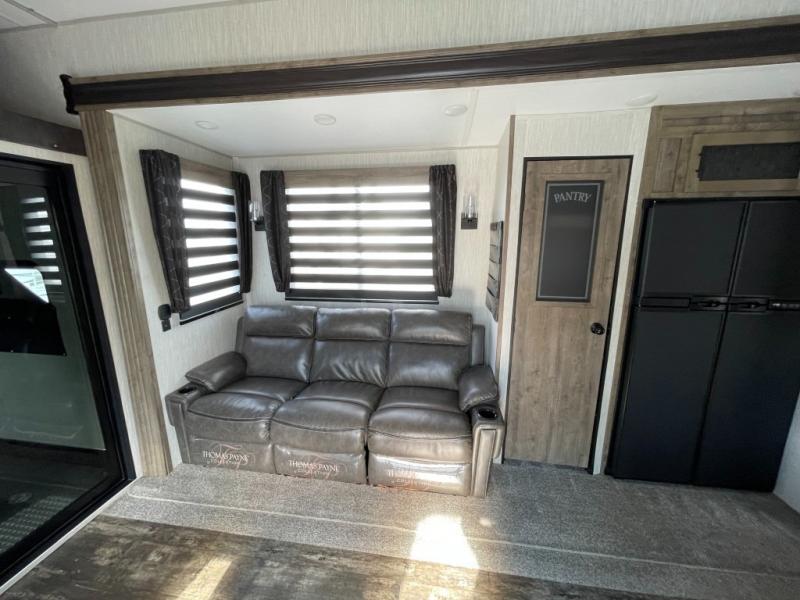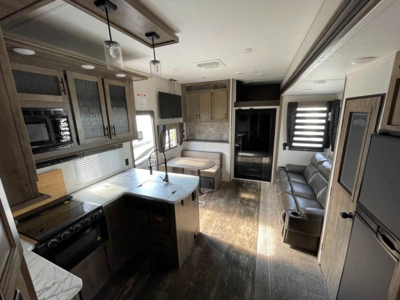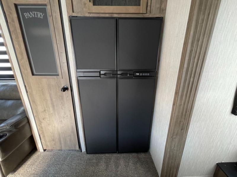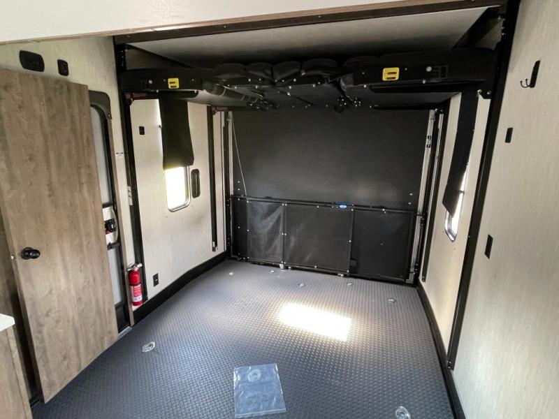 When you're looking to upgrade your RV to a larger unit with more amenities, choose this toy hauler. Your guests will enjoy the 13' separate garage that features two sofa beds with a Happijac power bed above and a convenient half bath under the loft. The chef of the family can prepare all the meals on the cooktop indoors or use the outside kitchen to get some fresh air. This model also includes a dual entry bath that creates a front master suite mom and dad are sure to love. The Wolf Pack king bed features an upgraded hypoallergenic Evergreen mattress and the wardrobe slide provides more interior space to relax. You'll love everything about this model, including the ramp door which doubles as a "party patio", the dual entry doors for a smooth flow of traffic, and two patio awnings!