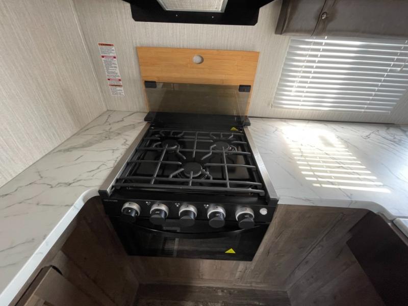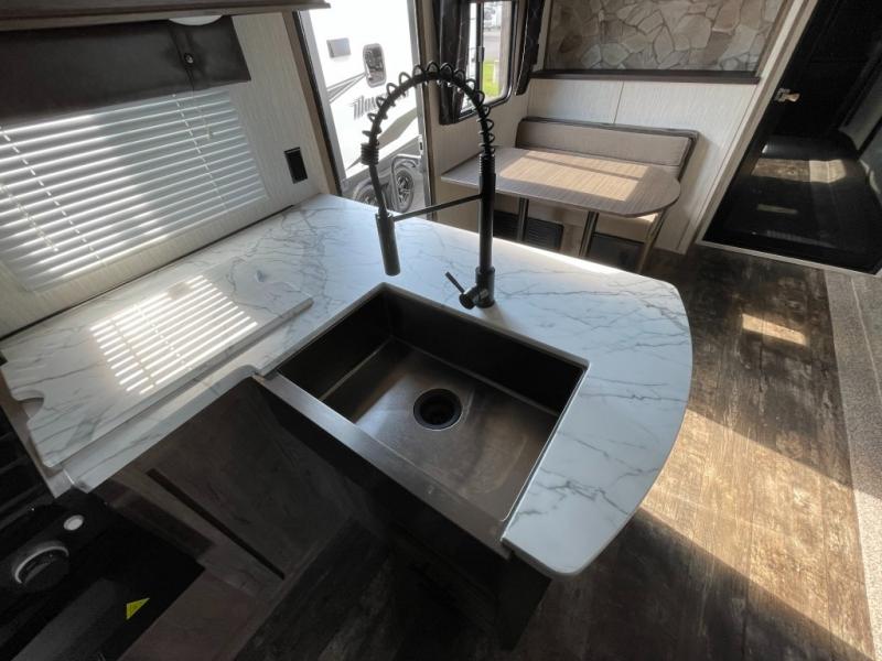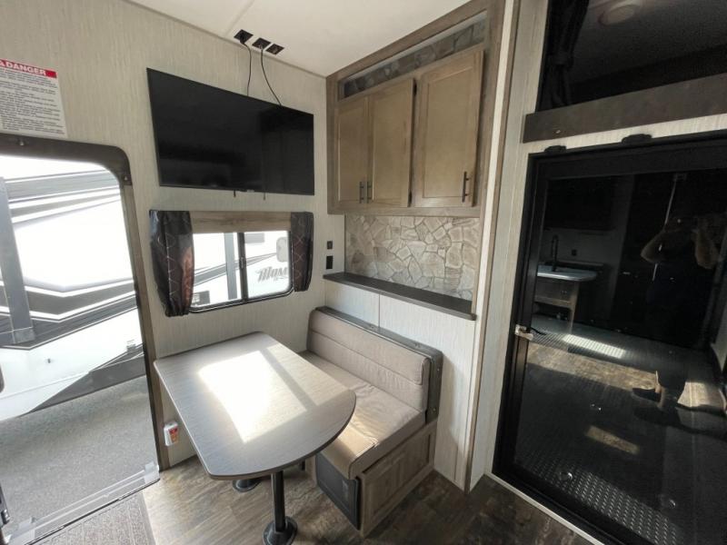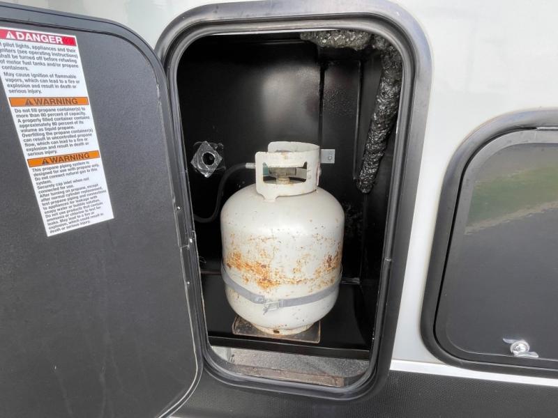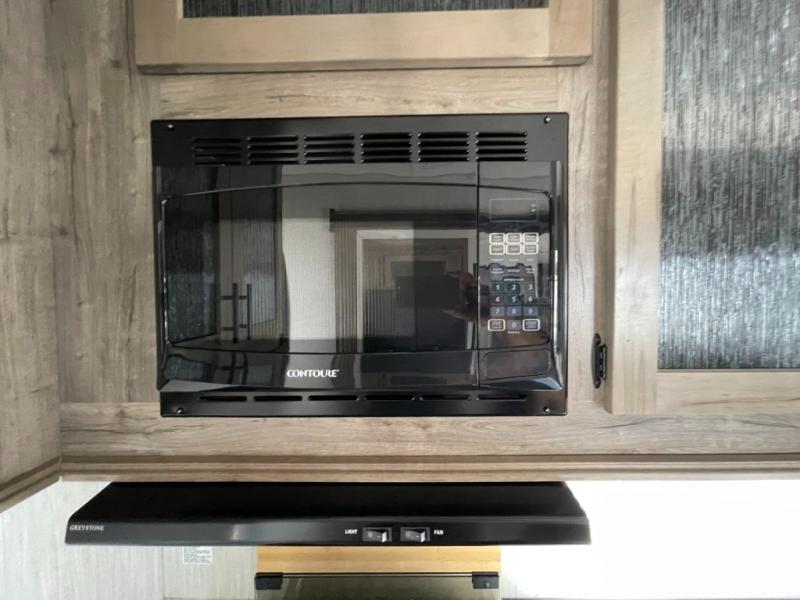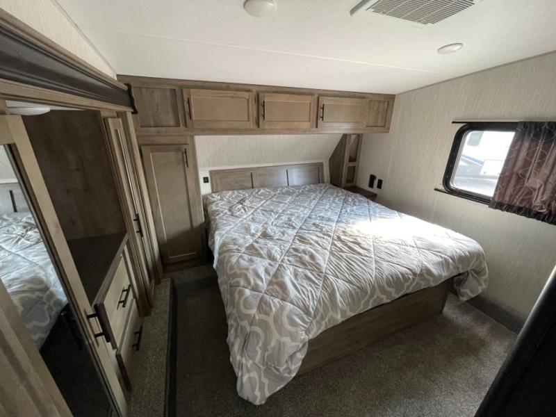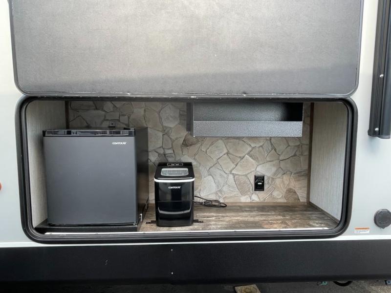 When you're looking to upgrade your RV to a larger unit with more amenities, choose this toy hauler. Your guests will enjoy the 13' separate garage that features two sofa beds with a Happijac power bed above and a convenient half bath under the loft. The chef of the family can prepare all the meals on the cooktop indoors or use the outside kitchen to get some fresh air. This model also includes a dual entry bath that creates a front master suite mom and dad are sure to love. The Wolf Pack king bed features an upgraded hypoallergenic Evergreen mattress and the wardrobe slide provides more interior space to relax. You'll love everything about this model, including the ramp door which doubles as a "party patio", the dual entry doors for a smooth flow of traffic, and two patio awnings!