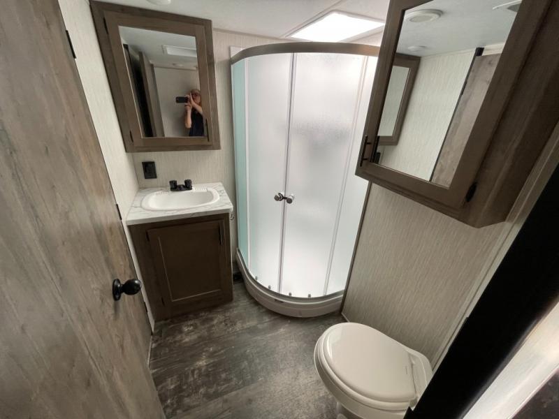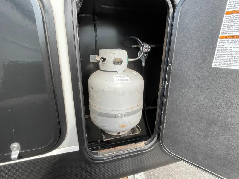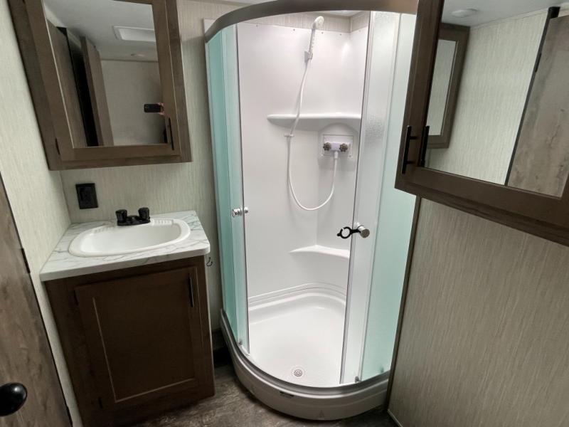 With any Cherokee Wolf Pack toy hauler, it is easy to keep the outdoor fun going all weekend long! There is plenty of room for a few dirk bikes, a four wheeler, or an ATV, and you can clean up from your excursions before coming inside with the outside shower. Inside you will find comfortable conveniences like the real wood cabinet doors and drawers, a large 10.8 cu.ft. 12V refrigerator, a shower skylight, and a drop in cooktop with a glass cover and oven. You will also appreciate having a 35,000 BTU furnace to keep the interior warm.