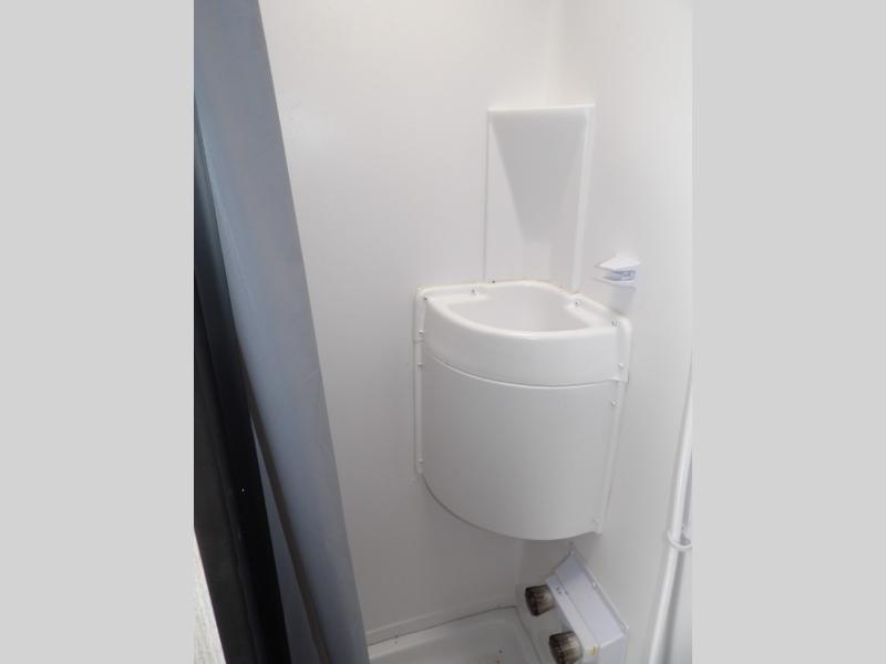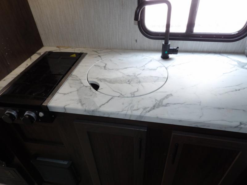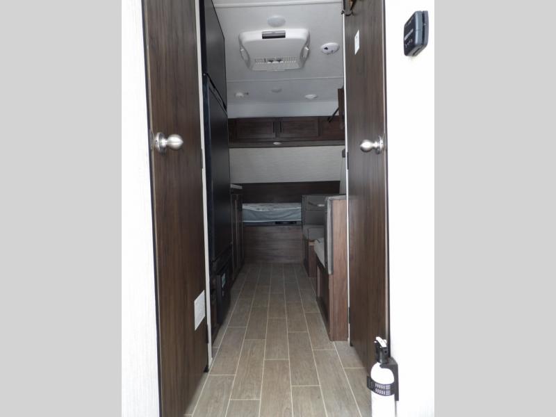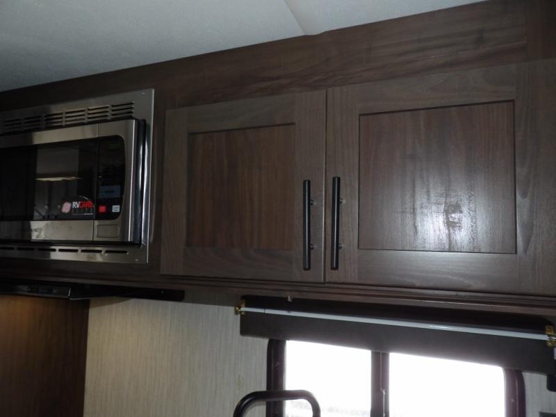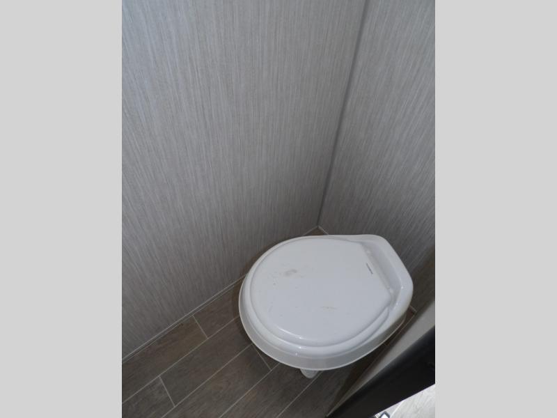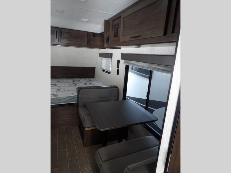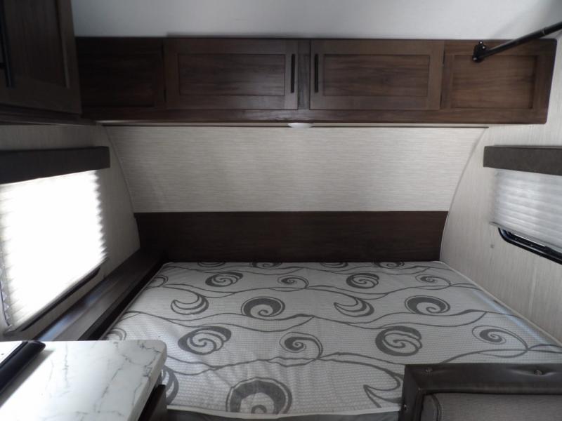 This unique rear entry allows you to set up at the campsite with a view as you walk outside each morning. You can relax under the power awning before going fishing or taking a walk around the lake. When you get hungry, the cooktop and microwave allow you to make hot meals and you can store your drinks in the 10 cu. ft. refrigerator. Have a seat at the dinette for meals or playing games, and offer an overnight guest a place to sleep. The queen bed up front allows you to sleep on your own bedding each night with overhead cabinets for your clothing and a shelf to set your cell phone and keys on. And the split bath offers a private toilet room, and a private shower on the opposite side so two people can get ready at once.