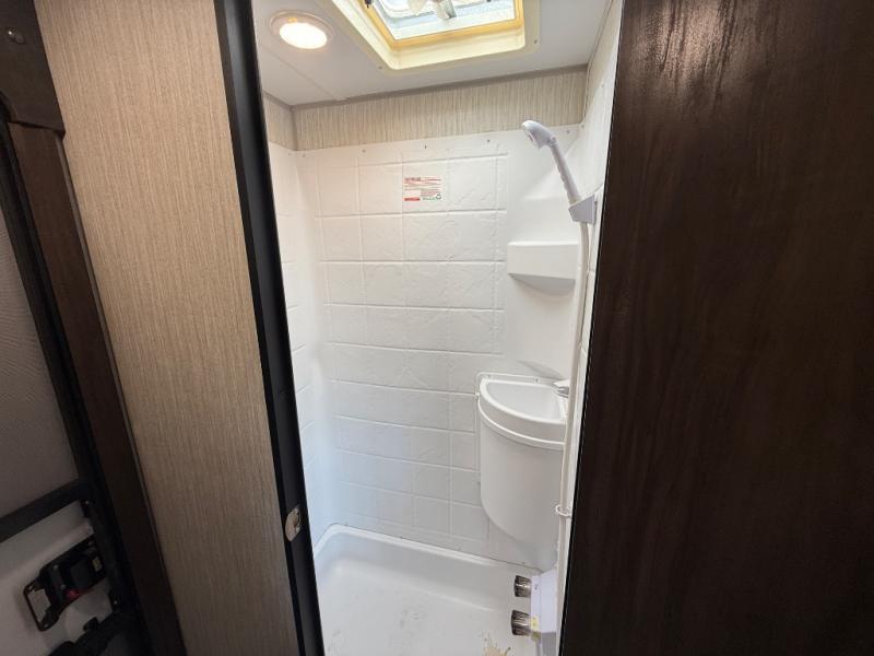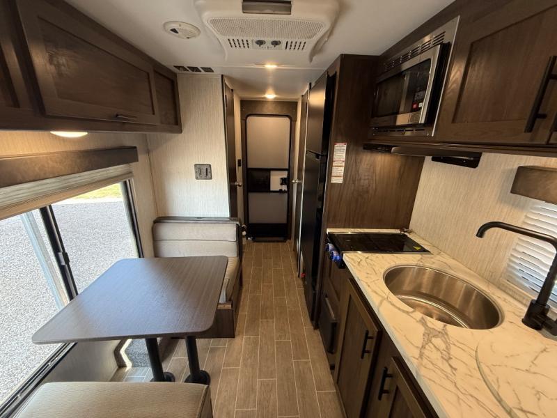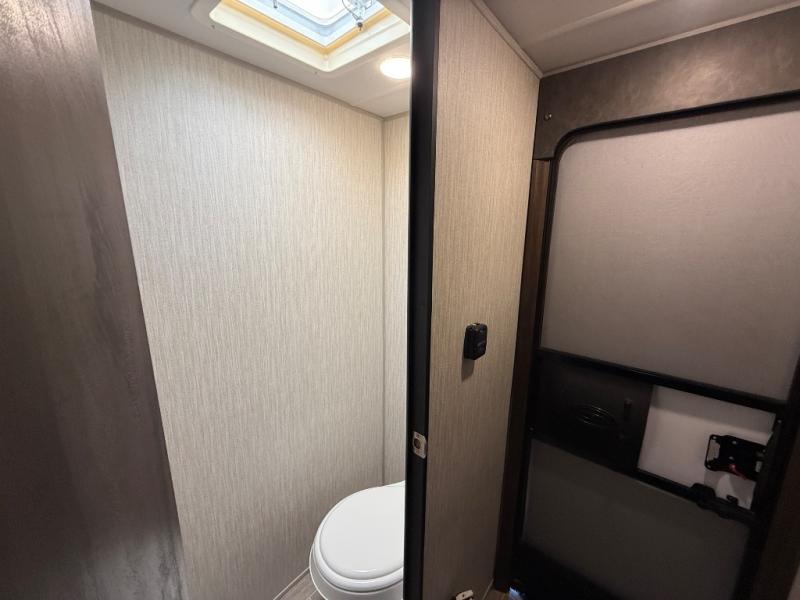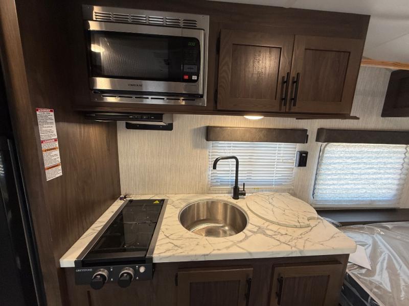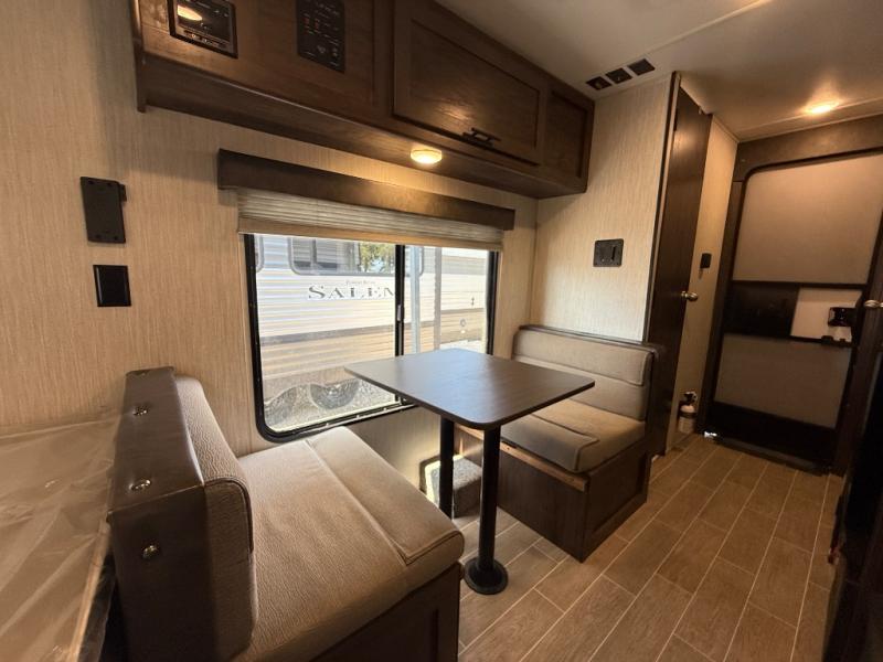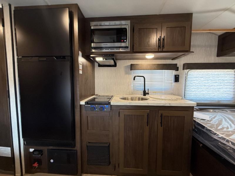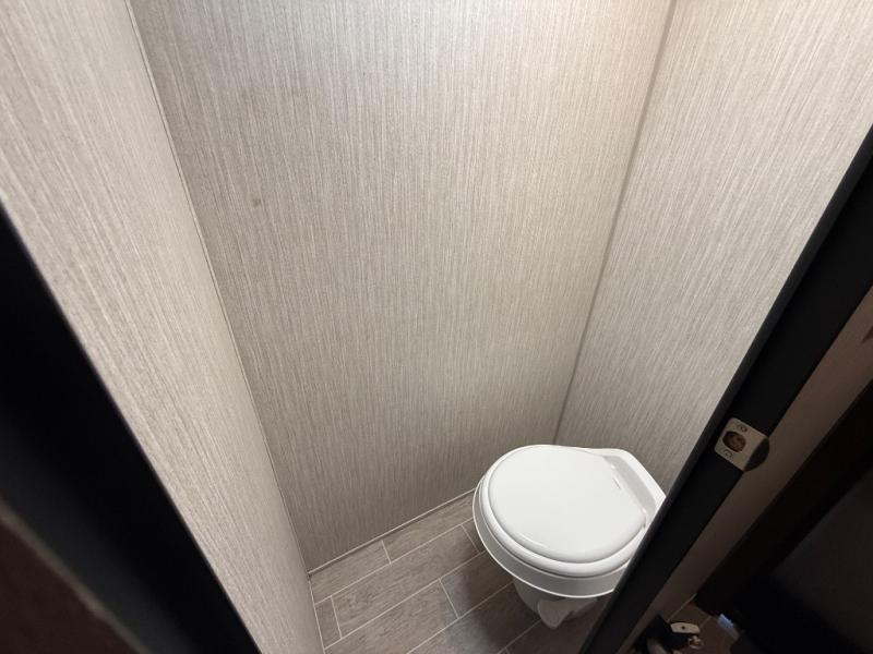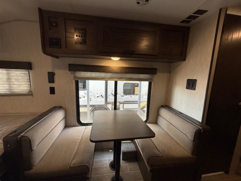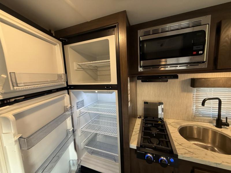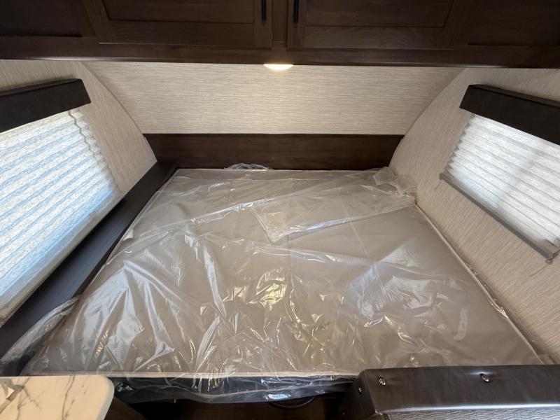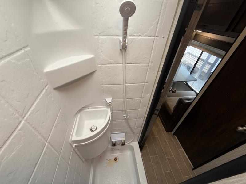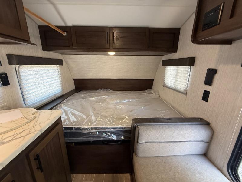 This unique rear entry allows you to set up at the campsite with a view as you walk outside each morning. You can relax under the power awning before going fishing or taking a walk around the lake. When you get hungry, the cooktop and microwave allow you to make hot meals and you can store your drinks in the 10 cu. ft. refrigerator. Have a seat at the dinette for meals or playing games, and offer an overnight guest a place to sleep. The queen bed up front allows you to sleep on your own bedding each night with overhead cabinets for your clothing and a shelf to set your cell phone and keys on. And the split bath offers a private toilet room, and a private shower on the opposite side so two people can get ready at once.