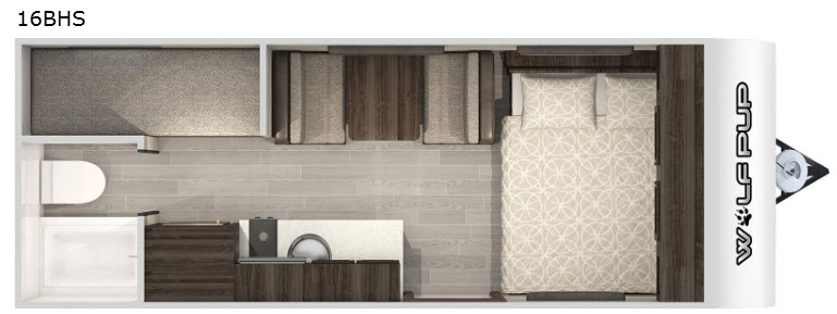 Imagine your kids on the rear bunk beds and you are enjoying the front queen bed before everyone gets up to make breakfast and head out for a hike. The kitchen includes a cooktop and microwave, as well as a refrigerator to store your leftovers, and a sink to wash the dishes. You will find storage in the overhead cabinets and there is a shelf by the queen bed. And your hiking gear can be stowed in the outside storage.