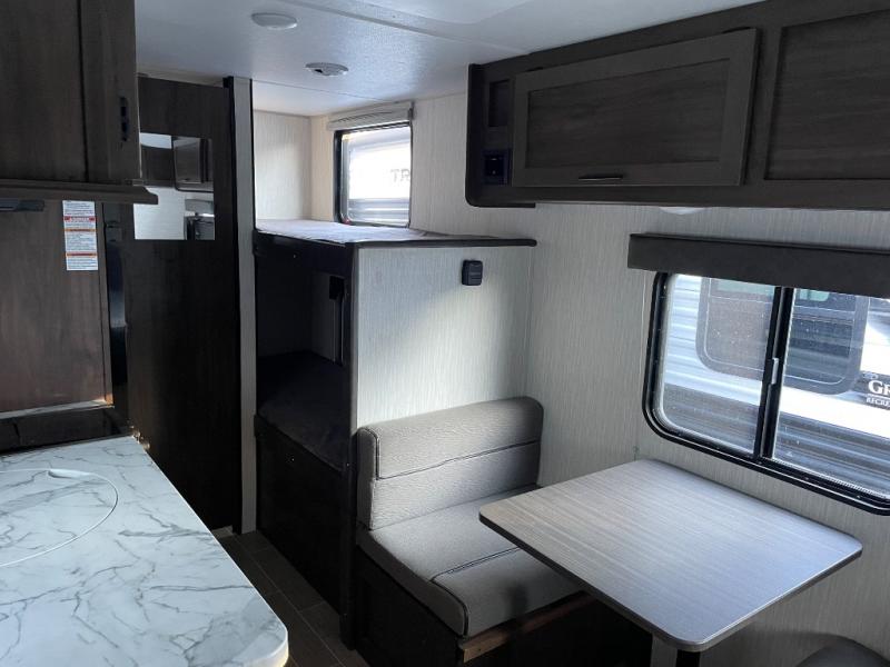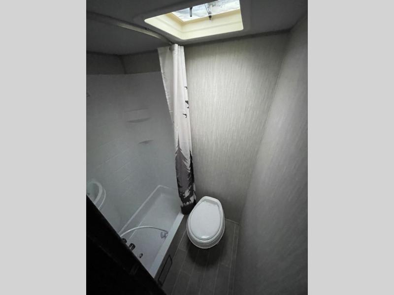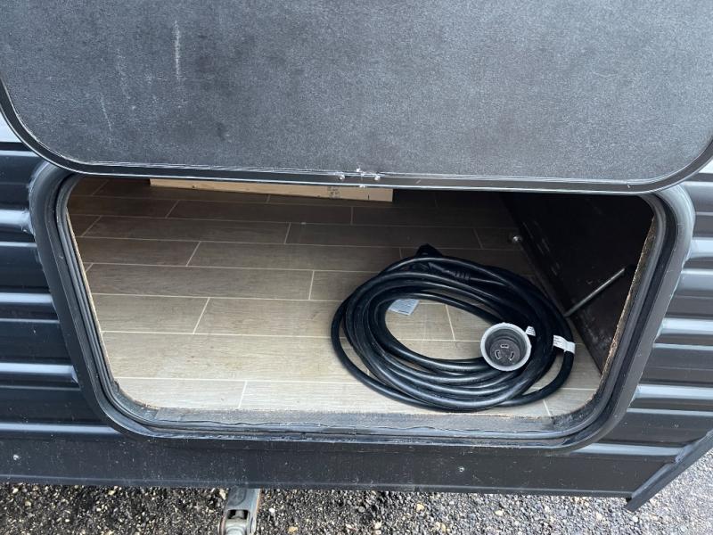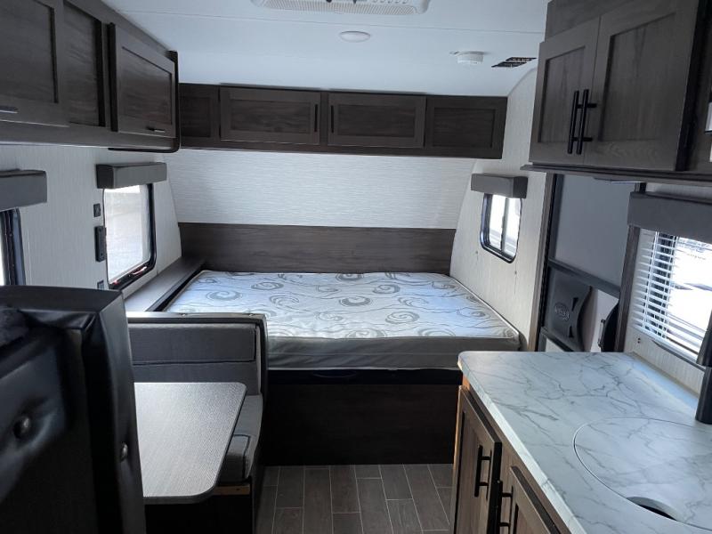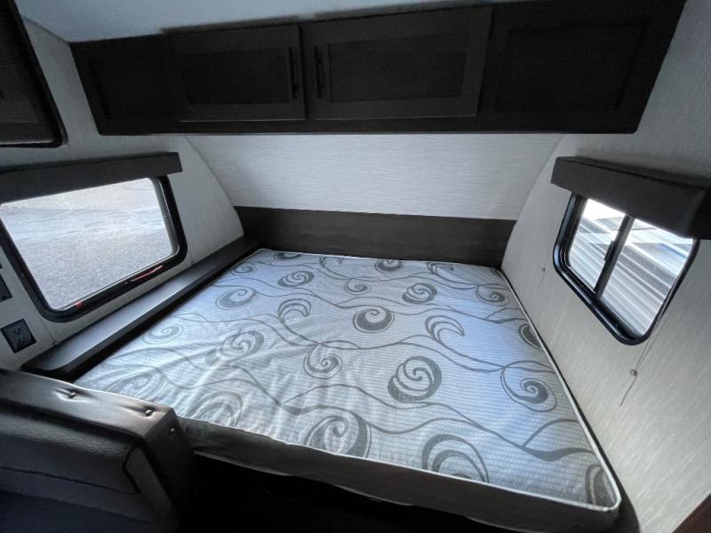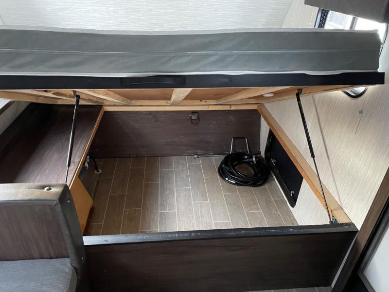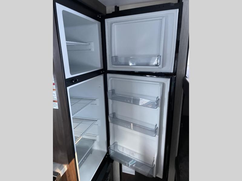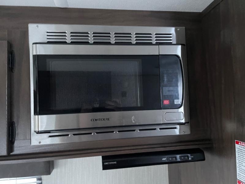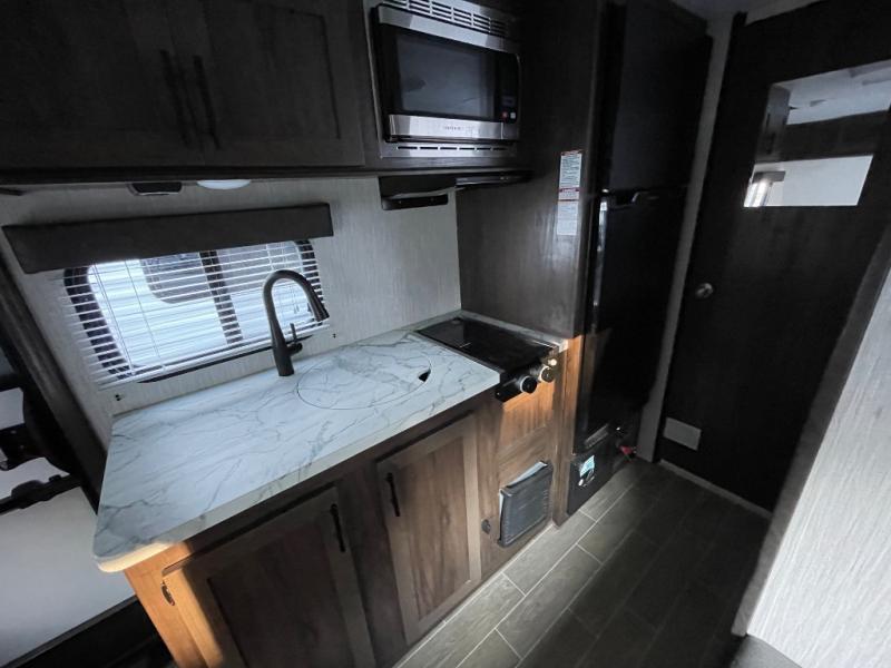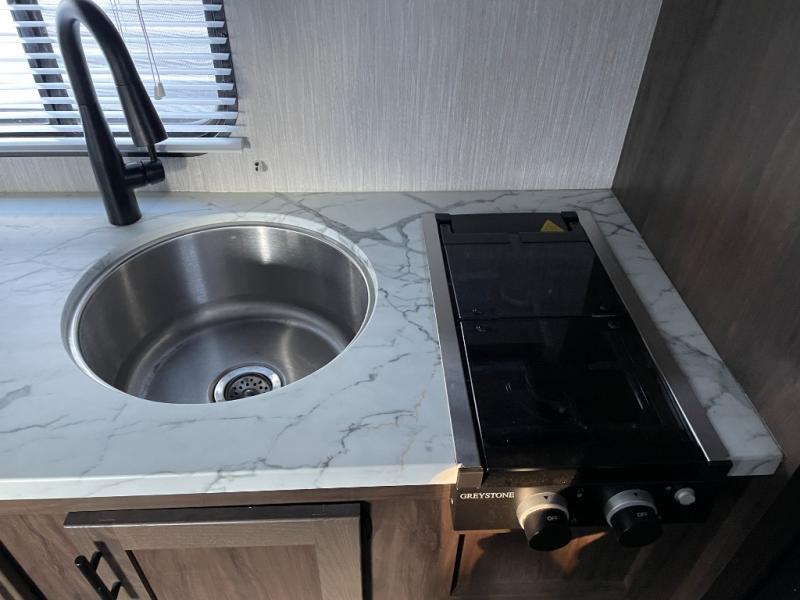 Imagine your kids on the rear bunk beds and you are enjoying the front queen bed before everyone gets up to make breakfast and head out for a hike. The kitchen includes a cooktop and microwave, as well as a refrigerator to store your leftovers, and a sink to wash the dishes. You will find storage in the overhead cabinets and there is a shelf by the queen bed. And your hiking gear can be stowed in the outside storage.
