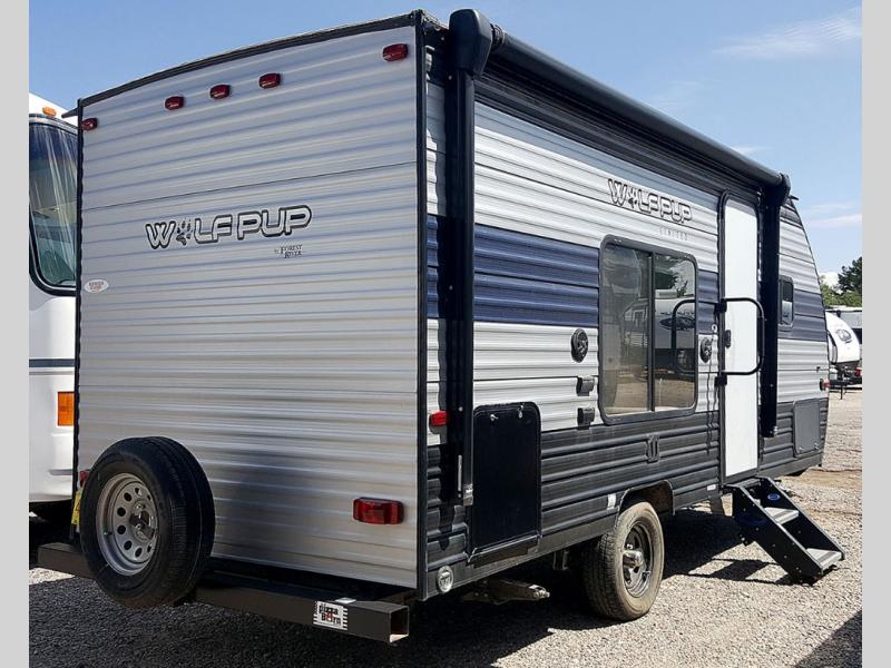 The Cherokee Wolf Pup travel trailer and toy hauler by Forest River are lightweight and easy to tow with ample storage for all your things. The aerodynamic radius front profile allows for better gas mileage, and the one-piece walkable decked roof allows you to easily clean off the unit after a fun weekend. You'll enjoy features such as USB charging stations to keep everyone's phones charged, a power awning with an LED light strip allowing you to stay outside longer, a seamless countertop, and an outside shower with hot and cold water to clean the dishes or even yourself, plus more! Pick the floorplan that works best for you, and start camping tomorrow!