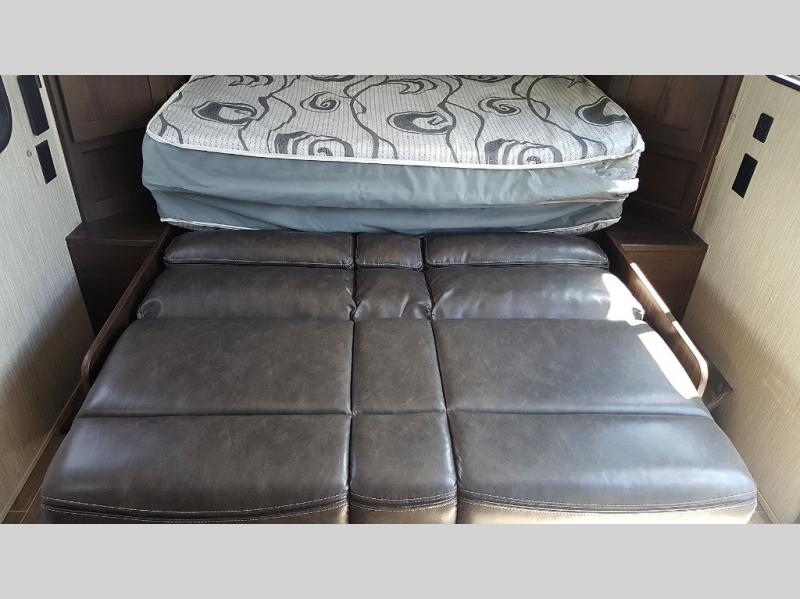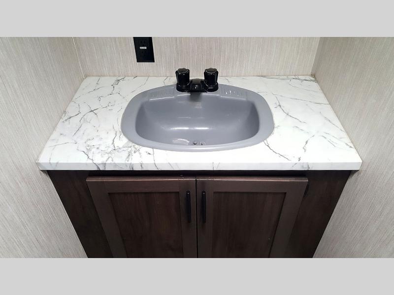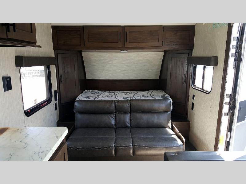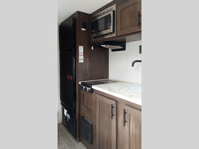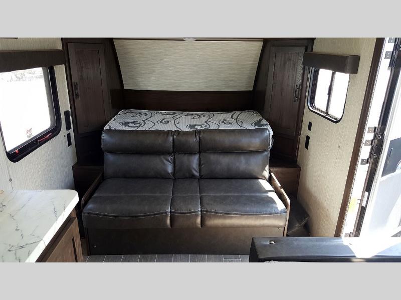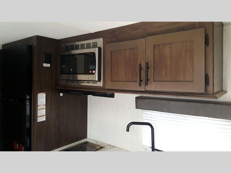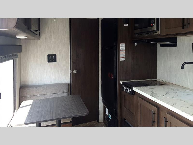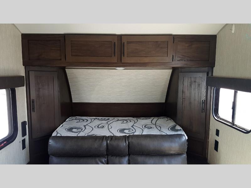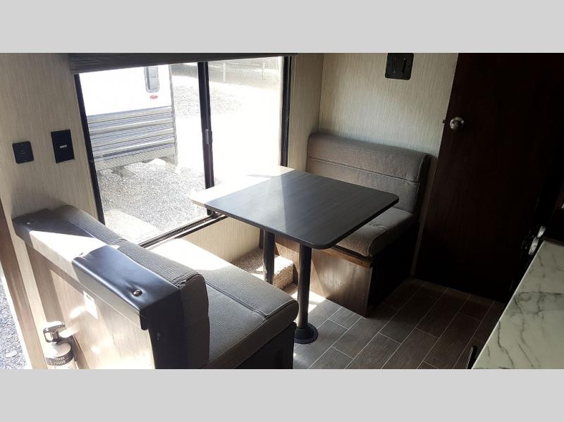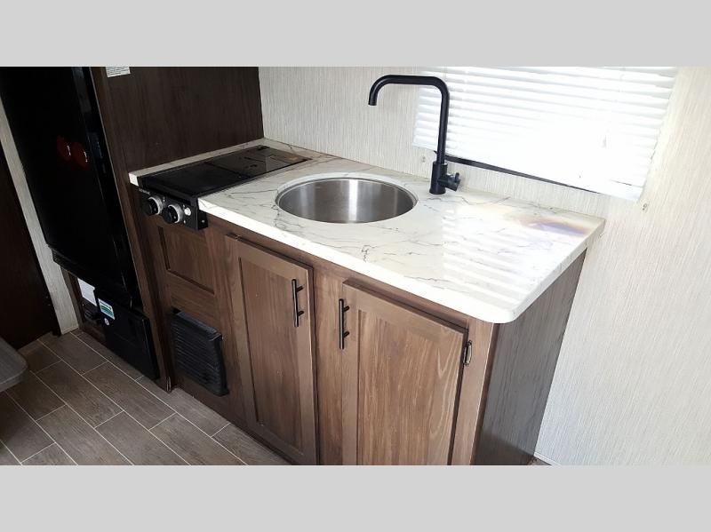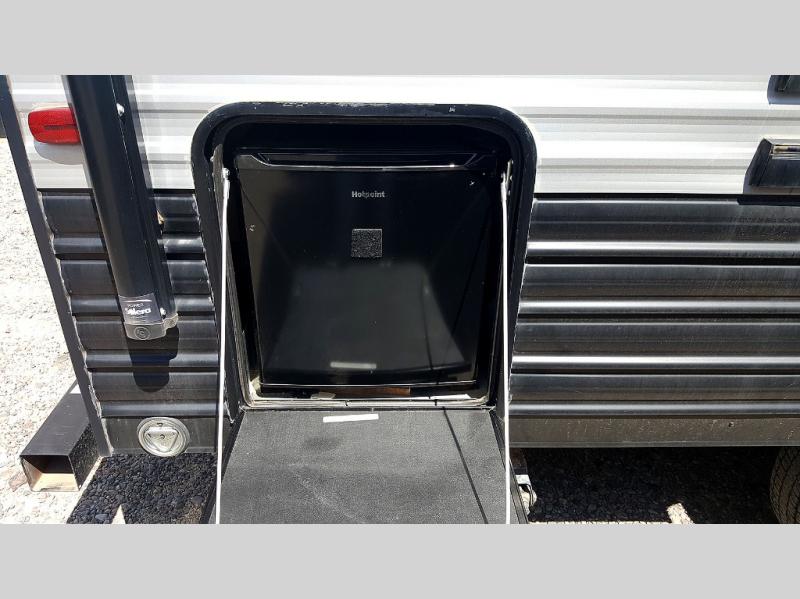 Whether you are a couple or a family that enjoys camping with your own accommodations, you will enjoy this trailer. From the walk-around queen bed with storage on each side and above, and the dinette that doubles as sleeping space for the kiddo, you can sleep on your own sheets each night. The full bathroom allows you to skip the public facilities, and the kitchen amenities will allow you to cook inside whenever you like. You will also find storage throughout the inside as well as outside with the exterior storage for your outdoor gear.