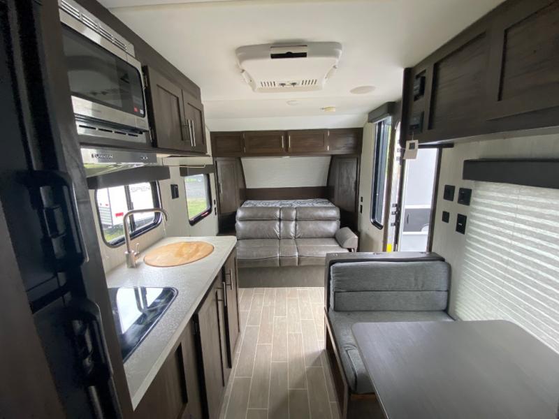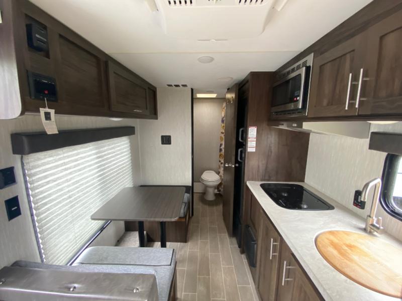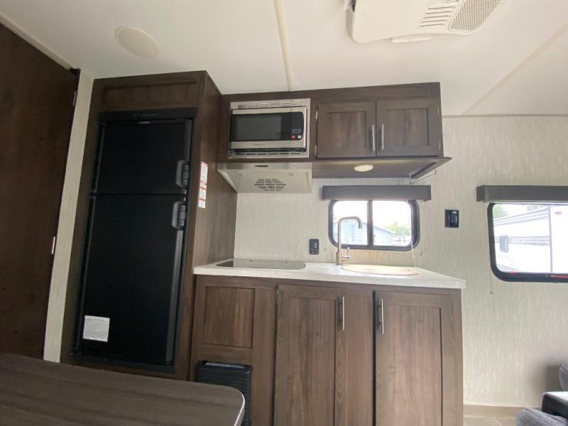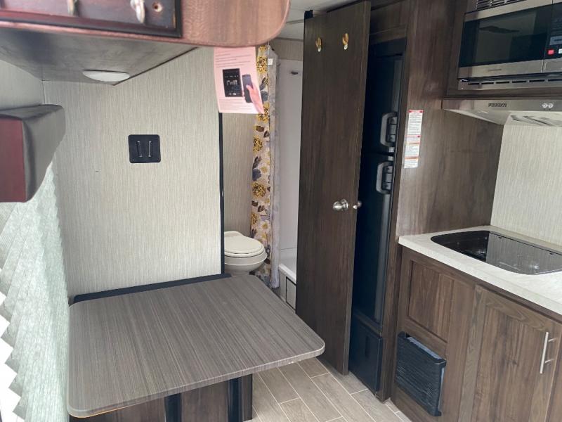 Whether you are a couple or a family that enjoys camping with your own accommodations, you will enjoy this trailer. From the Cherokee Sleep System with storage on each side and above, and the dinette that doubles as sleeping space for the kiddo, you can sleep on your own sheets each night. The full bathroom allows you to skip the public facilities, and the kitchen amenities will allow you to cook inside whenever you like. You will also find storage throughout the inside as well as along the exterior for your outdoor gear.