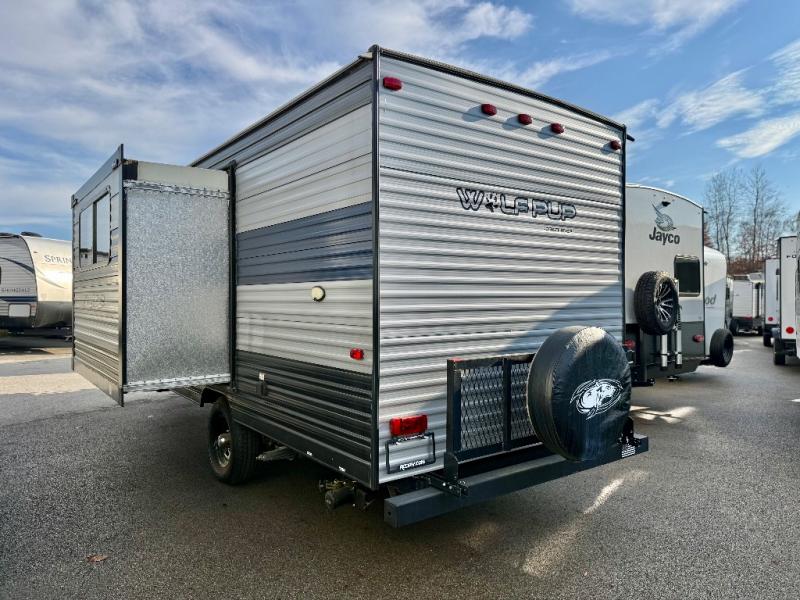 The Cherokee Wolf Pup travel trailer and toy hauler by Forest River are lightweight and easy to tow with ample storage for all your things. The aerodynamic radius front profile allows for better gas mileage, and the one-piece walkable decked roof allows you to easily clean off the unit after a fun weekend. You'll enjoy features such as USB charging stations to keep everyone's phones charged, a power awning with an LED light strip allowing you to stay outside longer, a seamless countertop, and an outside shower with hot and cold water to clean the dishes or even yourself, plus more! Pick the floorplan that works best for you, and start camping tomorrow!