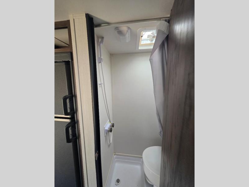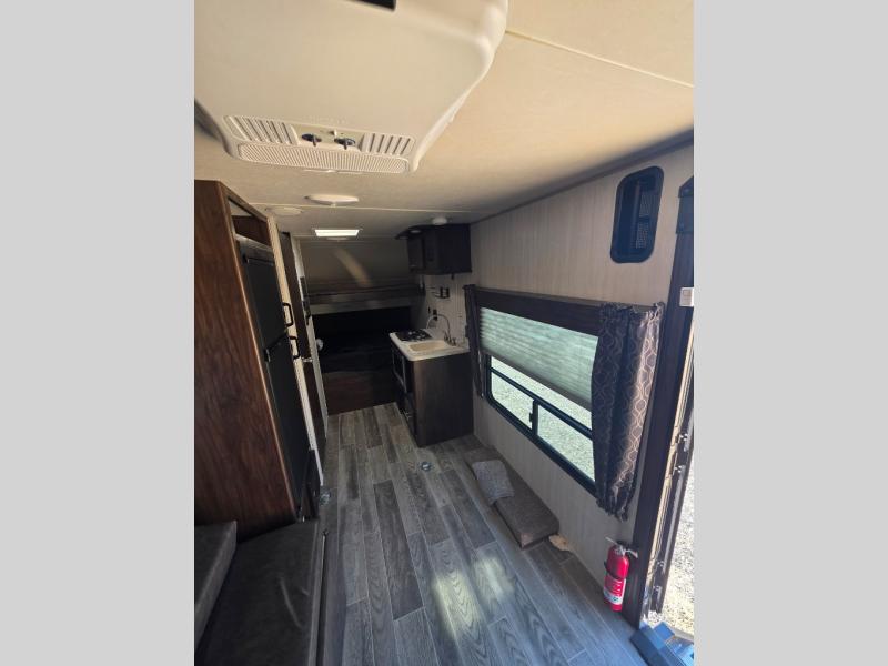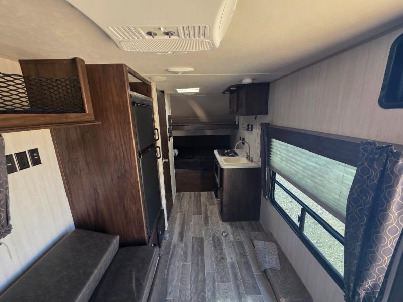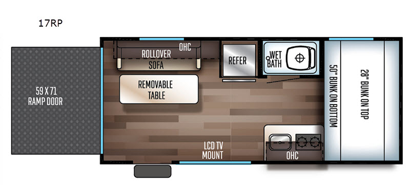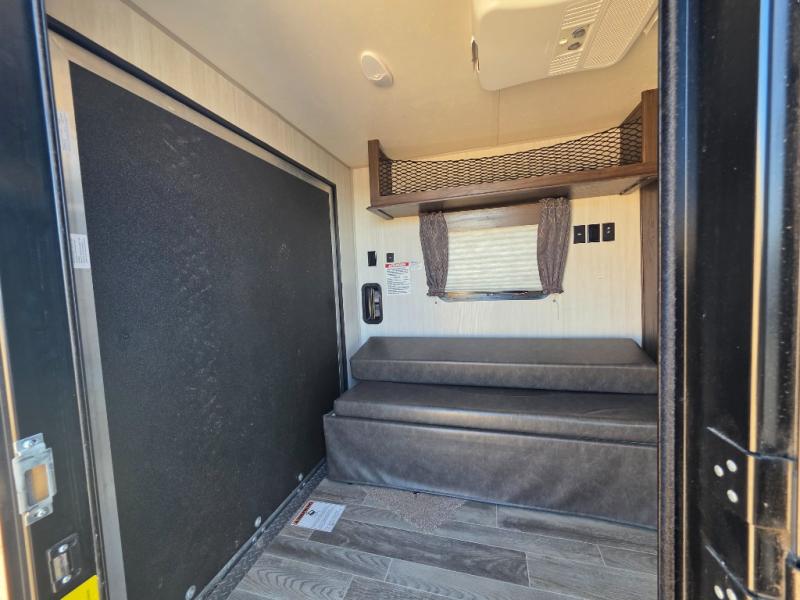 This toy hauler offers a 50" bottom bunk with a 28" bunk above for three people to sleep comfortably after each trail ride. You might even invite a friend to sleep on the rollover sofa at night. The removable table allows you to dine inside or outside, and the kitchen amenities give you everything you need to make warm meals. You can get cleaned off in the wet bath inside, or with the outdoor shower faucets. When it's time to return home, you can easily load up using the ramp door and side man door. Start having fun now!