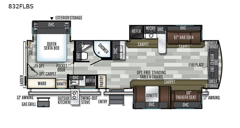 Are you ready to camp in style and comfort, then choose this triple slide out Flagstaff Classic Super Lite 832FLBS travel trailer. Inside, you can enjoy visiting with friends and family while sitting on either the 67" hide-a-bed sofa, the 60" theater seating with cup holders to keep your favorite beverage from spilling, or the booth dinette. No matter which spot you choose, you will enjoy the comforts of sitting by the cozy fireplace. The rear private bedroom will not disappoint with its queen Serta bed with nightstands on either side, a wardrobe to keep your clothes wrinkle free, and a vanity for you to get ready all before even leaving your room, plus you can add the optional TV for even more convenience! Outside, there are two awnings which provide protection from the sun and elements while you make meals out on the swing-out stove or the gas grill.