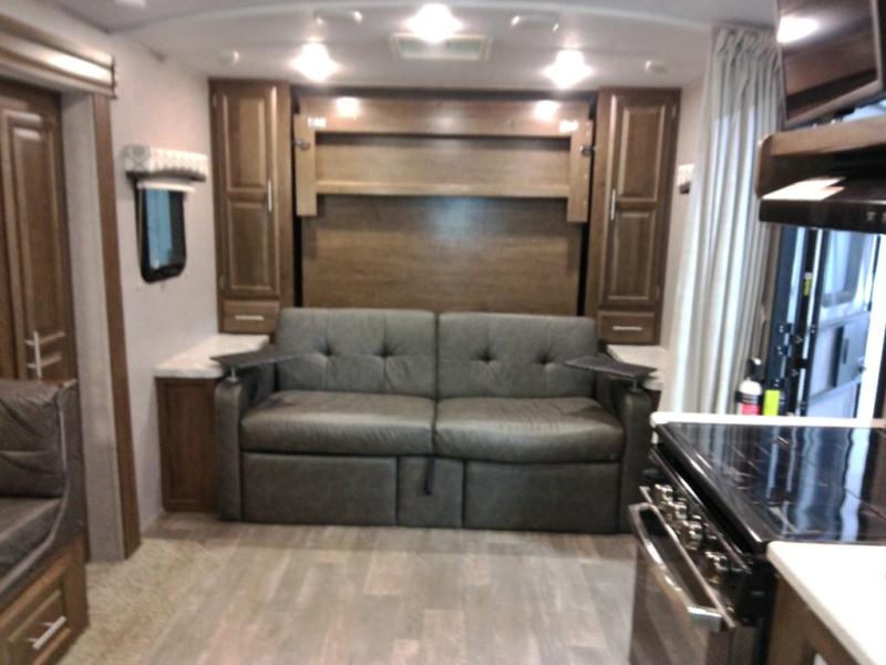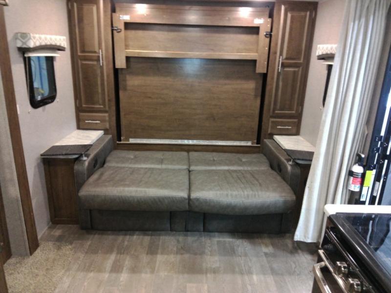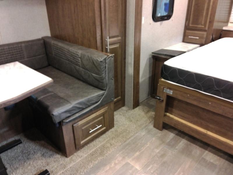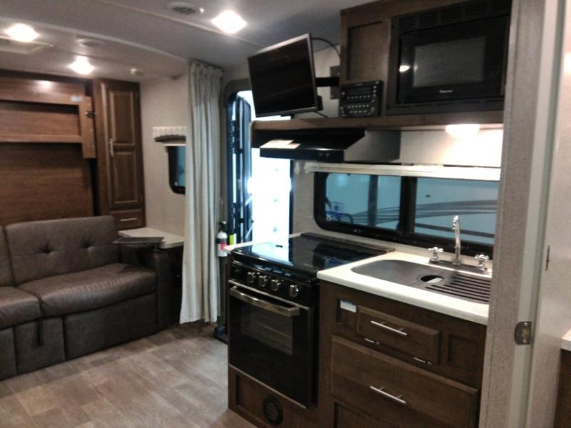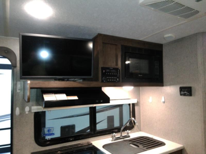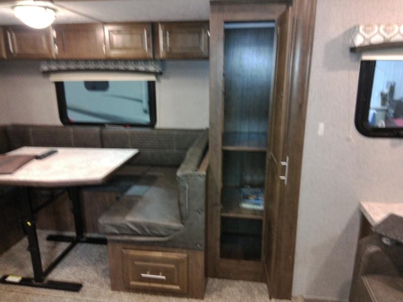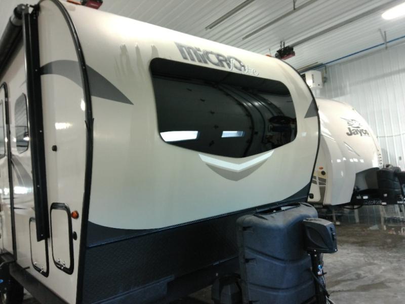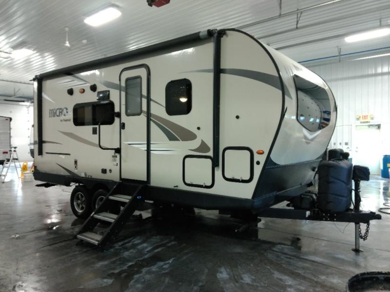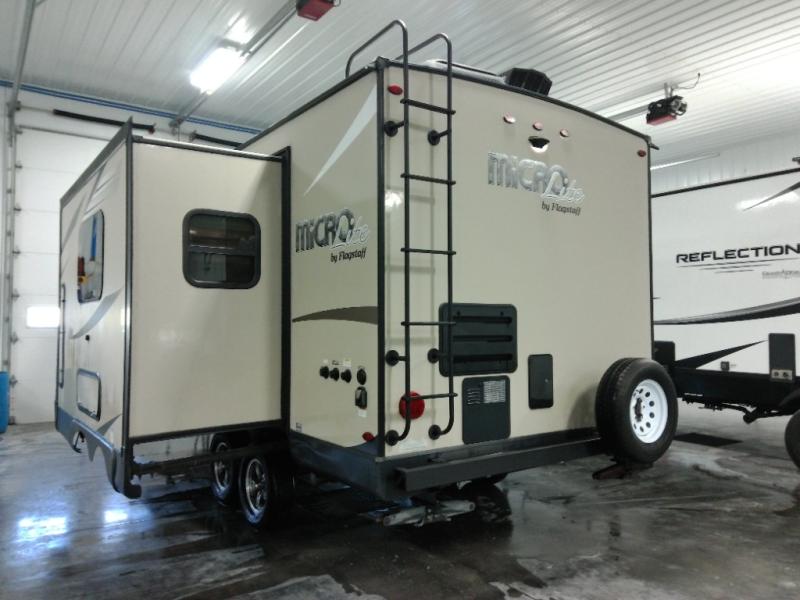 Pack your bags and get ready for your next camping trip with this Flagstaff Micro Lite travel trailer. You will enjoy the space the single slide provides, and within the slide is a U-shaped dinette where you can enjoy your meals. Fold out the Murphy bed each night for a good night's rest, and in the morning you can fold it away and enjoy a cup of coffee on the sofa. This unit features a kitchen with a three-burner cooktop and microwave, and you'll appreciate a pantry for snacks. Bring along the extra lawn chairs in the pass-through storage, and there is also an exterior storage for your luggage or tackle boxes