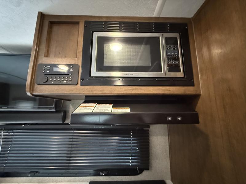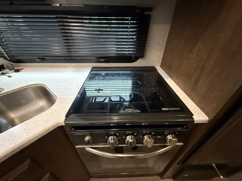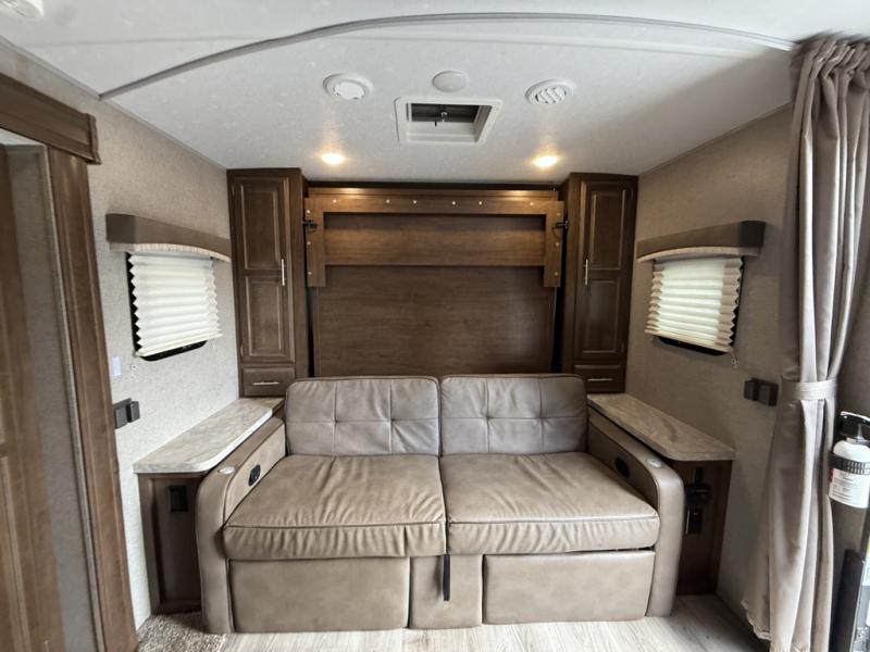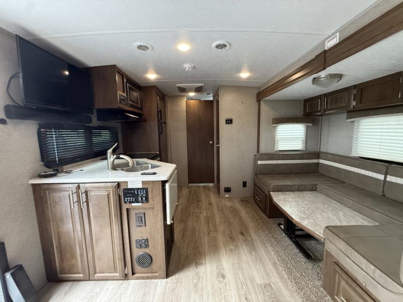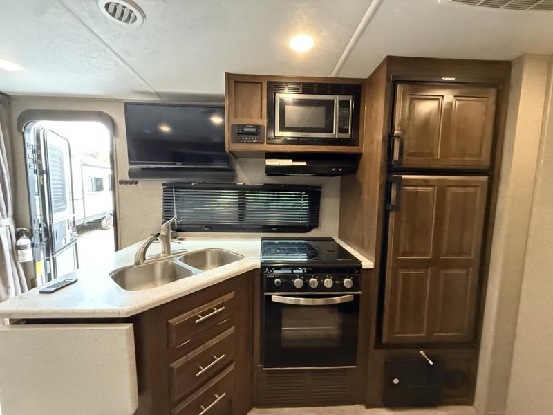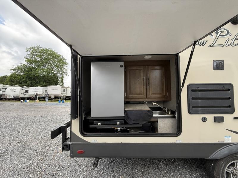 Are you ready to camp at your leisure? If so, then this Flagstaff Micro Lite travel trailer is ideal for you! There is sleeping space for four people in this unit, so you can camp with your kids or even an overnight guest or two. The single slide opens up the floor space so that you won't feel cramped. You'll enjoy a sofa in this model that conveniently converts into a Murphy bed for a good night's rest. This trailer features a kitchen with a three-burner cooktop, a countertop extension, and a double sink which makes clean up a breeze. Enjoy the evening air when you cook outdoors using the outside kitchen that includes a two-burner cooktop, a sink, and a refrigerator.