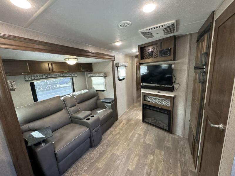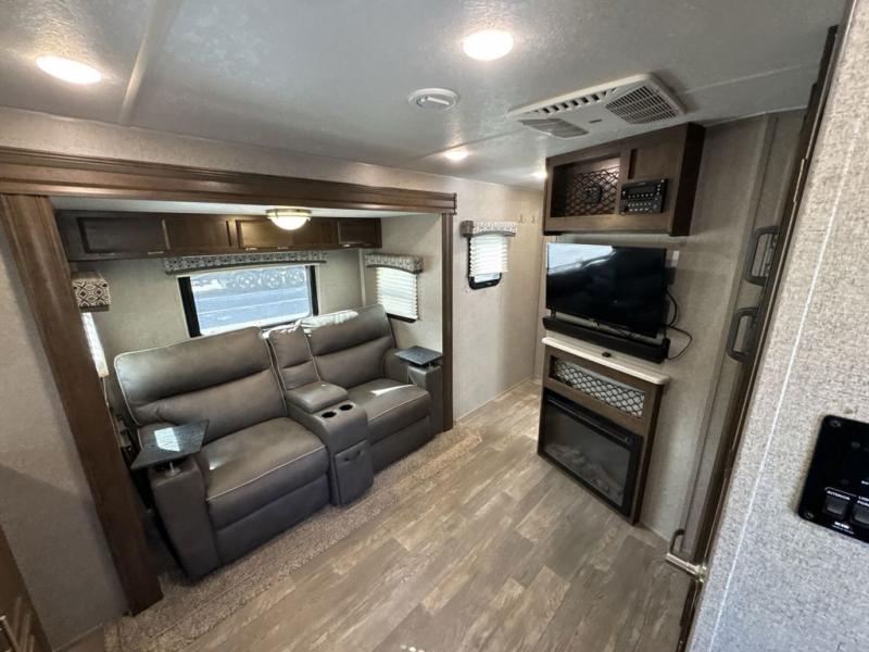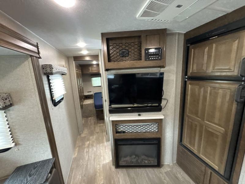 Your and your spouse will love this lightweight, easy-to-tow Flagstaff Micro Lite travel trailer. The dinette slide helps open up the living area and provides space for you to cook in the rear kitchen. After you've explored all day, come back to the trailer and enjoy a dinner at the dinette while the fireplace is going. The front bedroom with an RV queen bed is the perfect space to relax in each night. The bathroom is centrally located making it easy for everyone to get in and out. This trailer also has a drop-frame pass-through storage for your fishing poles and a convenient outdoor gas grill to enjoy cooking outside!