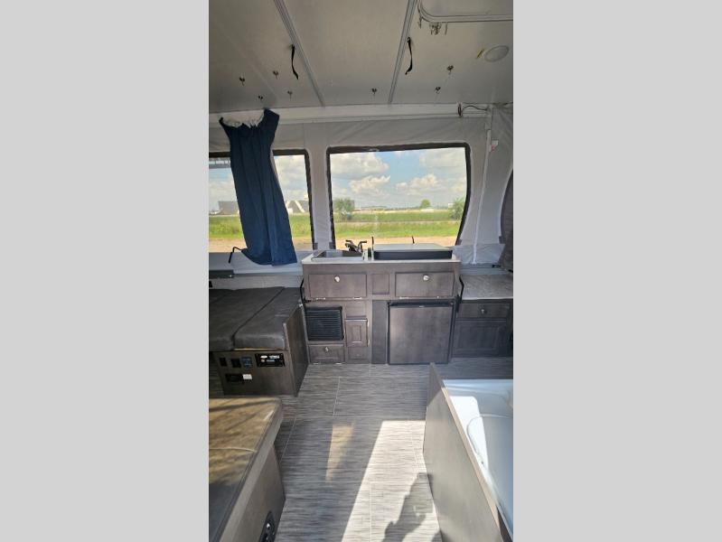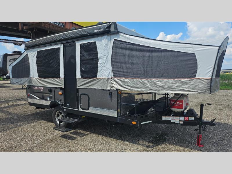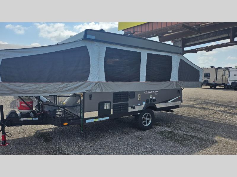 In each Flagstaff SE folding pop-up camper by Forest River, you will be delighted to find many features that will make camping life easier. Enjoy a heated mattress, a three-speed ventilation fan, and metal full-extension drawer guides in each unit. Stay connected to the outside world while you camp with a WiFi Ranger Sky 4 WiFi booster that comes standard in each unit. You'll love to sit outside in the evenings under the awning with LED lights, and with an outside speaker and a patio light, you may just stay out under the stars all night. These camping trailers have been constructed with an E-coated tubular steel frame, a chrome diamond-plated front and side skirt, and four E-Z crank-down stabilizer jacks with sand pads to make your camping trips safe and convenient.