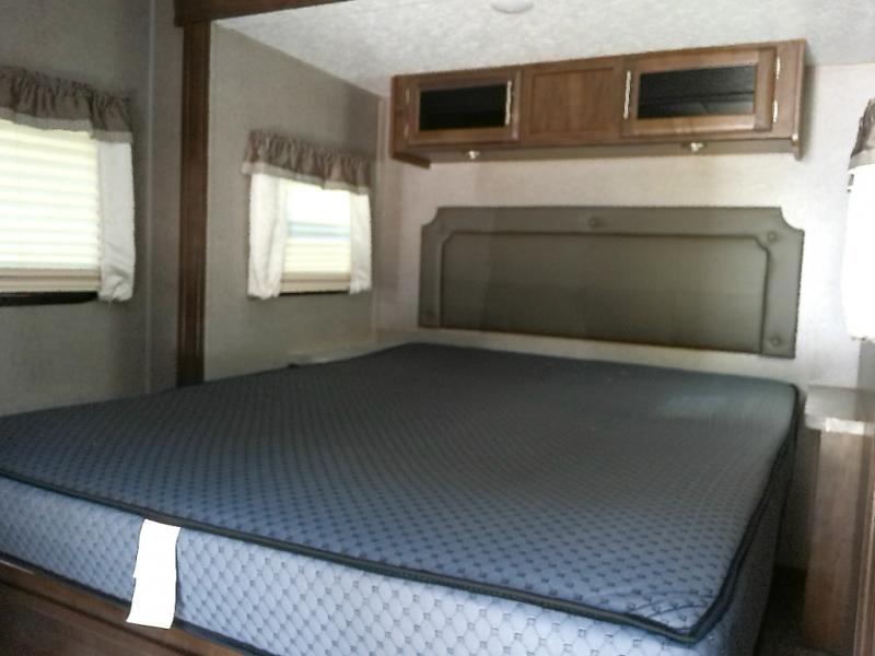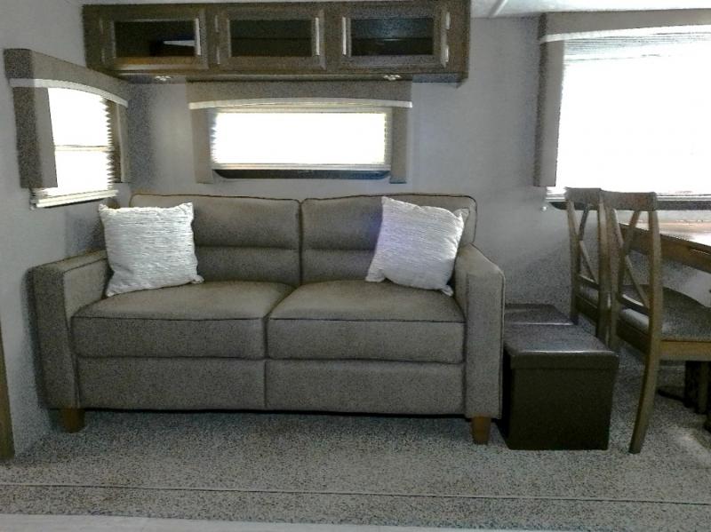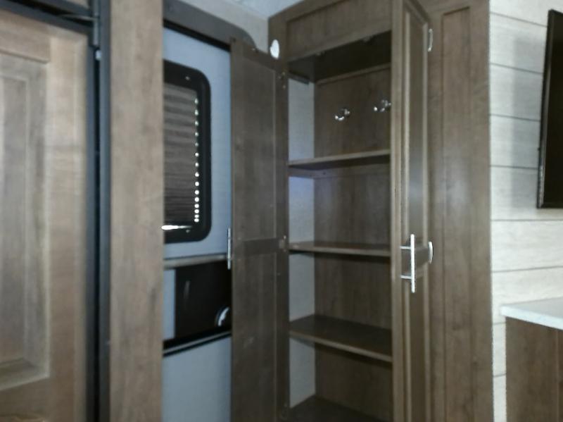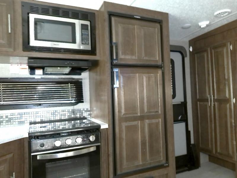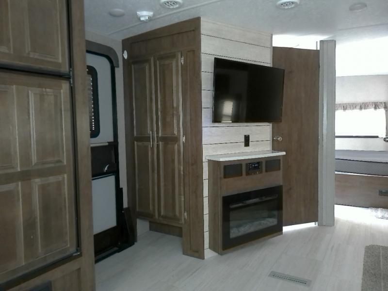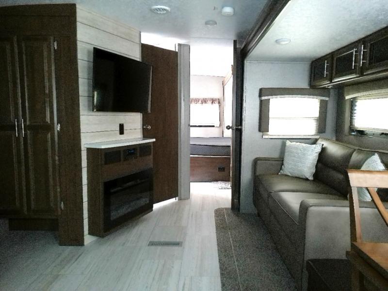 As you step inside this unit you will experience camping like never before! Just imagine a rear private bedroom with a queen Serta bed, nightstands on either side, and plenty of wardrobe space so that you can be dressed for any occasion. The two entry doors make for a smooth flow of traffic in and out of the unit. The best way to wind down your night is by grabbing a drink and lying back on the 67" hide-a-bed sofa in front of the cozy fireplace. If you want to experience the outdoors to its fullest, then get a camp chair and sit back underneath the 21' power awning with an LED light strip!