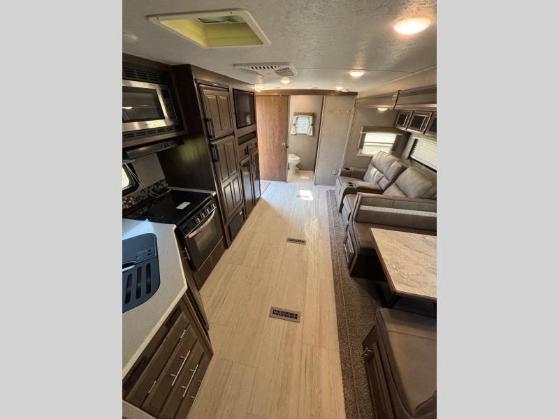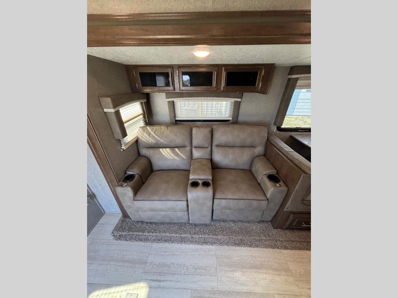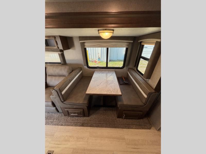 This travel trailer will allow you to enjoy any camping adventure! You can relax on the 67" hide-a-bed sofa during the day and transform it into added sleeping space along with the dinette if needed at night. In the front private bedroom, there is a wardrobe slide for your clothing storage needs, and a spot for an optional TV so you can catch the end of your movie or the news before turning in for the night. On the outside, you will find a 21' awning to create an outdoor living area, a gas grill, and front drop frame pass-through storage. You will also see additional exterior storage in the dinette slide out, plus many more features to enjoy!