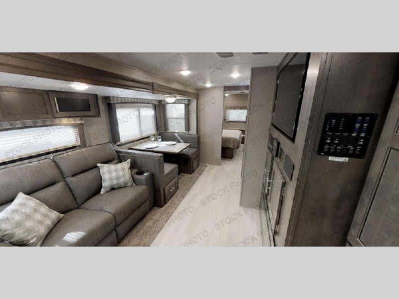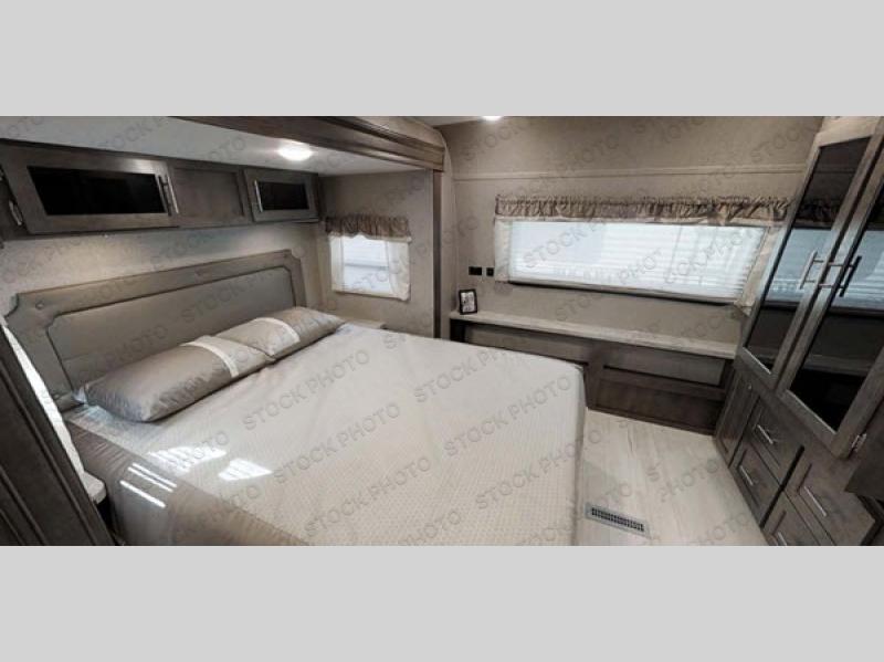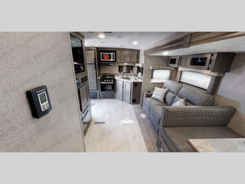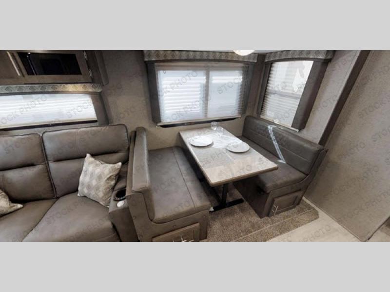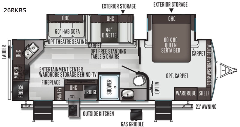 You will appreciate having a space savings door between the main living area in the front master bedroom which also includes a slide out queen bed, a wardrobe, a front wall countertop with storage below and the second entry/exit door into the trailer. You don't have to go through the rear kitchen to exit the trailer for a morning walk or to relax under the power awning. You might like to make breakfast outside on the outdoor kitchen or use the gas griddle, yet if it's chilly head back inside to all the appliances needed to make a warm meal. You can watch the TV within the entertainment center that includes wardrobe storage while relaxing on the hide-a-bed sofa or booth dinette slide. And you might decide to add a free standing table with chairs and/or theatre seating option if you like.