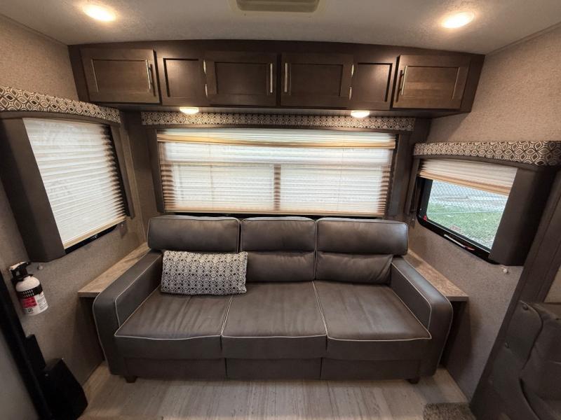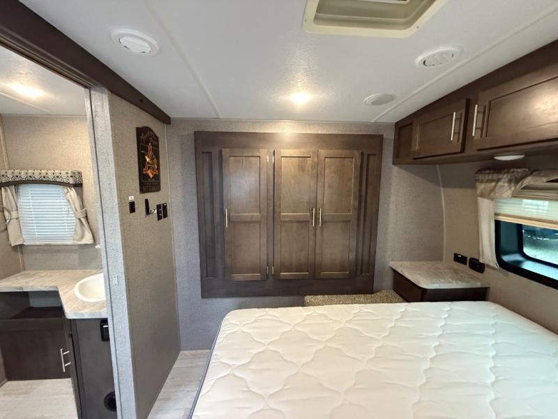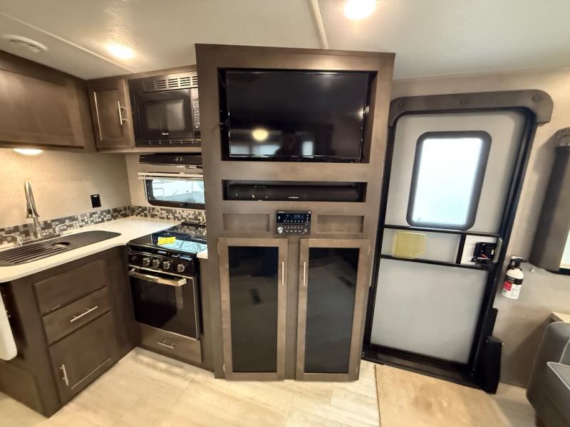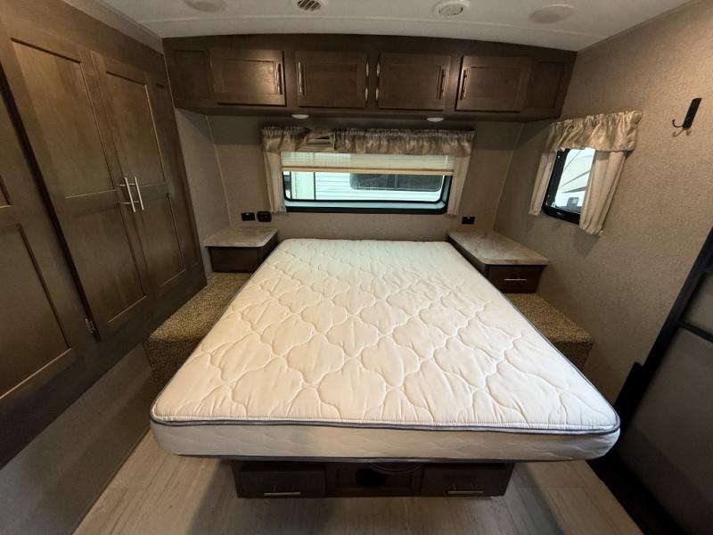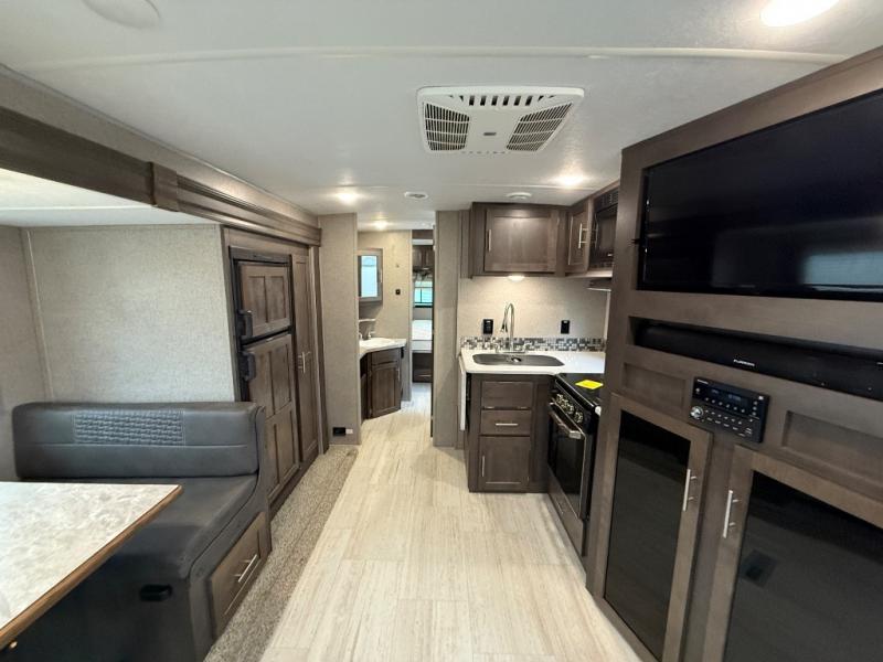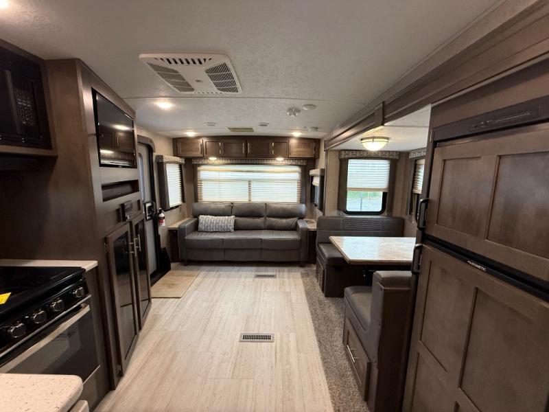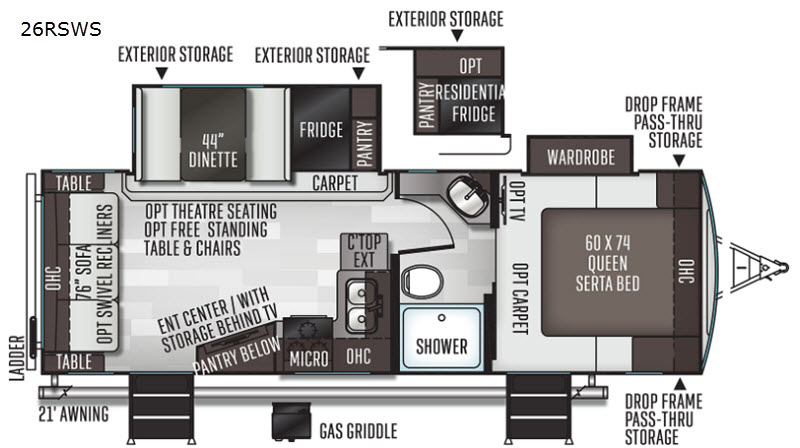 Space, space, and more space is what you will find throughout this travel trailer. Along the exterior there is a drop frame pass-through storage for all of your exterior camping gear such as outdoor camping chairs, a bag of charcoal and even fishing poles. You will also find more exterior storage compartments. Inside, you can load up stuff in the overhead cabinets, bedroom wardrobes, and behind the TV in the living room. You may also select a few options throughout this model such as a residential refrigerator, swivel recliners, and theatre seating or a free-standing table and chairs. Take a look!