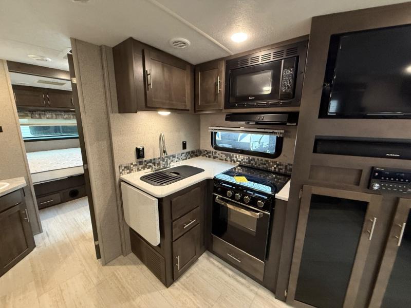 It will be easy to make plenty of memories with your family when you choose to camp with a Flagstaff Super Lite travel trailer by Forest River. These models have beautiful slatewood cabinetry with hardwood cabinet doors and drawer fronts, solid surface kitchen countertops, and ceiling LED 12 volt interior lighting. The 6 sided aluminum cage construction offers lightweight towing, the radius roof with interior vaulted ceilings give you more headroom, the WiFi ranger Wifi booster Sky 4, the enclosed underbelly, and the power awning with adjustable rain dump and LED light strip, will give you years of enjoyment!
