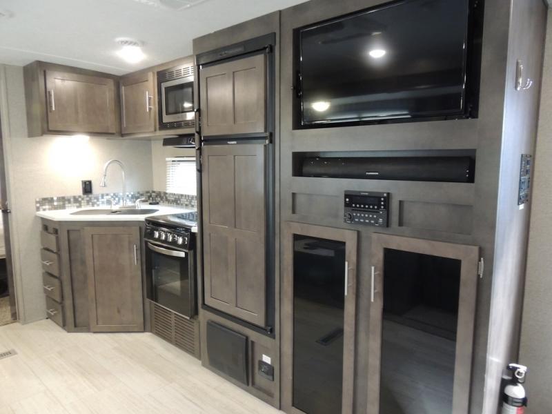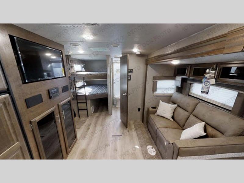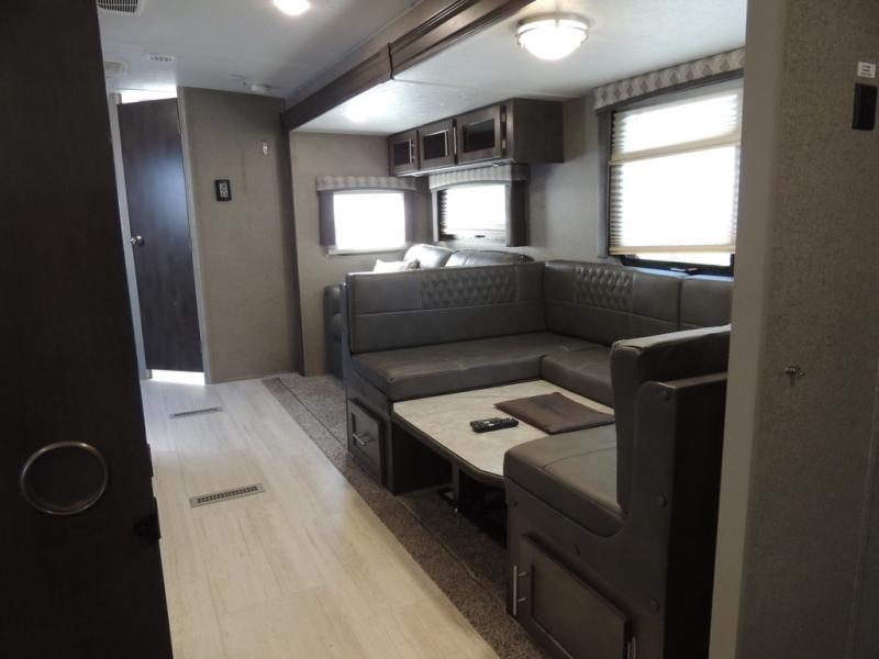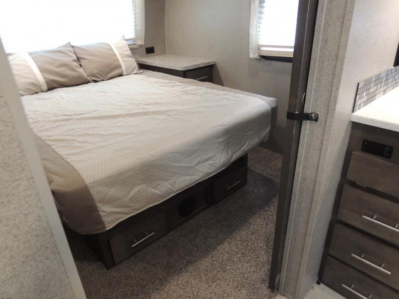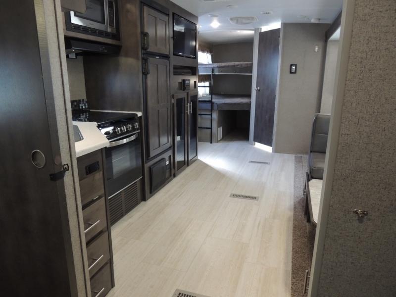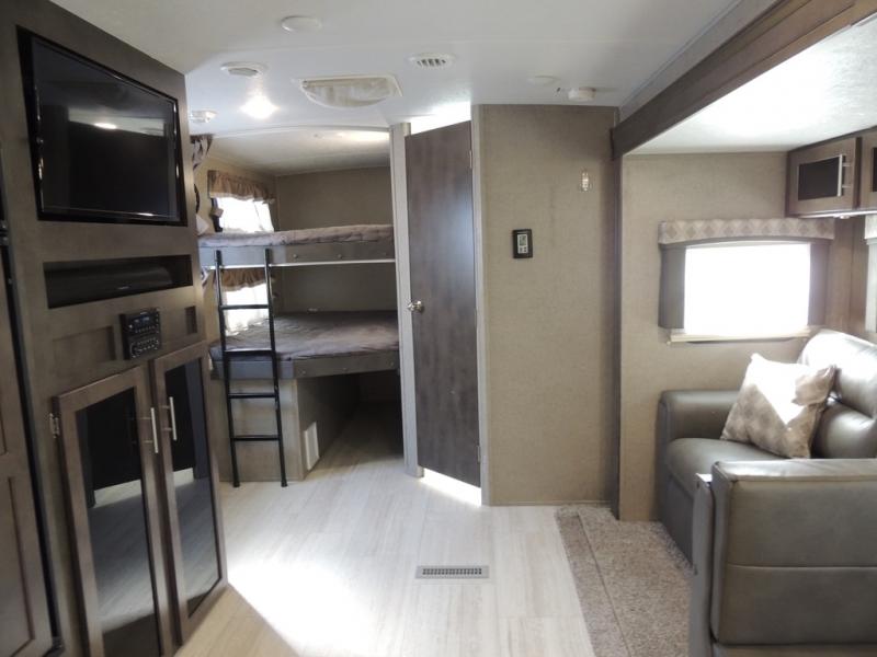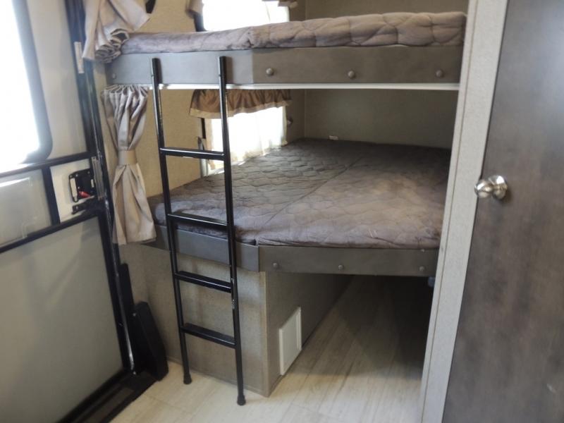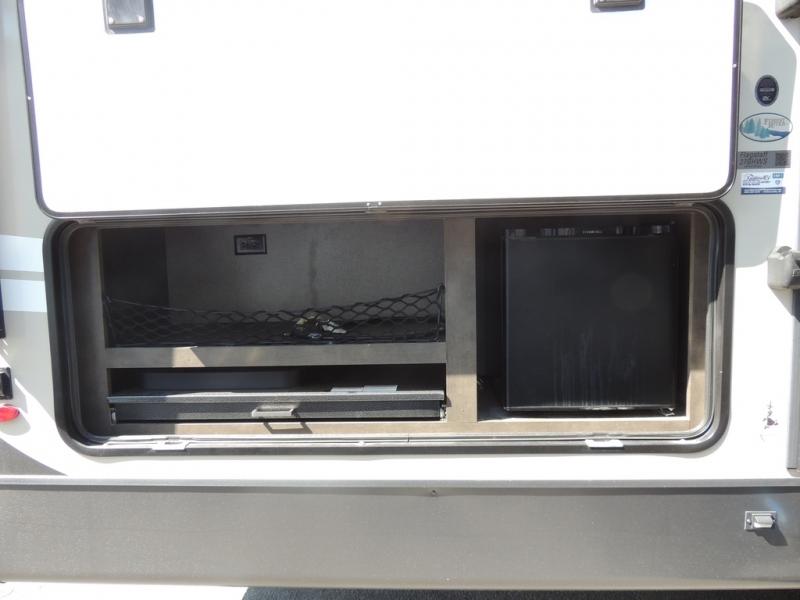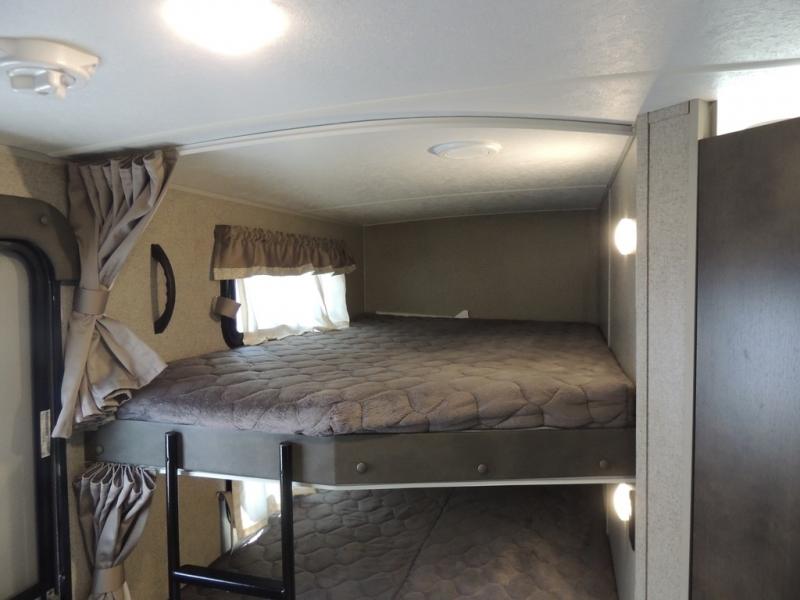 This travel trailer is loaded with all of the amenities you need, yet light weight making it a breeze to tow! Before you enter come check out the exterior features. You will enjoy the convenience of the outside kitchen with a pull-out cooktop and a refrigerator. Nearby there is also a gas griddle The drop frame pass-through storage area is ideal for your larger items such as an outdoor mat, bags of charcoal, firewood and such. Inside your kids can sleep comfortably on the double size bunks, and you will enjoy the private front bedroom. You can also cook and shower in this trailer, so no more hotel expenses or public facilities needed!
