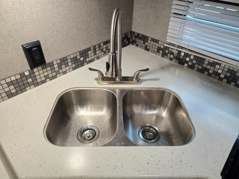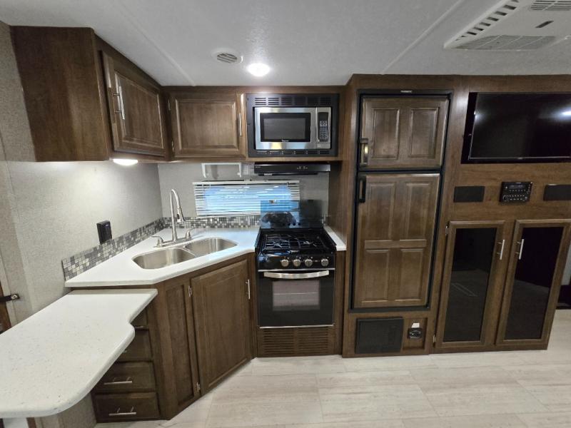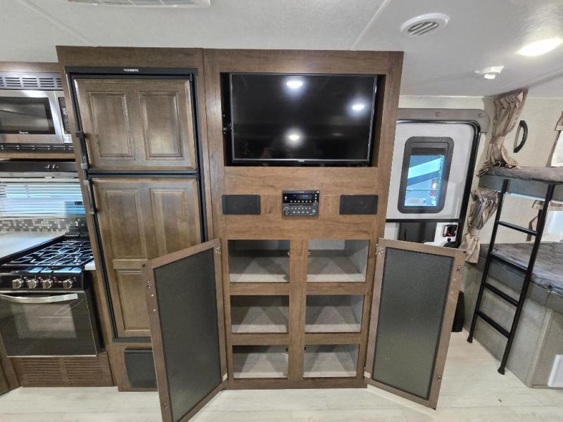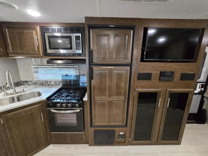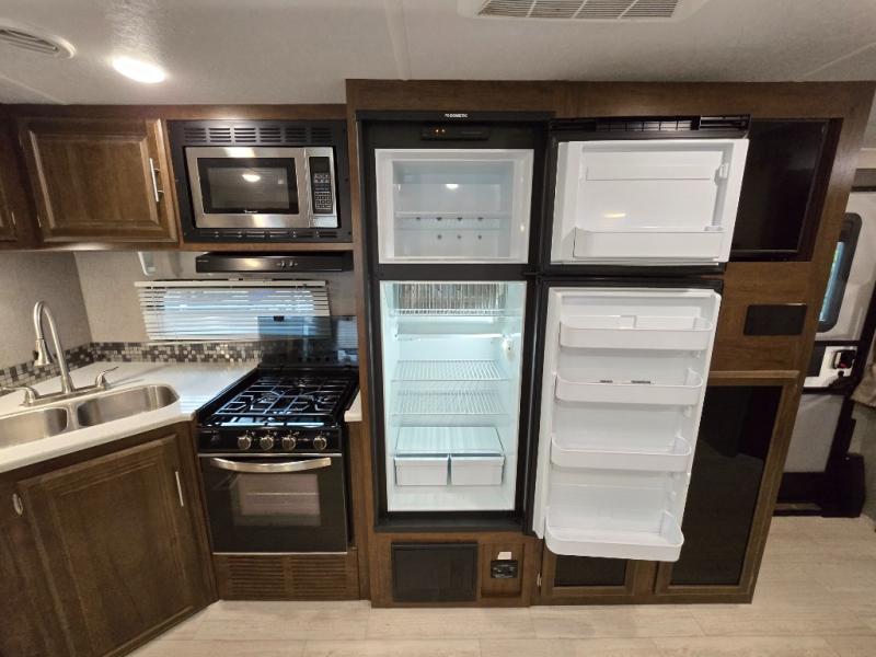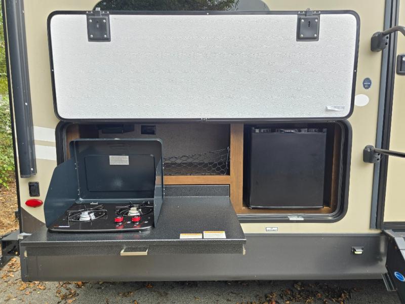 This travel trailer is loaded with all of the amenities you need, yet light weight making it a breeze to tow! Before you enter come check out the exterior features. You will enjoy the convenience of the outside kitchen with a pull-out cooktop and a refrigerator. Nearby there is also a gas griddle The drop frame pass-through storage area is ideal for your larger items such as an outdoor mat, bags of charcoal, firewood and such. Inside your kids can sleep comfortably on the double size bunks, and you will enjoy the private front bedroom. You can also cook and shower in this trailer, so no more hotel expenses or public facilities needed!