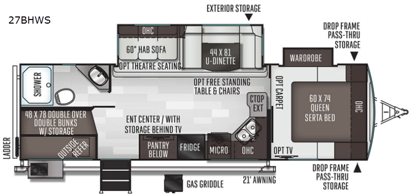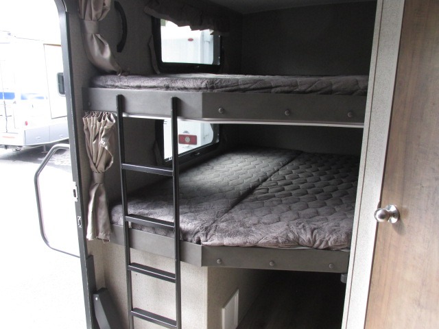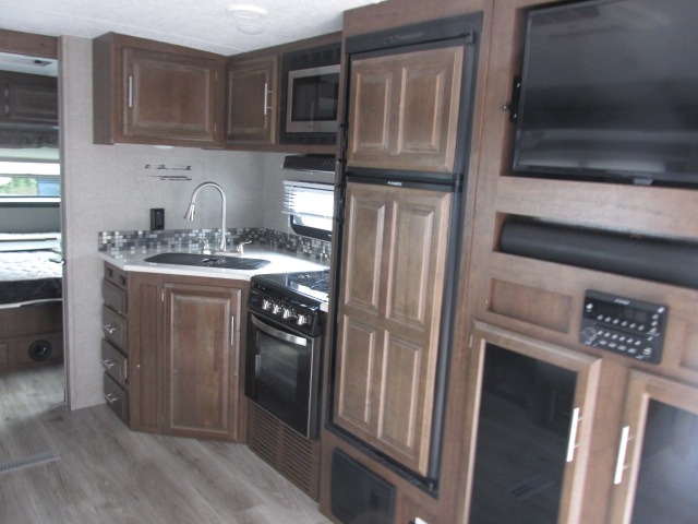 This travel trailer is loaded with all of the amenities you need, yet light weight making it a breeze to tow! Before you enter come check out the exterior features. You will enjoy the convenience of the outside kitchen with a pull-out cooktop and a refrigerator. Nearby there is also a gas griddle The drop frame pass-through storage area is ideal for your larger items such as an outdoor mat, bags of charcoal, firewood and such. Inside your kids can sleep comfortably on the double size bunks, and you will enjoy the private front bedroom. You can also cook and shower in this trailer, so no more hotel expenses or public facilities needed!