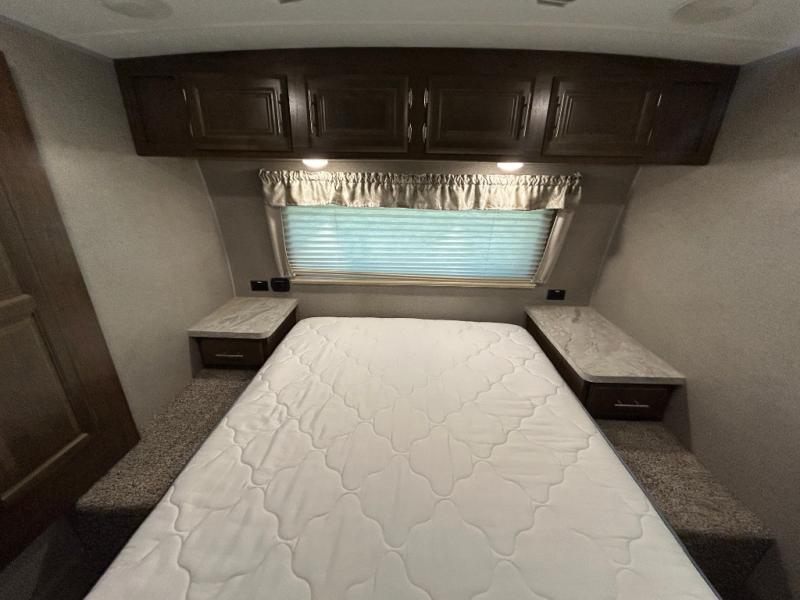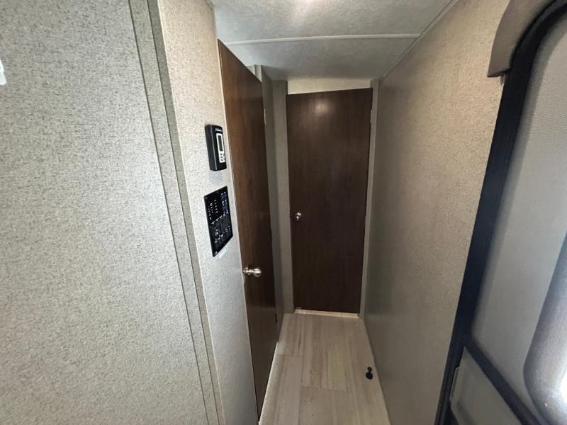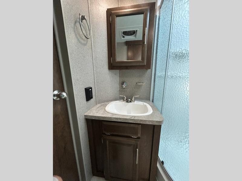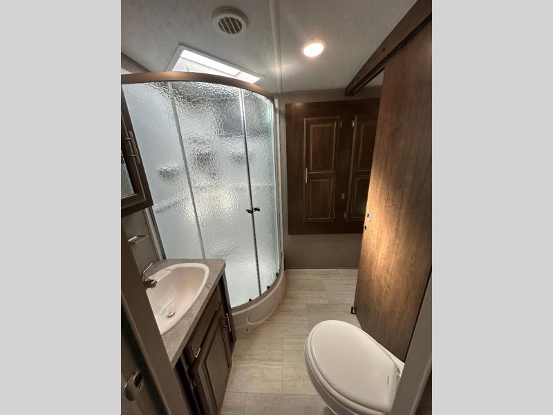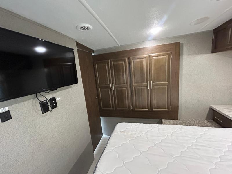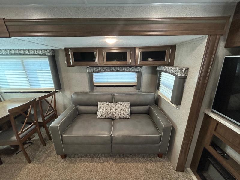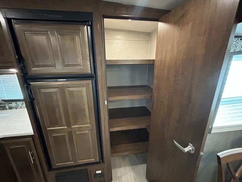 You want choices and you will get them when you camp! You can choose to cook in the rear kitchen with full appliances and a pantry for lots of storage, or outdoors on the mini outside kitchen and/or the gas griddle. There is plenty of seating as well so make your selection from theater seats, a hide-a-bed sofa or a booth dinette. You may choose to watch the TV and stay warm from the fireplace when you aren't outside by the campfire. You might like to add the optional free standing table and chairs if the booth dinette isn't to your liking. And the master bedroom will not disappoint with a queen bed, a slide out with clothing storage, and linen storage that falls into the bathroom.