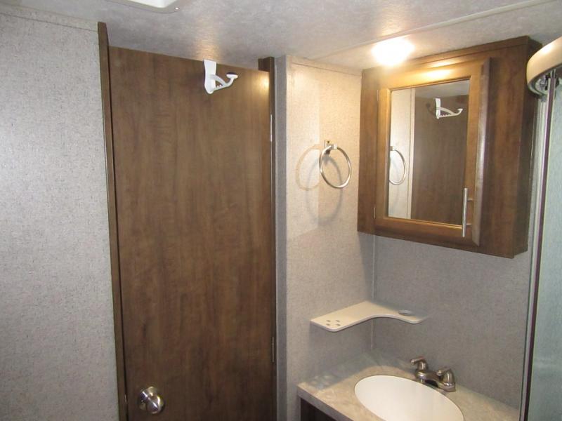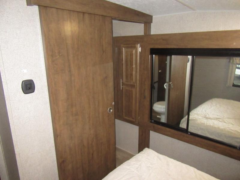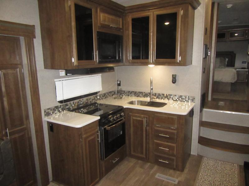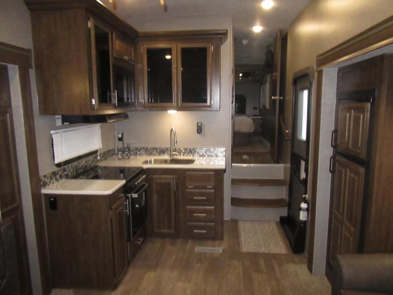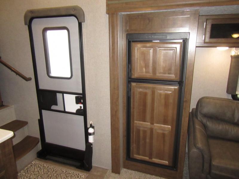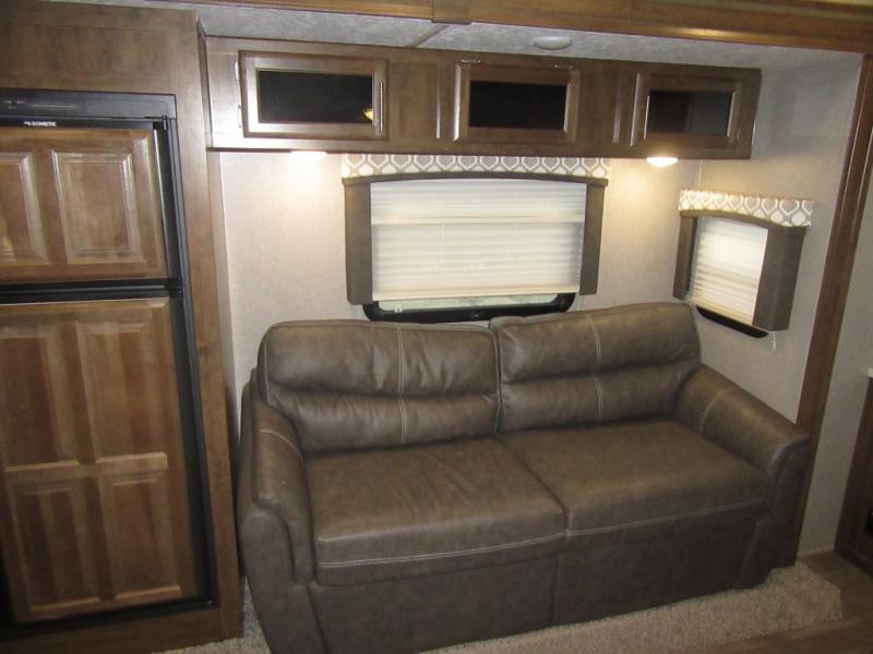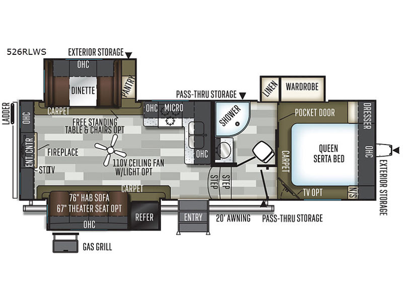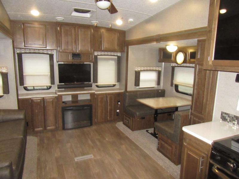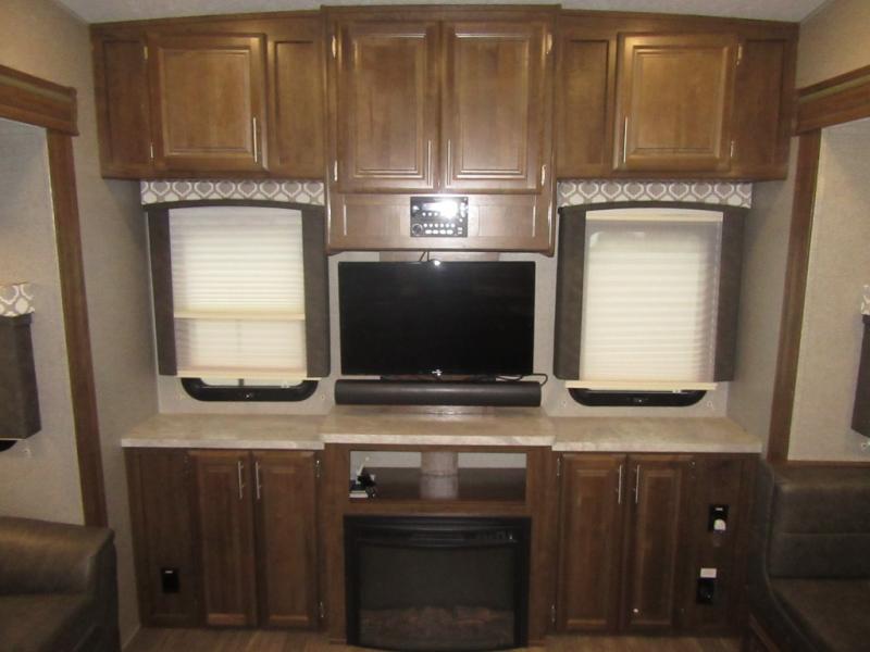 See how easy your next camping trip can be with this triple slide out fifth wheel. In the evening you can plan to relax in the living area at the 76" hide-a-bed sofa or at the dinette. You might even decide to choose the optional theater seating and/or the free standing dinette option if you like. From the furniture you can easily watch the TV that is located along the rear wall which also includes an entertainment center and fireplace. You will love the L-shaped kitchen when making meals, the convenience of the double entry bathroom, and the master bedroom's storage. Outside you will find pass-through storage for your larger camping items, a gas grill, and even a ladder along the rear. Take a look!
