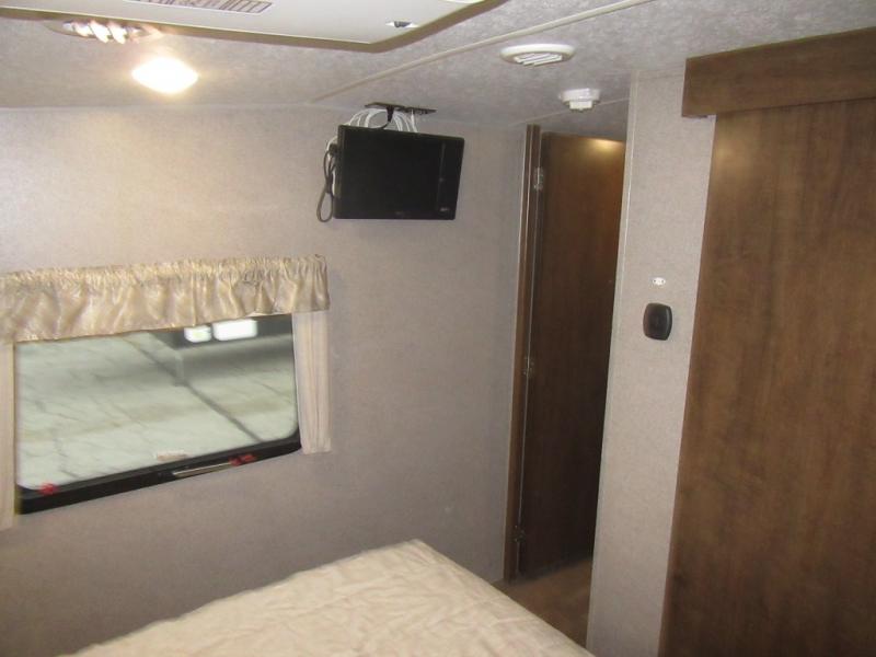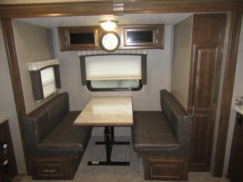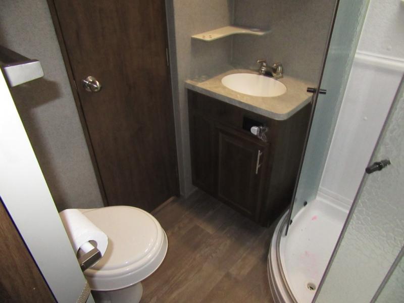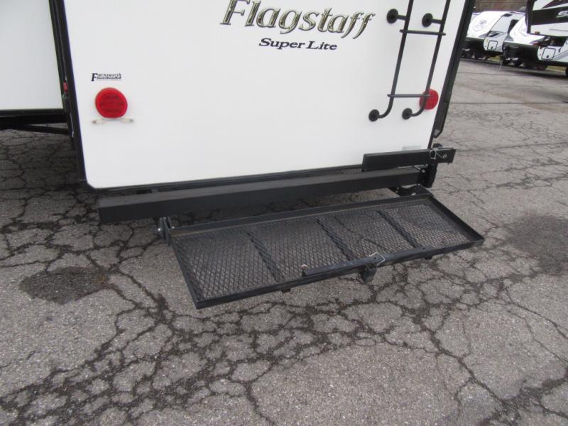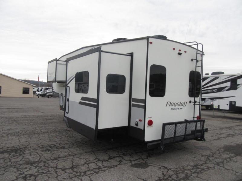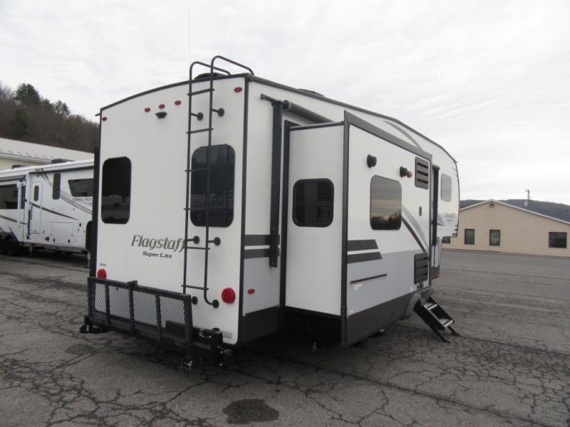 It will be easy to make plenty of memories with your family when you choose to camp with a Flagstaff Super Lite fifth wheel by Forest River. These models have beautiful slatewood cabinetry with solid wood cabinet doors and drawers, a LCD TV with an upgraded soundbar speaker system, and flush mount ceiling LED 12 volt interior lighting with multiple switches. The 6 sided aluminum cage construction offers lightweight towing, the radius roof with interior vaulted ceilings give you more headroom, the WiFi ranger Sky 4, the enclosed underbelly, and the power awning with adjustable rain dump and LED light strip, will give you years of enjoyment!