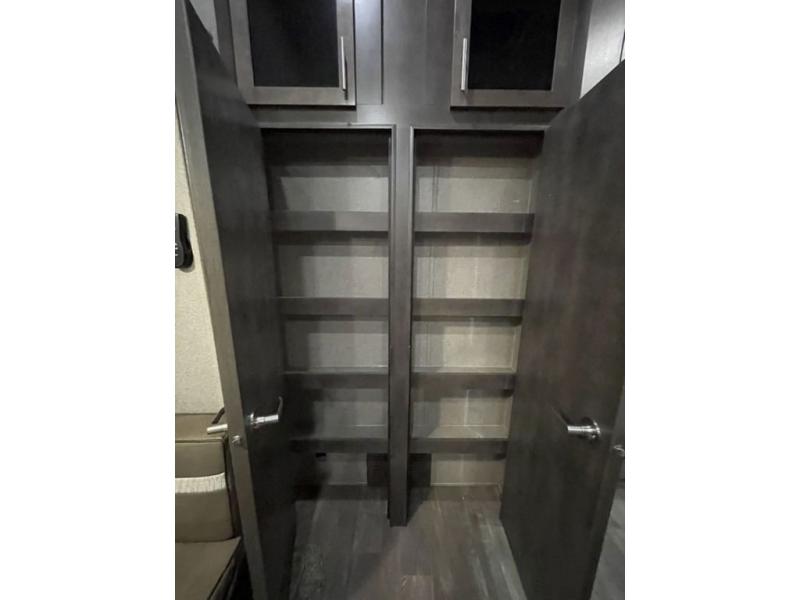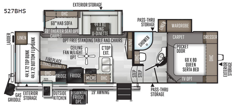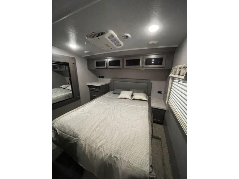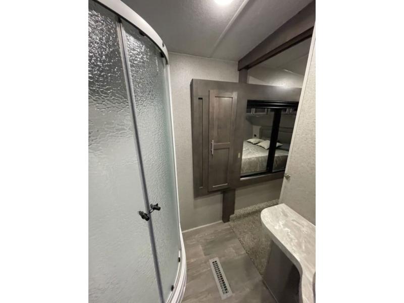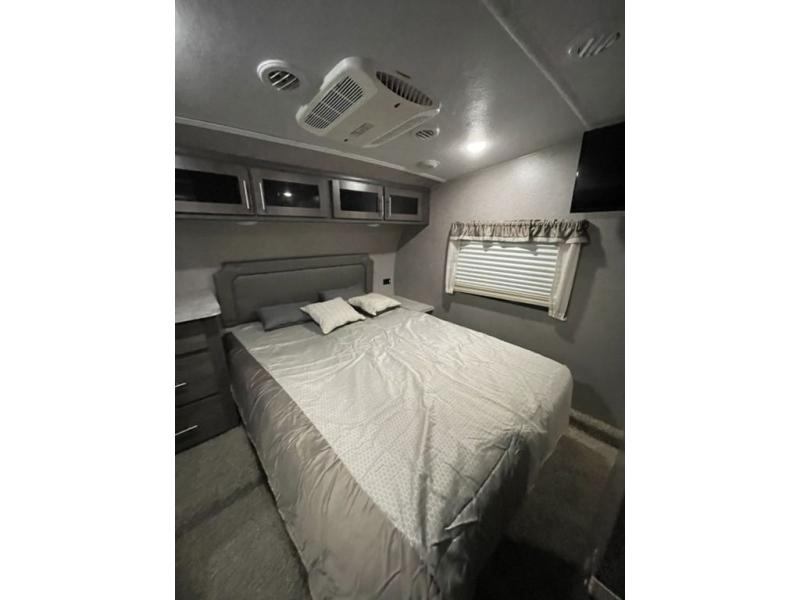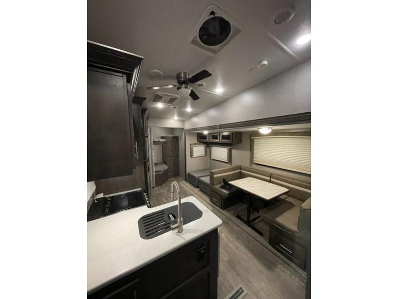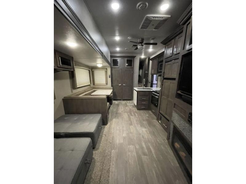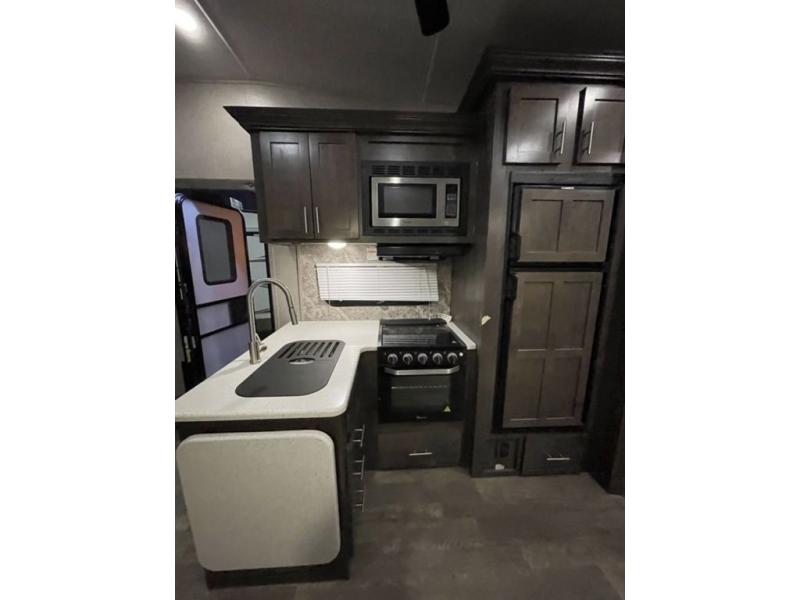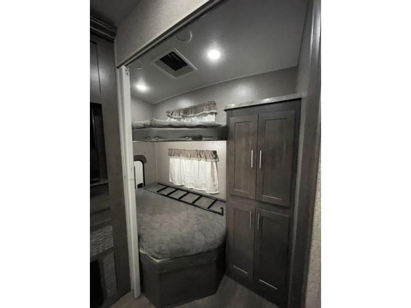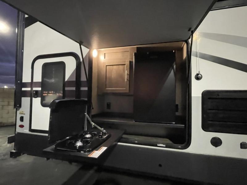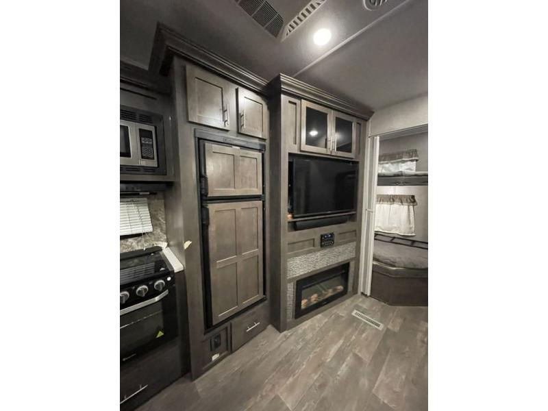 Daydreaming about a fifth wheel with bunk beds for the kids, a private master bedroom for you, and an outside kitchen to make your famous breakfast burritos? Just imagine you and your family at your favorite campsite with this fifth wheel already set up for a week-long vacation. You can cook inside at the L-shaped kitchen counter with full amenities or outside on the outdoor kitchen with a swing-out stove as well as a gas griddle in the rear. Your kiddos will enjoy sleeping in the RV thanks to the bunk beds in the rear, and you will love all the storage when traveling. The main living area offers a fireplace, TV and seating to relax. You even have a few options to make this the perfect RV!