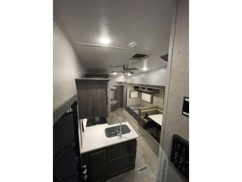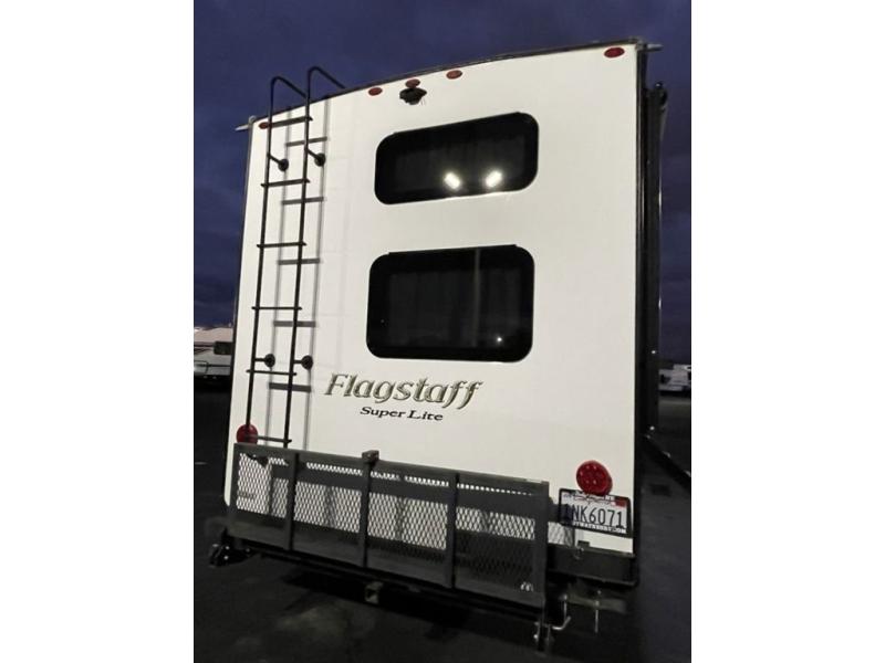 It will be easy to make plenty of memories with your family when you choose to camp with a Flagstaff Super Lite fifth wheel by Forest River. These models have beautiful slatewood cabinetry with solid wood cabinet doors and drawers, decorative cove trim along the ceiling and overhead cabinets, and flush mount ceiling LED 12 volt interior lighting with multiple switches. The 6 sided aluminum cage construction offers lightweight towing, the radius roof with interior vaulted ceilings give you more headroom, the WiFi Ranger in select floorplans, the enclosed underbelly, and the power awning with adjustable rain dump and LED light strip, will give you years of enjoyment!