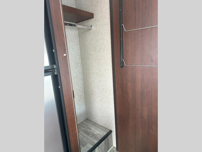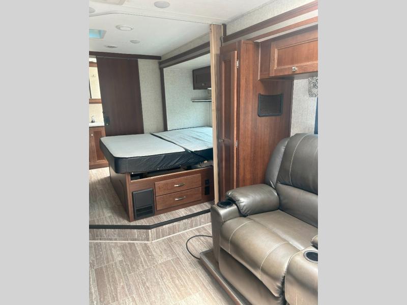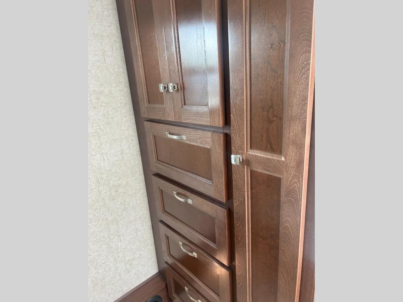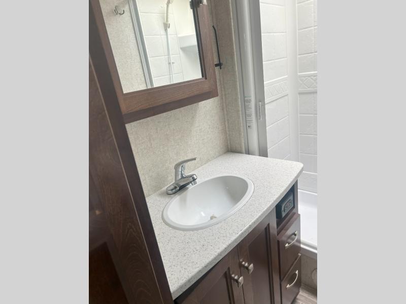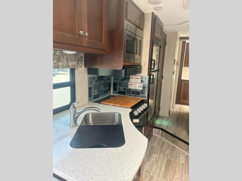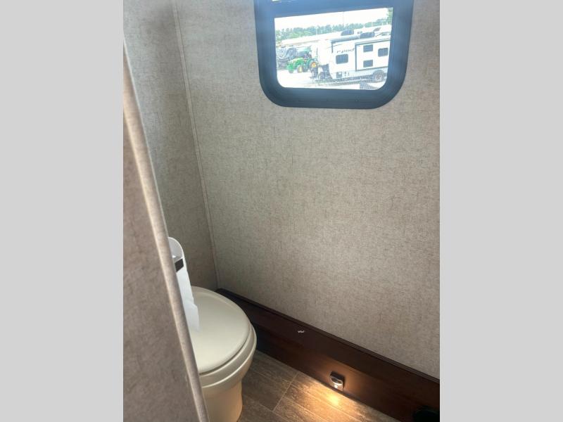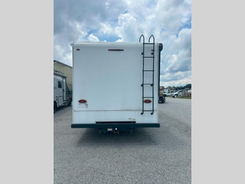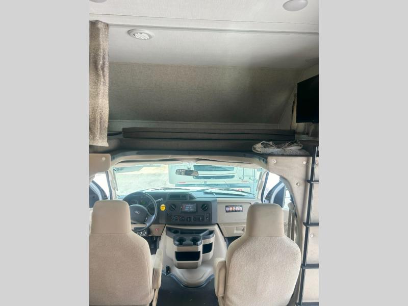 Easily take this Class C motorhome on your next tailgate or camping adventure. You have a full rear bath with a dresser linen and wardrobe to keep your towels close by. The U-shaped dinette has seatbelts for keeping your guests safe while you are on the road and it folds down into a place for sleeping at night if needed. You can sleep up to five or six individuals using the bunk over the cab, the queen bed, and the dinette. You even have the option to add an optional 28" TV outside if you wish.