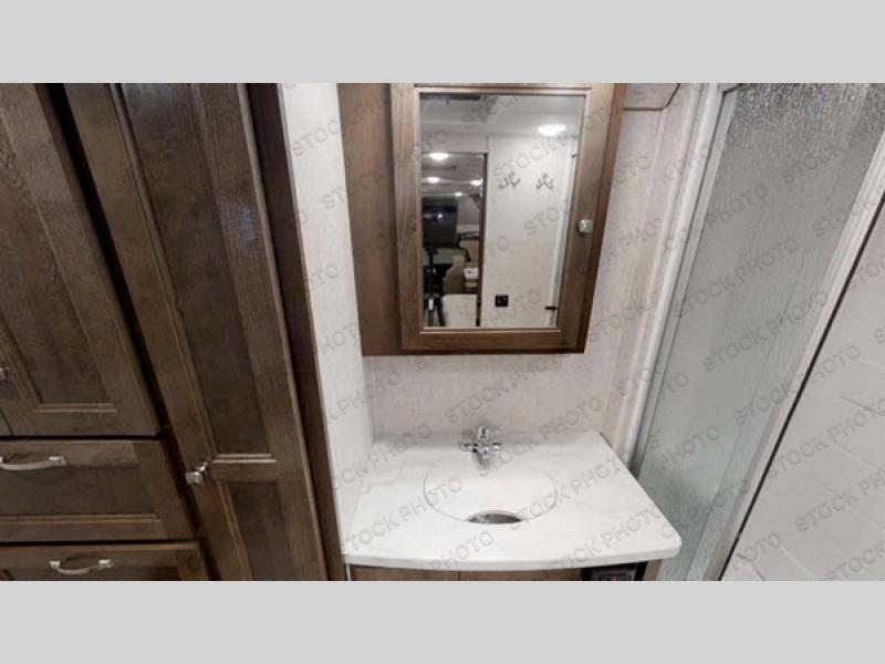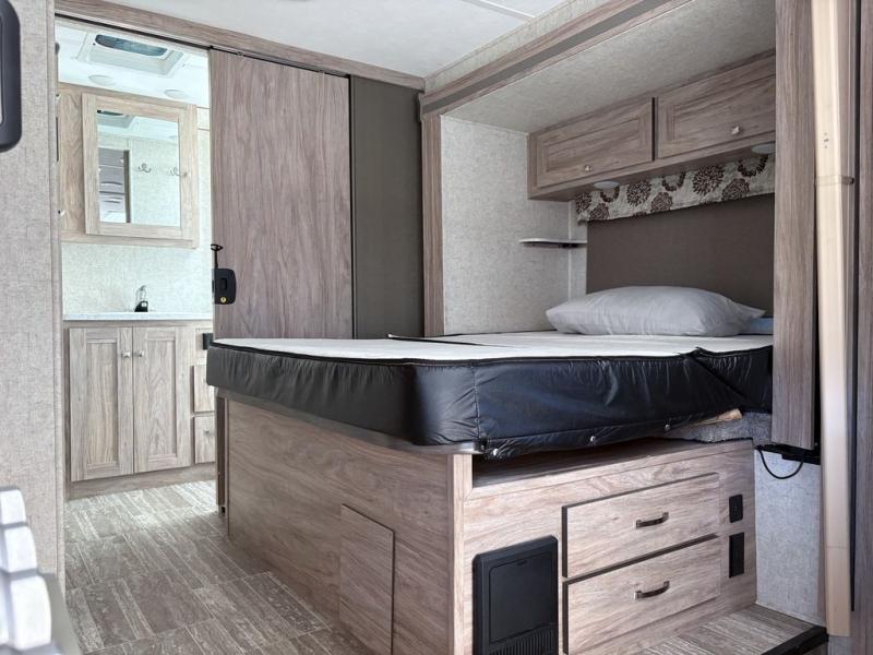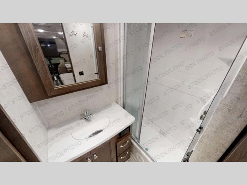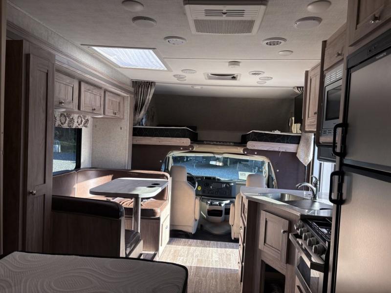 Easily take this Class C motorhome on your next tailgate or camping adventure. You have a full rear bath with a dresser linen and wardrobe to keep your towels close by. The U-shaped dinette has seatbelts for keeping your guests safe while you are on the road and it folds down into a place for sleeping at night if needed. You can sleep up to five or six individuals using the bunk over the cab, the queen bed, and the dinette. You even have the option to add an optional 28" TV outside if you wish.