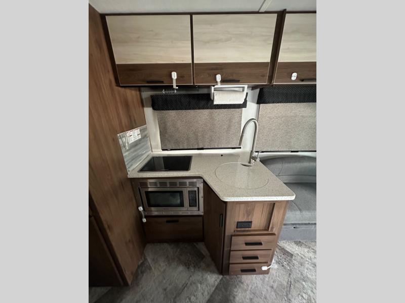 Pack your bags and get ready for a trip across states in this motorhome that includes many at-home comforts. You will find a comfortable queen bed slide out in the rear corner bedroom and a privacy curtain you are sure to appreciate. This model includes four seatbelts so you can bring along a couple extra ride-along guests, and the cab-over bunk allows sleeping space for one to two. Enjoy your meals at the L-shaped dinette and the lounge chair with a flip-up lounge table provides additional seating space, as well as the swivel captain's seats that can turn around to be a part of the conversation. You'll find all the kitchen amenities to create meals each day, including a three burner range, a convection microwave, and the 10 Cu.Ft. 12V refrigerator can hold all perishables.