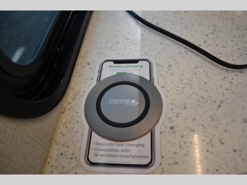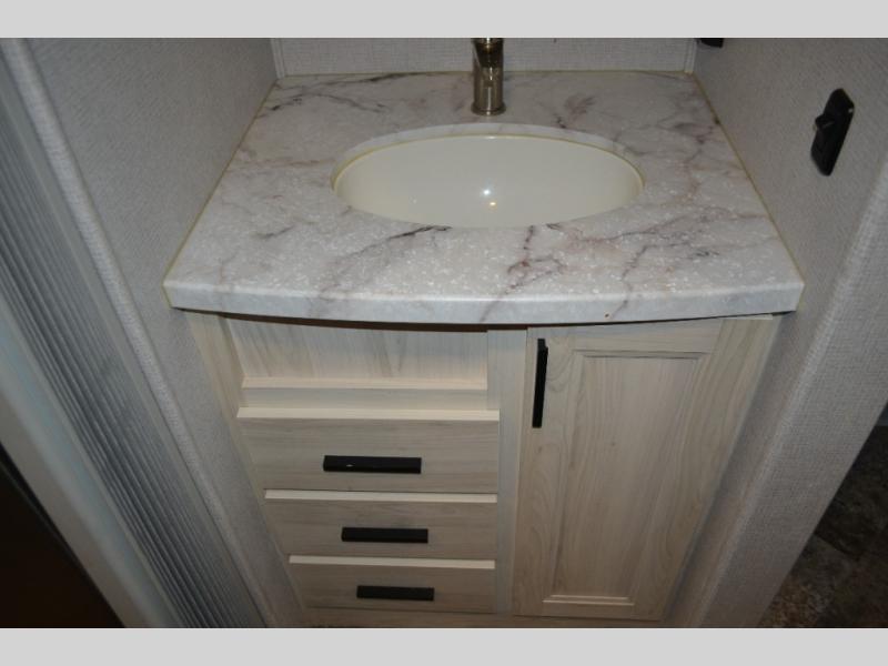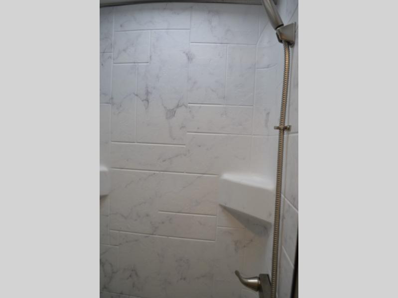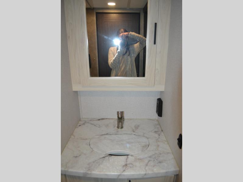 The kitchen comes fully equipped with everything you need on the road — a cooktop, convection microwave, large refrigerator, and plenty of storage for pantry items and cookware. The bathroom includes a full stand-up shower and great storage space, making travel days simple and convenient.