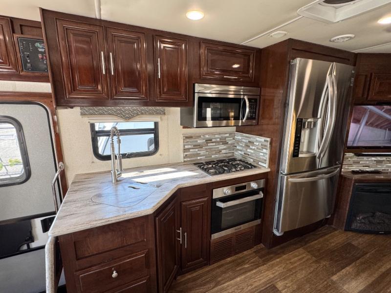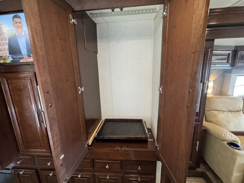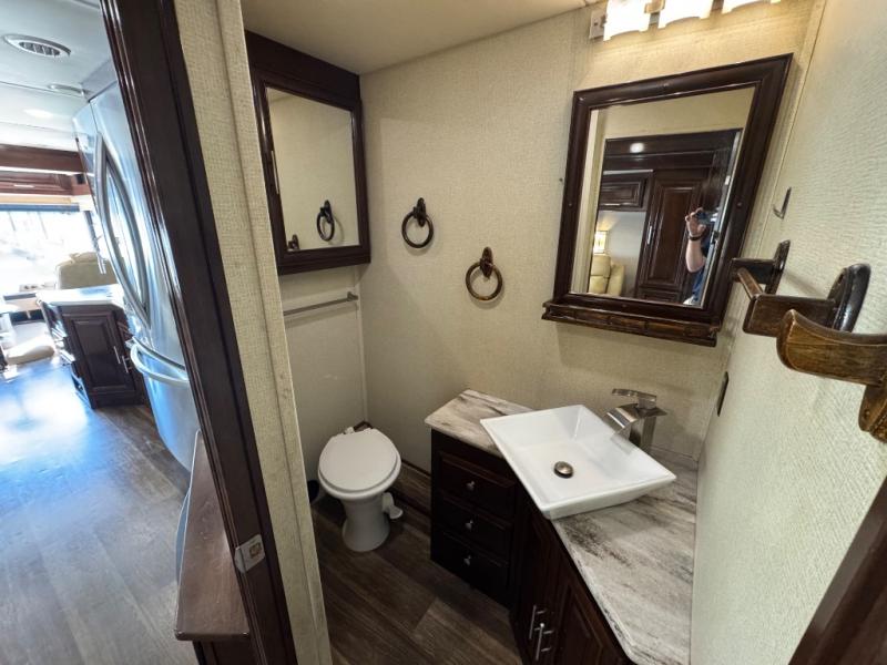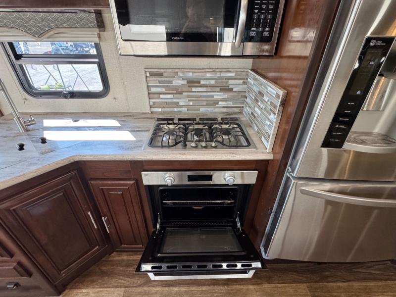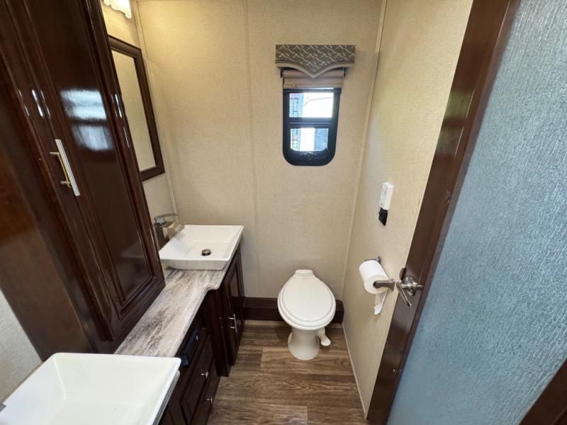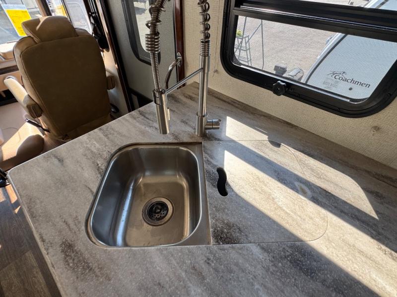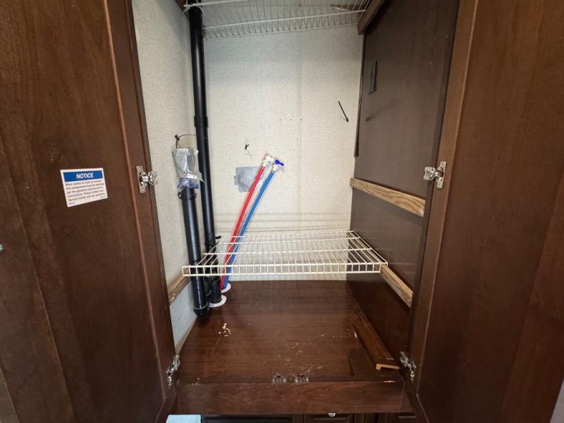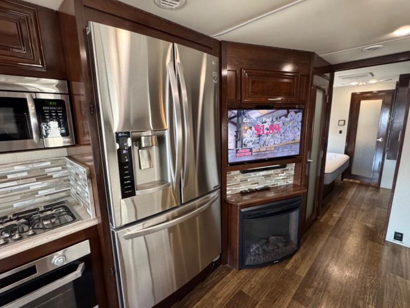 Step inside this Georgetown XL Class A gas motorhome to find comfort and luxury with two slides, sleeping space for five, plus a bath and a half with a dual-sink vanity in the master bathroom! In the evening you can plan to have a fire in the fireplace and watch TV on the 40" LED TV while relaxing on the four-person theater seating. The kitchen has all of the amenities that you would find at home with the stainless steel residential refrigerator, three-burner range, and microwave. You will also find that this model has been prepped for an optional washer and dryer so that you can keep up with your laundry while you are away from home.