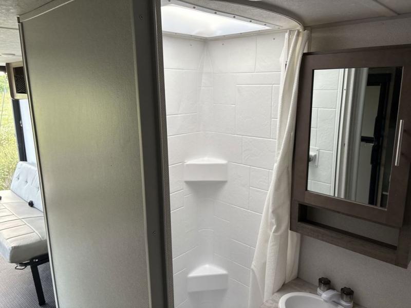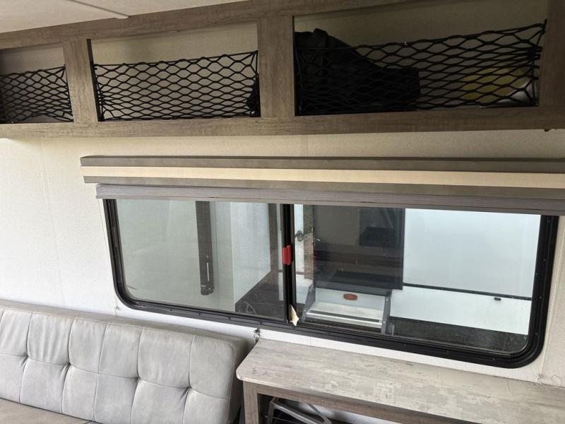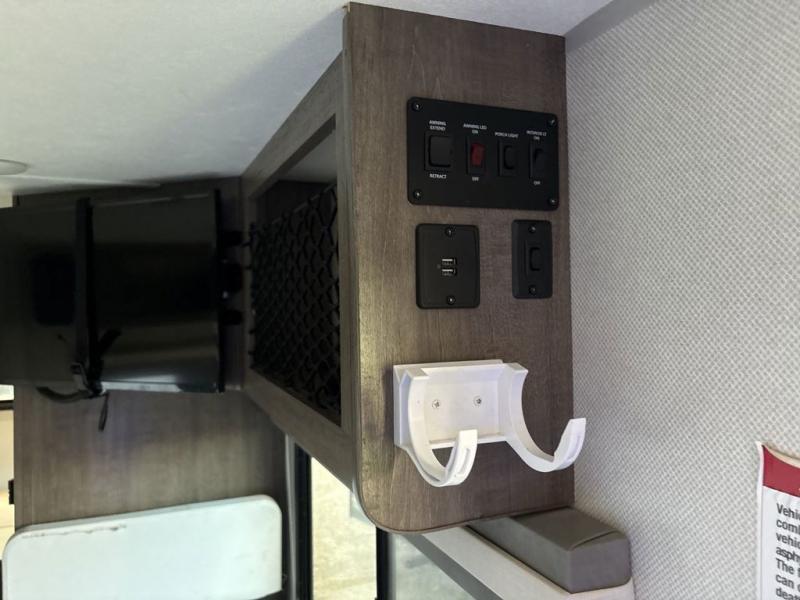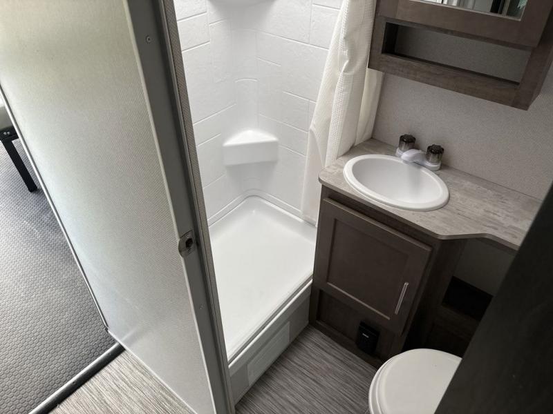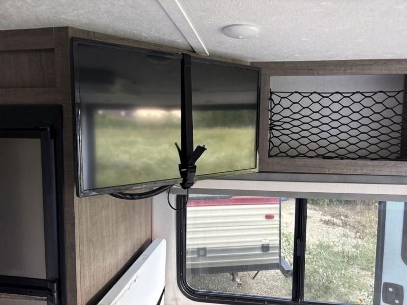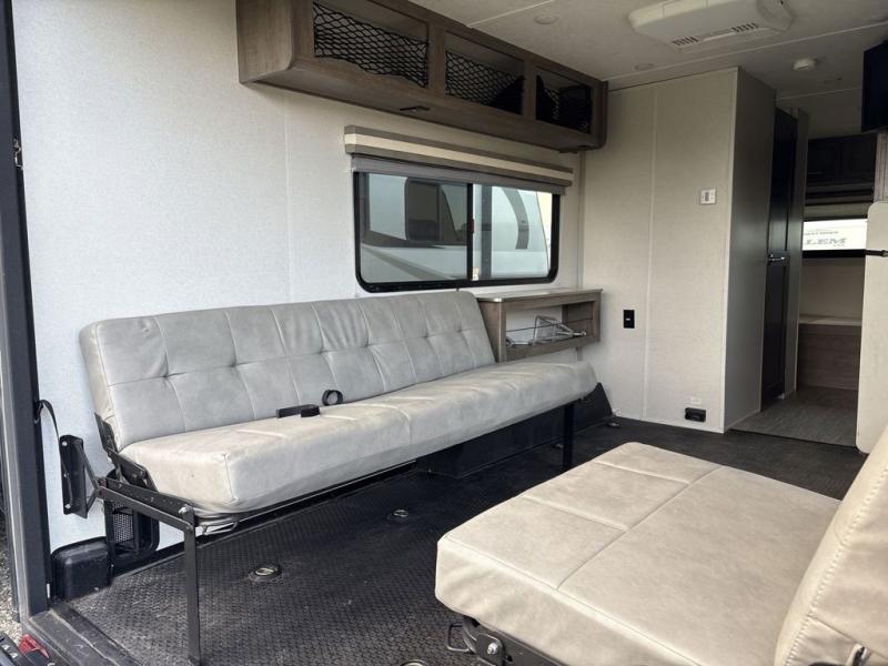 Looking for off-road fun and versatility in your next travel trailer? This toy hauler offers space for your ATV or motorcycles, plus comfortable living accommodations away from the outside elements. You can easily load your toys and gear using the rear ramp door, and you will find plenty of storage space throughout for your food in the pantry and refrigerator, clothing in the wardrobe, and more! When you are tired, you can get cleaned up in the full bathroom before falling asleep on the queen bed up front. There is a fold-up sofa for one more person if you need extra sleeping space, plus options to choose from to add more features. It's time to load up for adventure!