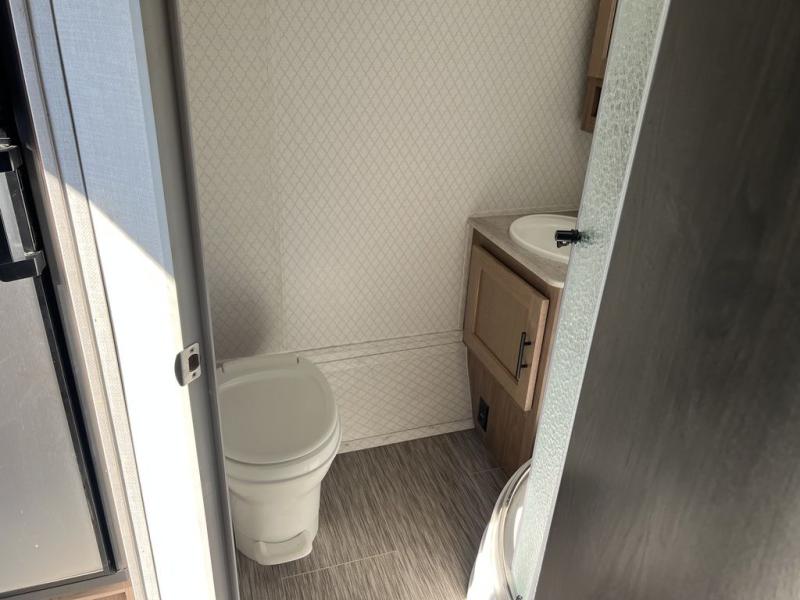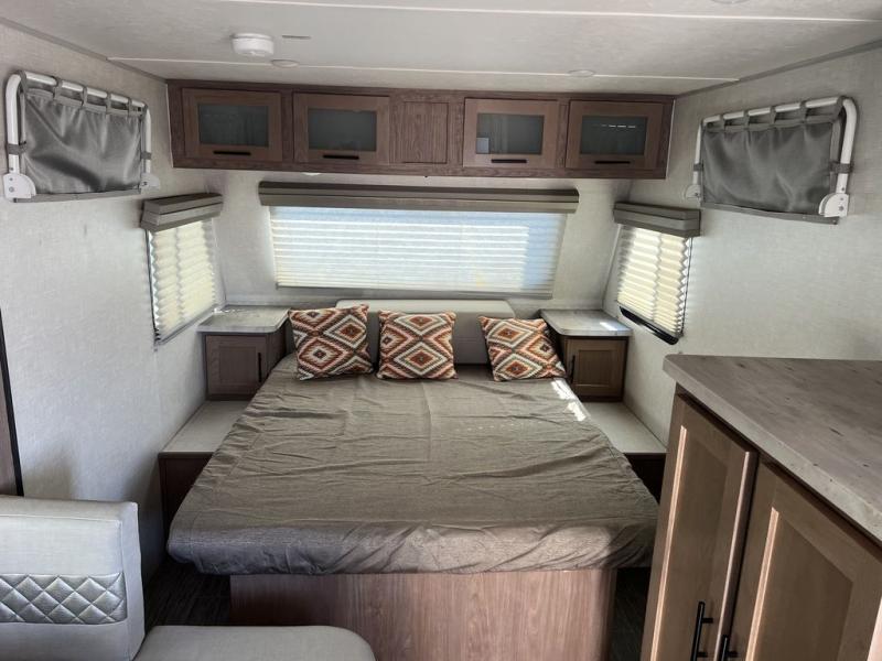 Coming in just under 5,000 lbs., this No Boundaries model has just what you need for any adventure you happen upon! You will appreciate the rear corner full bath in this unit that offers a radius shower, a toilet, and a sink. Just imagine relaxing, eating or sleeping on the chaise lounge with a removable ottoman and table, or taking a nap on the 60" x 80" queen size bed up front with super storage beneath. There is also a complete kitchen setup with a refrigerator, a single stainless steel sink, a two-burner cook-top with a glass cover, and a pantry for all of your non-perishable food items. You will also appreciate the featured USB charging station for all of your electronic charging needs. Take a step inside!
