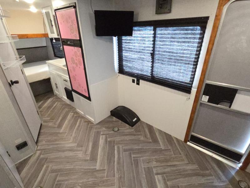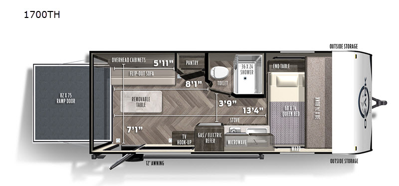 You will love being able to bring along your favorite toys and your favorite people in this Ozark toy hauler! The flip-out sofa, RV queen bed, and bunk bed give you enough space to sleep five people each night, and the 13' 4" garage gives you enough space to hold your golf carts, kayaks, or inner tubes. You will also be able to bring along ingredients to make all of your favorite meals with the pantry and 6 cubic foot double-door refrigerator.